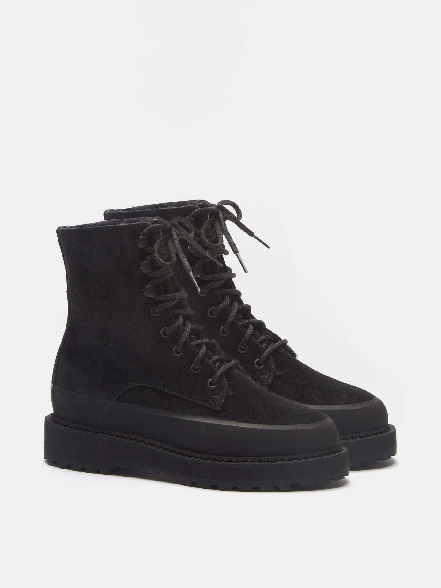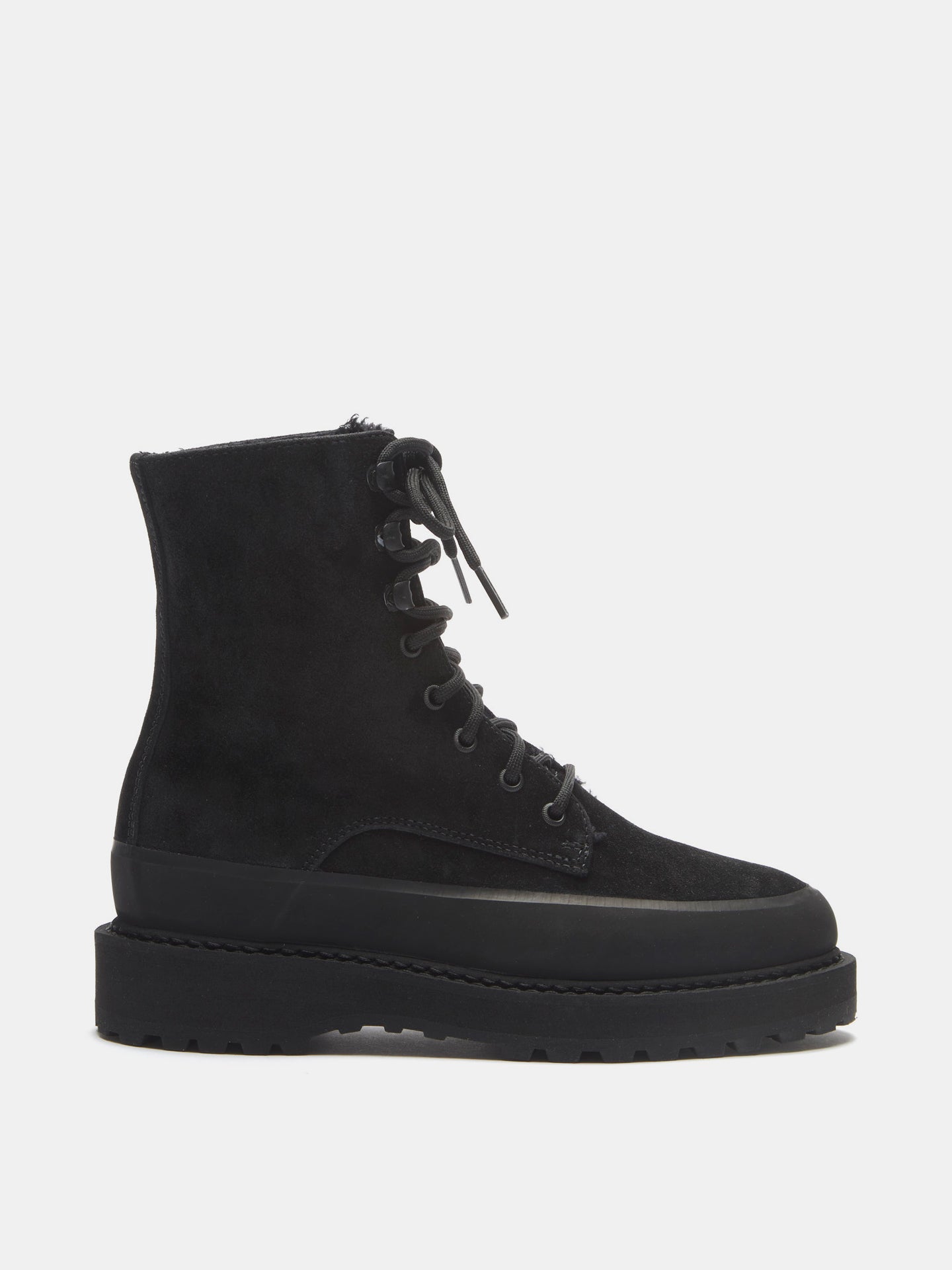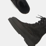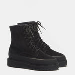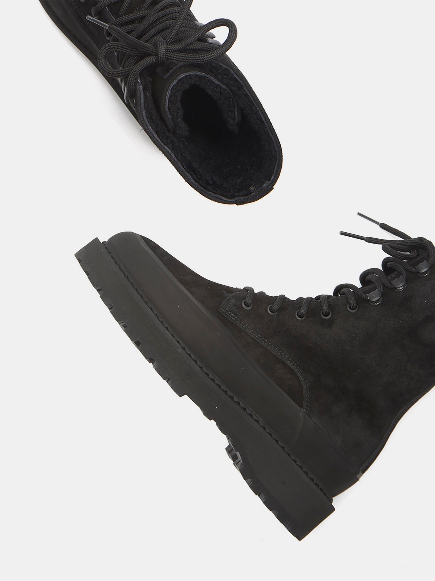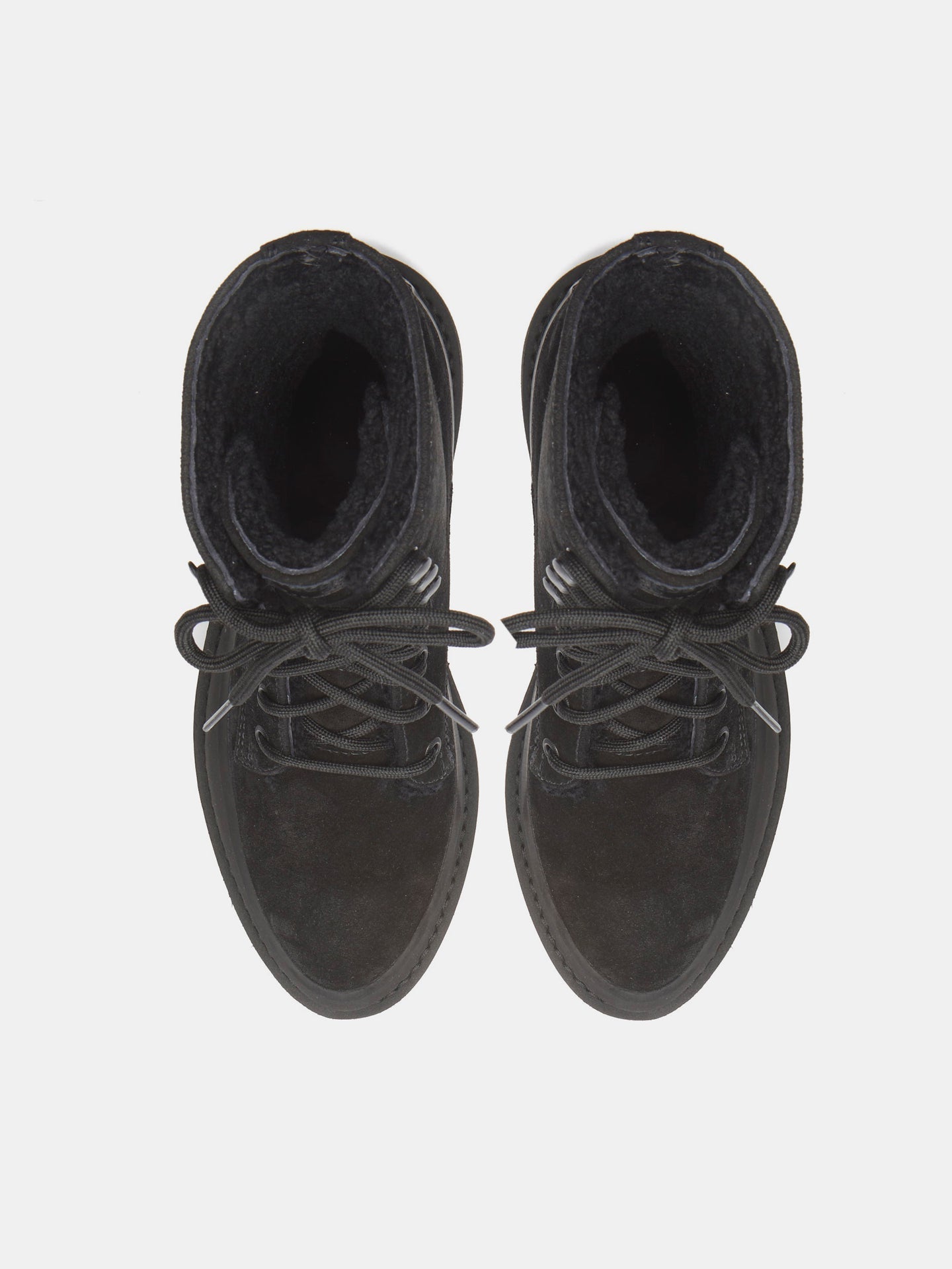 Dolomite Boot in black suede with lace up fastening and a cushioned calf shearling insole. Outer soles are anti slip rubber with a 25mm heel. Made in Italy.