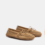 Driver Moccasin in embroidered taupe suede with a cushioned calf leather insole and rubber pebble sole. 8mm heel. Made in Italy.