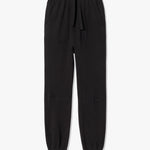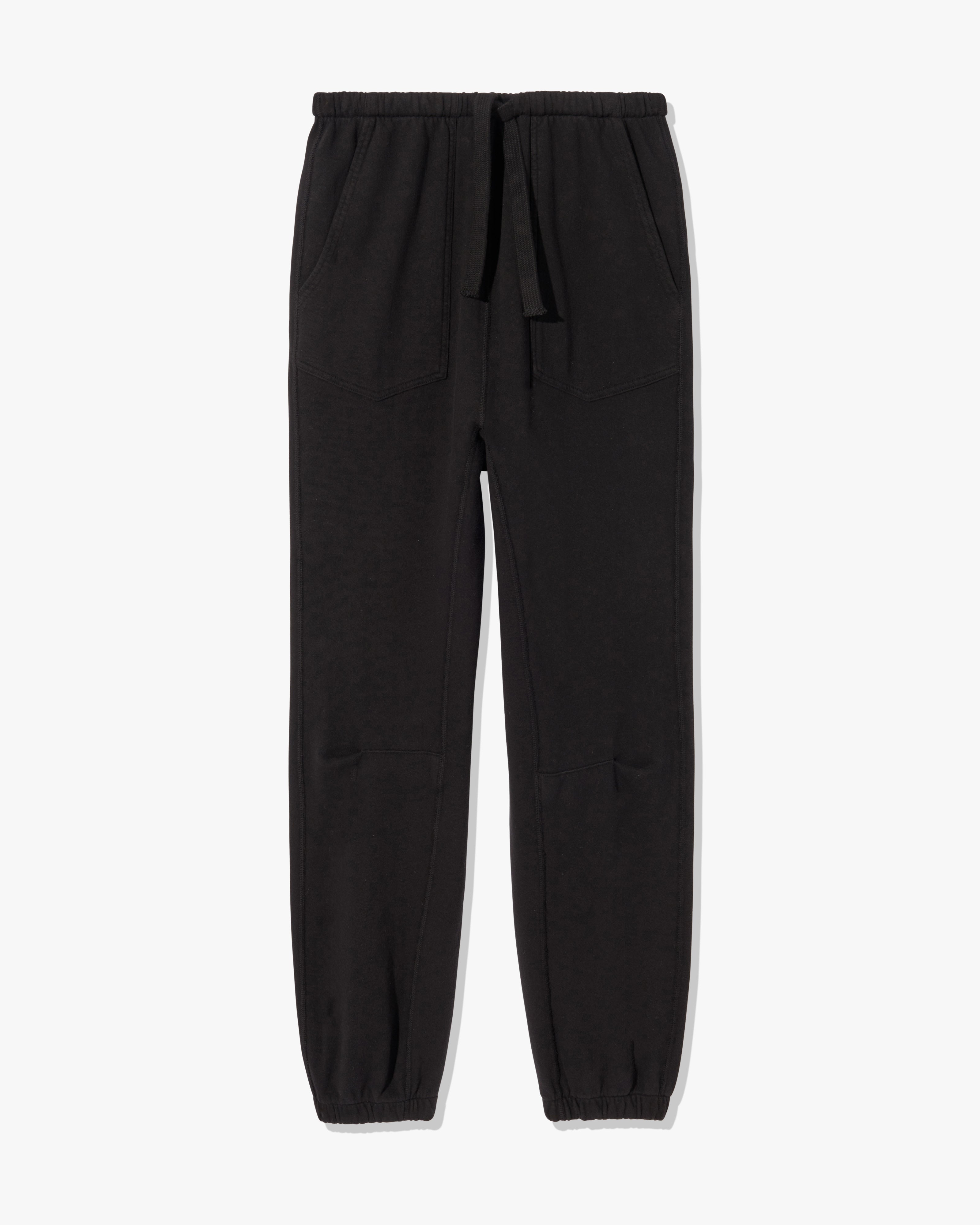 Mid-rise, relaxed sweatpant in American lightweight french terry cotton and polyester blend. Uniquely curved silhouette. Top-stitched patch pockets. Pleated seam detail at knees. Gusset at inseam. Dropped crotch. Elastic waistband with drawcord.