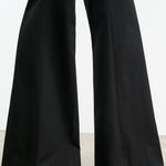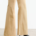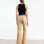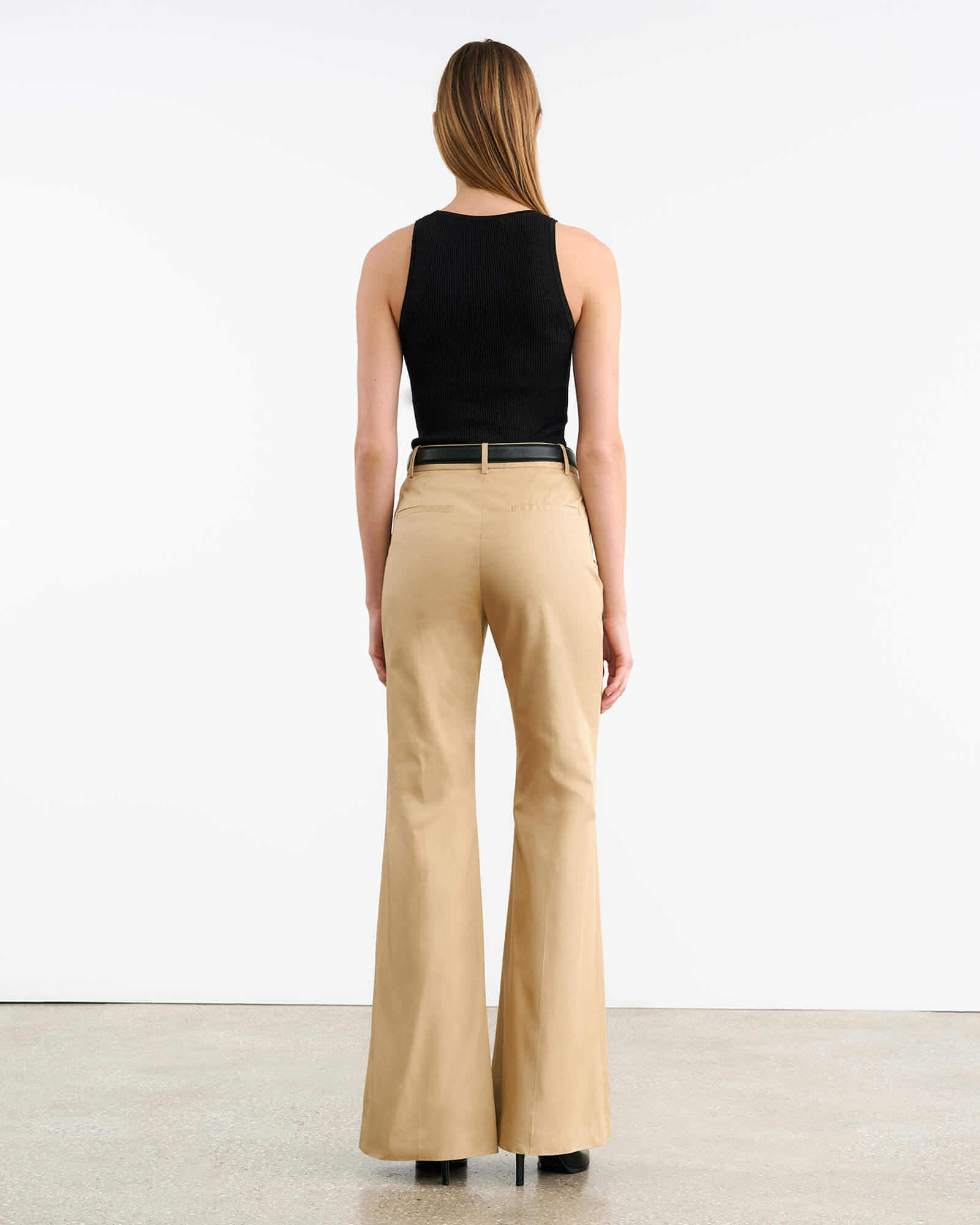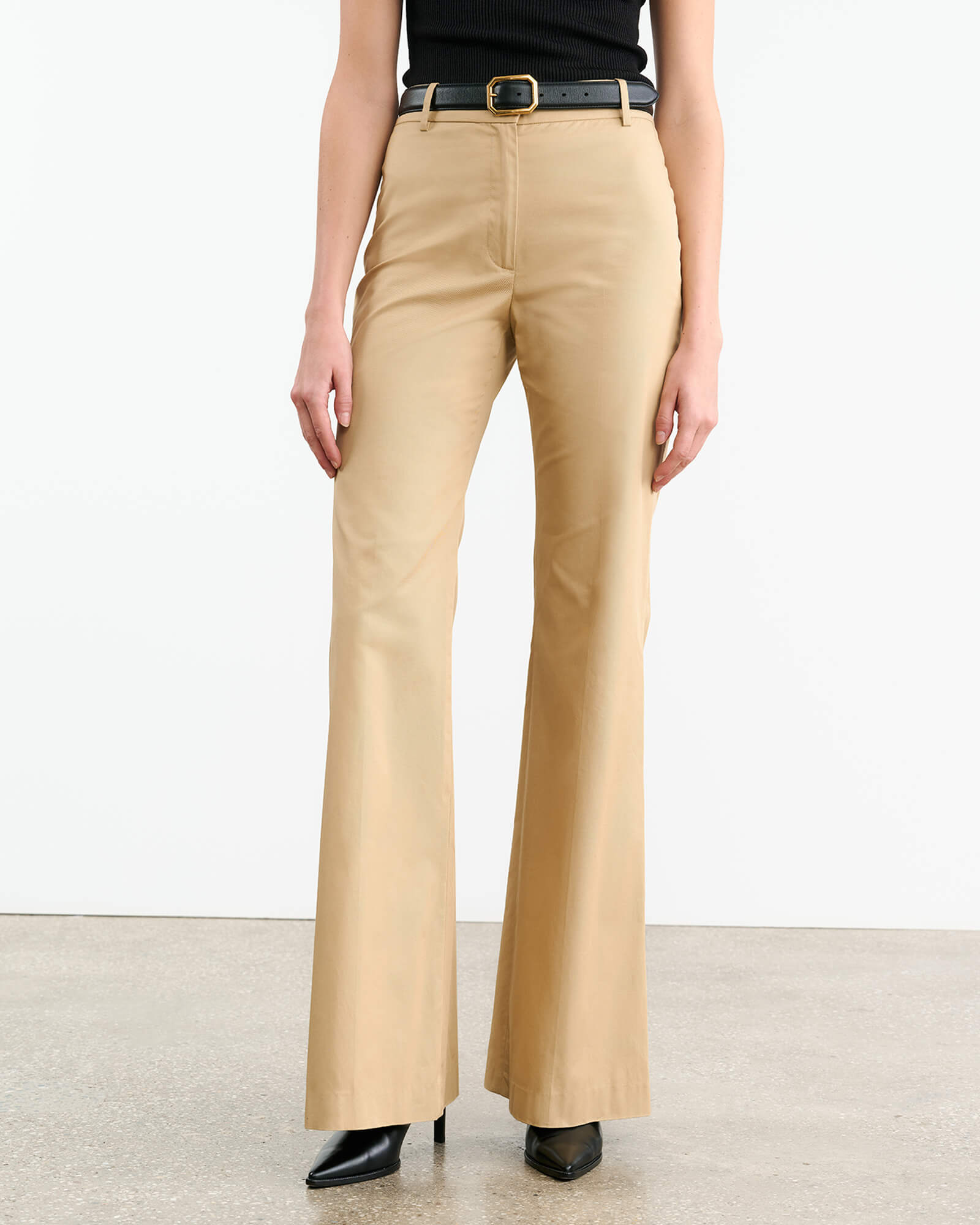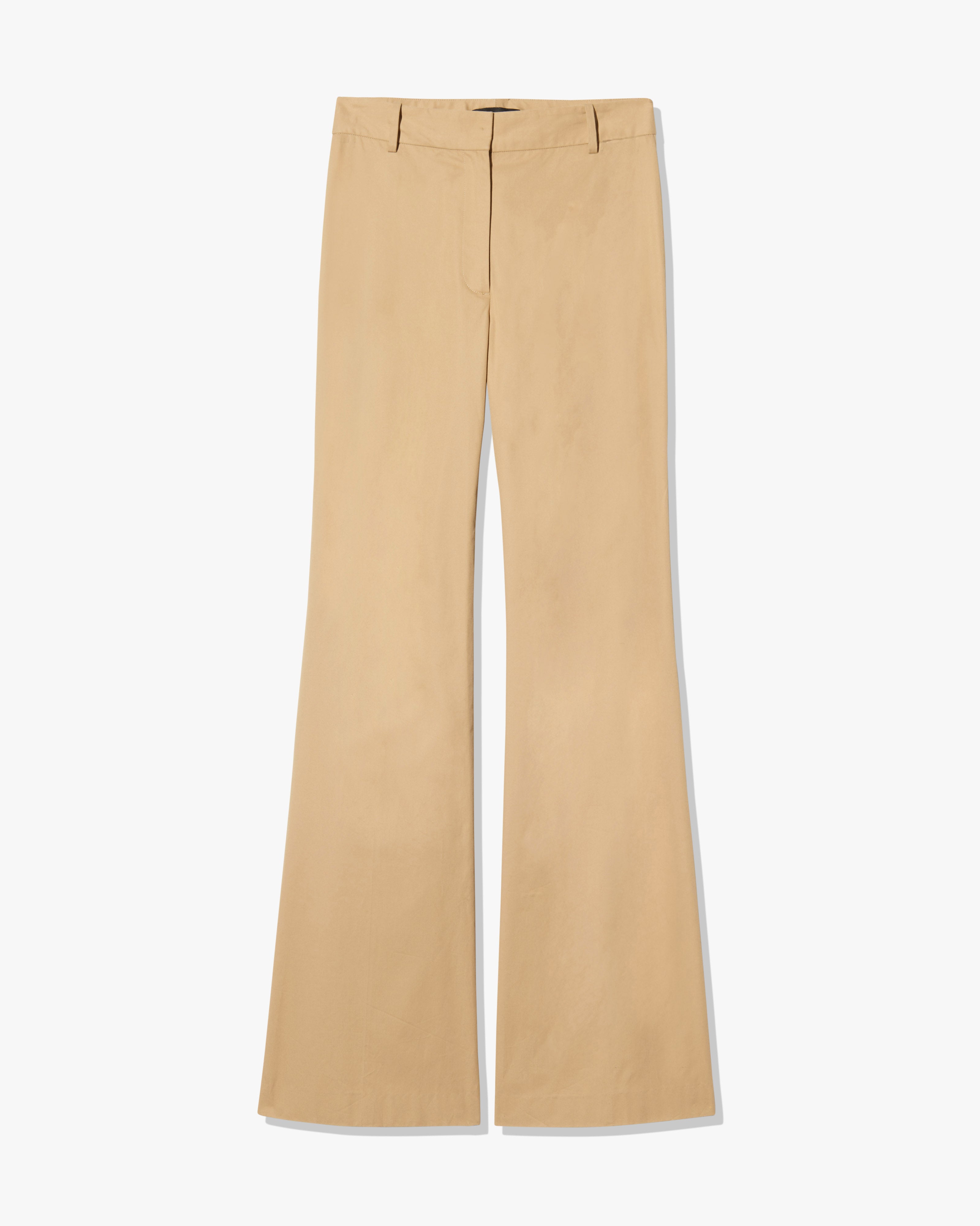 Flat front, high-rise flare leg trouser in cotton. Fitted through hips. Zip fly. Hidden hook-and-bar closure. Hidden stay button closure. Belt loops. Back welt pockets.