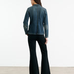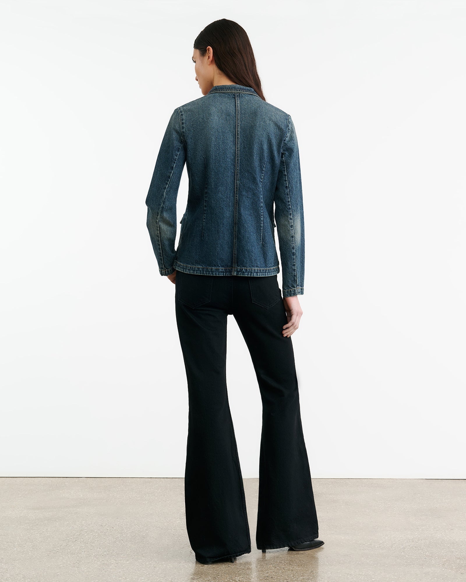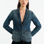 Shrunken fit collared blazer in Japanese denim. Pleated patch pockets. Logo horn buttons. Darts at back. Unlined.