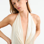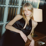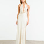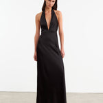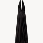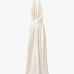Floor length halterneck gown in heavy silk charmeuse. Double layer. Waistband with darts. Zip closure.