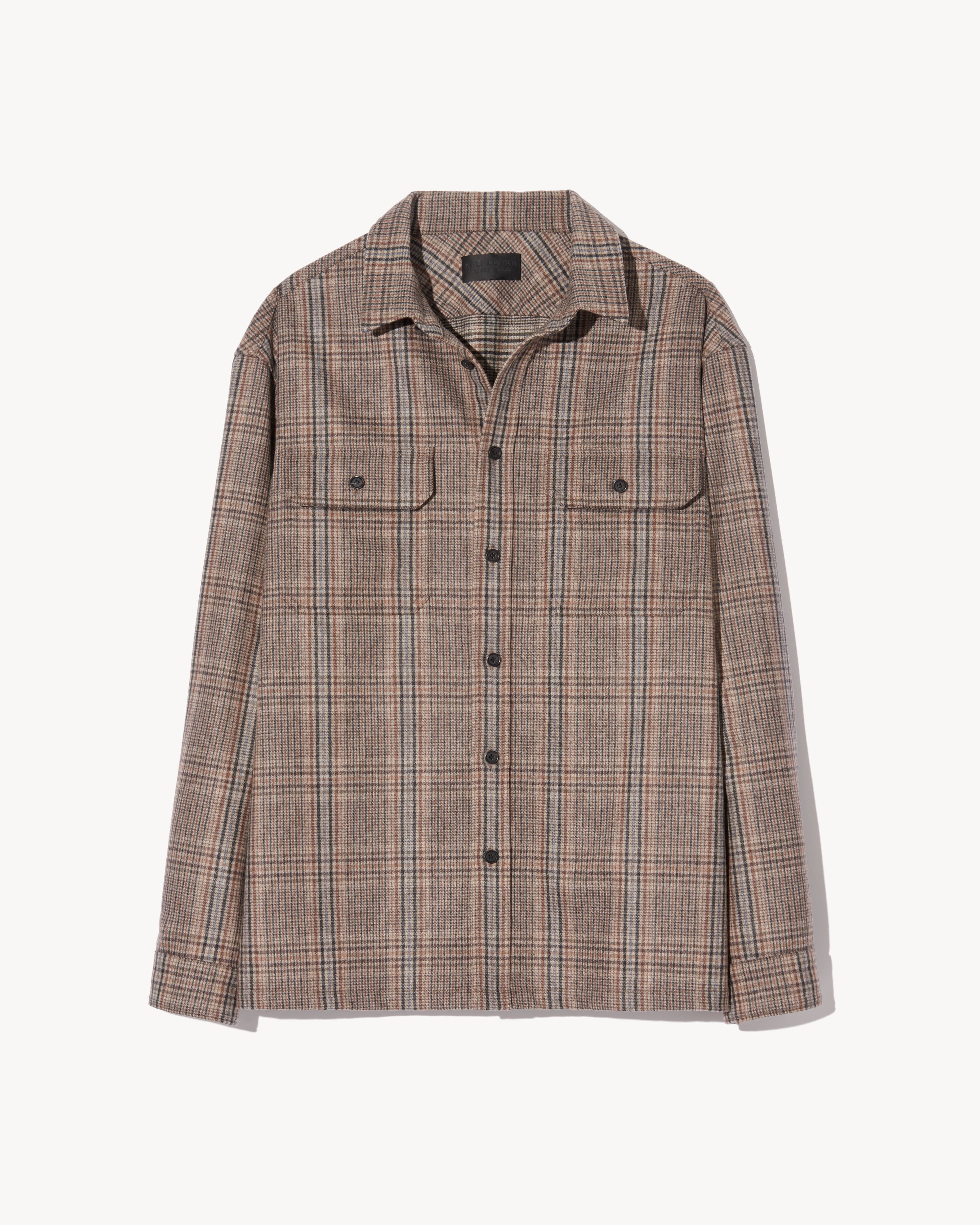 Relaxed boxy button up shirt in Italian wool cashmere blend. Patch pockets with flaps. Logo buttons. Buttons at center front, chest pockets and cuffs. Straight hem. Back yoke.