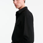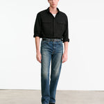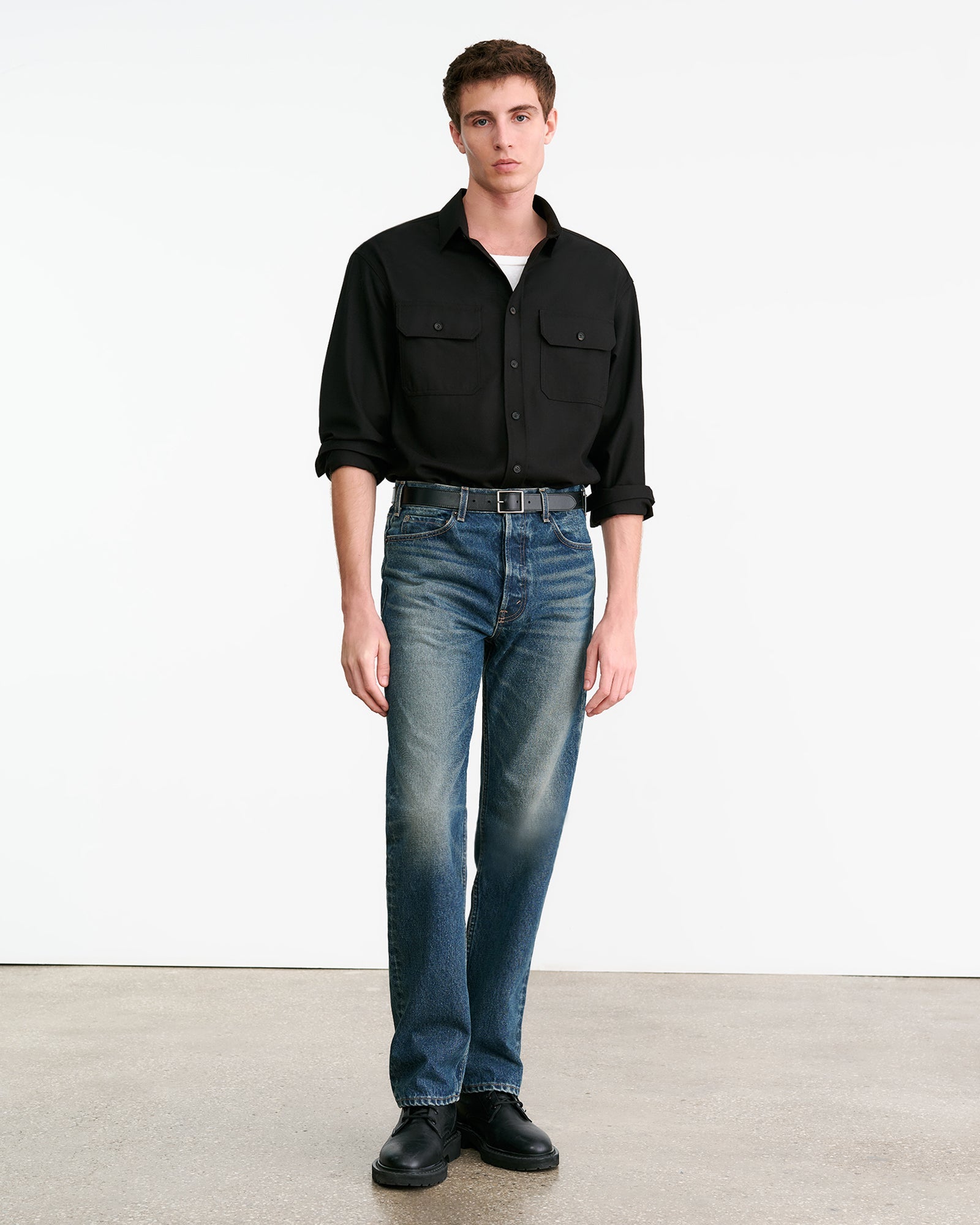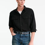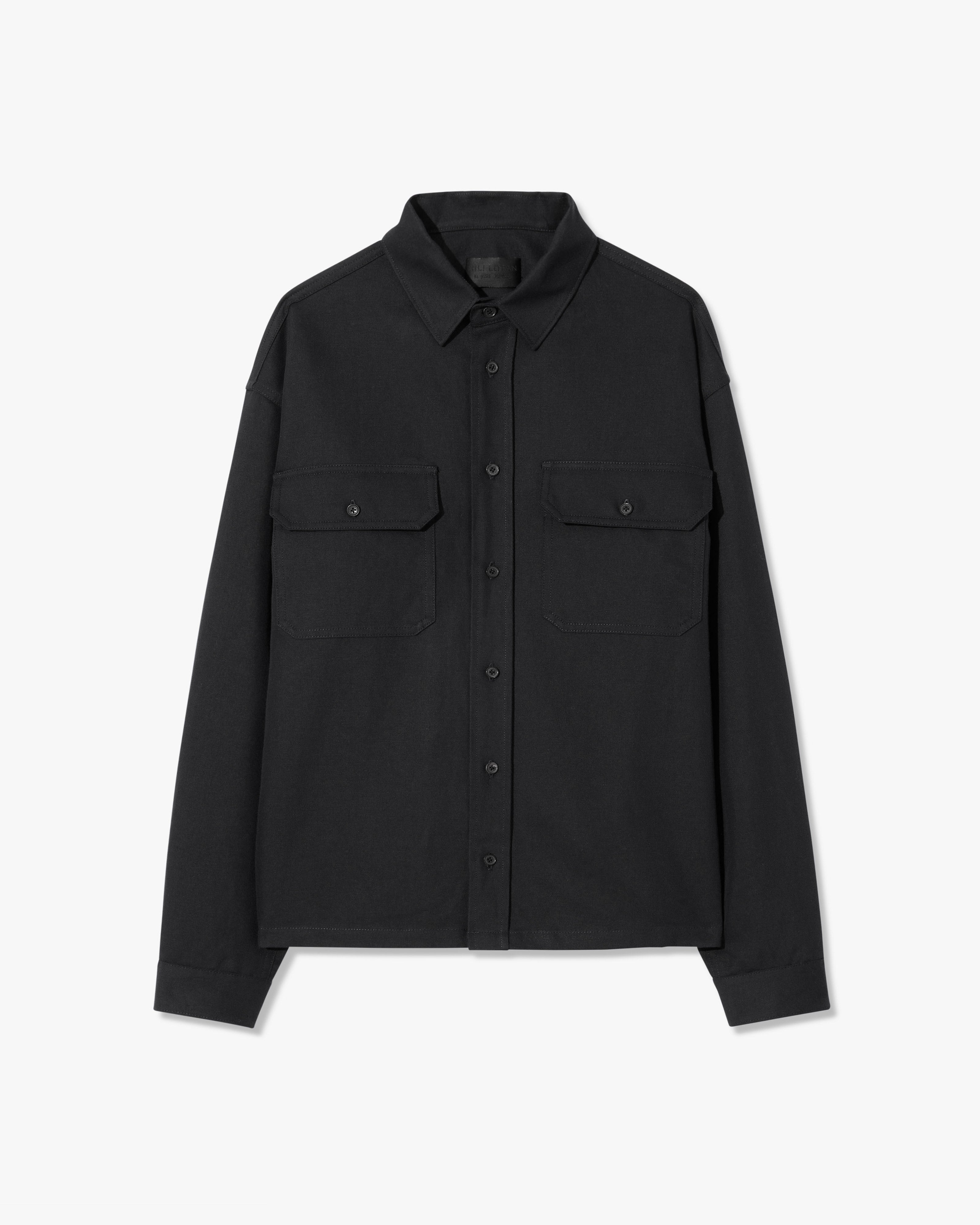 Relaxed boxy button up shirt. Patch pockets with flaps. Logo buttons. Buttons at center front, chest pockets and cuffs. Straight hem. Back yoke.