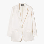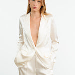 Single breasted blazer in heavy silk charmeuse. Logo horn buttons at front and cuff. Chest welt pocket. Pockets with flaps. Seam details. Back vent.