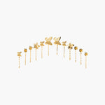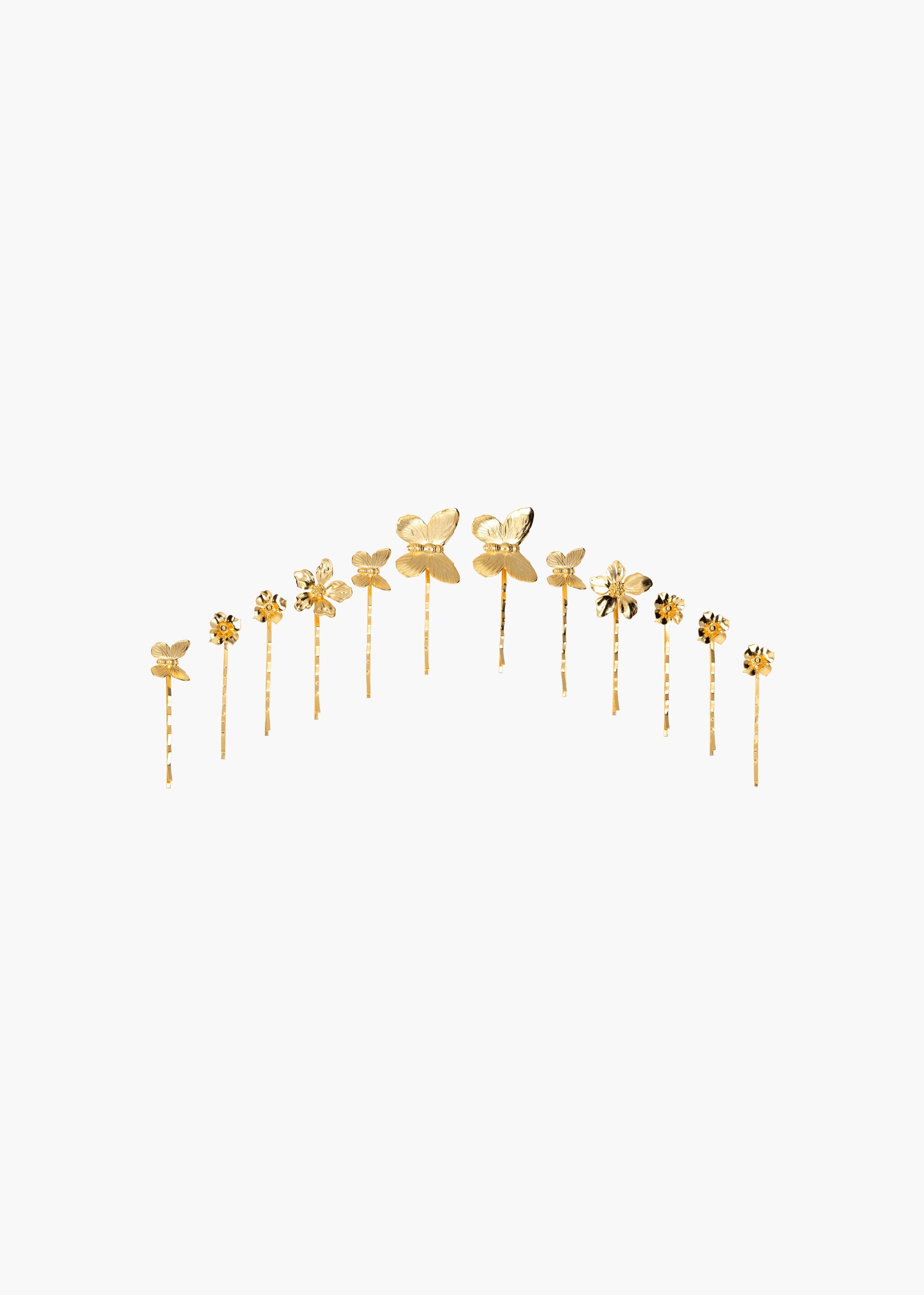 A set of twelve, the Farasha Bobby Pin Set features butterflies and an array of flowers, which together form an idyllic garden scene, all plated with 18-karat gold. The pins can be left exposed, or tucked in the hair to show only the butterflies and flowers. This set can be worn in smaller groups, or scattered en masse and mixed with the Alanis Bobby Pin Set, combining different flowers like a bouquet; add the coordinating Hilda Earrings to complete the set. Dimensions: Largest Pin: 1” in height, 1.25” width, 2" length. Smallest Pin: 0.5” height, 0.5” with, 2" length.
