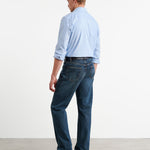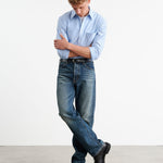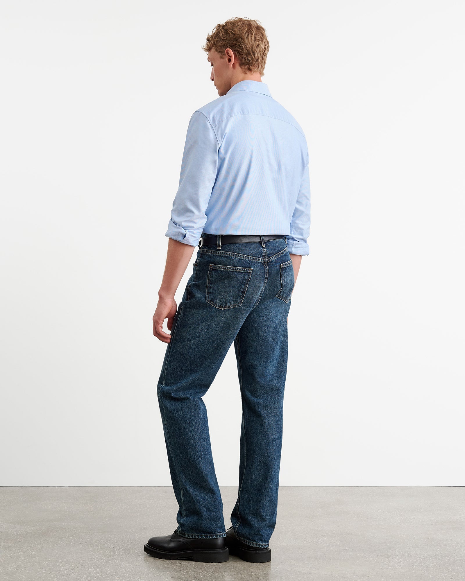 Relaxed fit Oxford button down shirt. Center front placket. Buttons at front and cuff. Single patch pocket. Structured collar emphasized by removable collar stays. Straight hem. Side slits. Box pleat at back yoke.