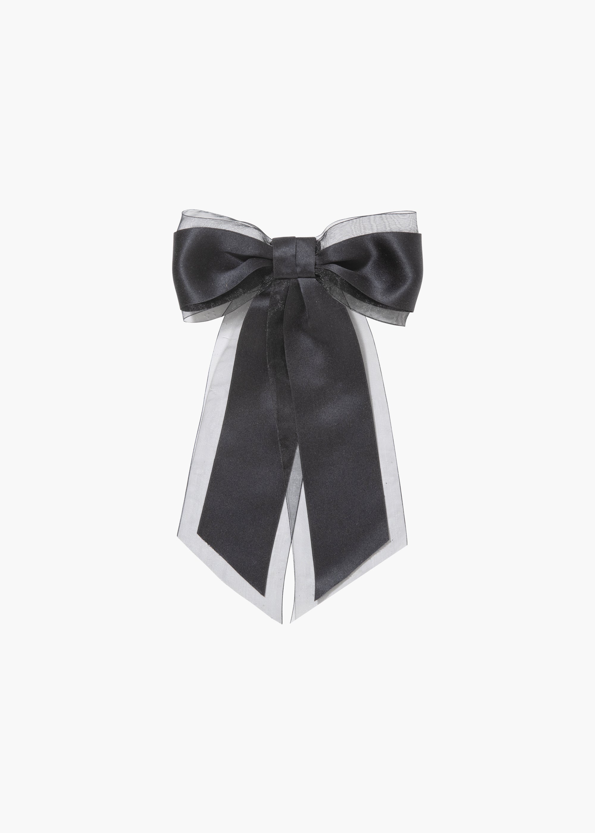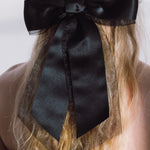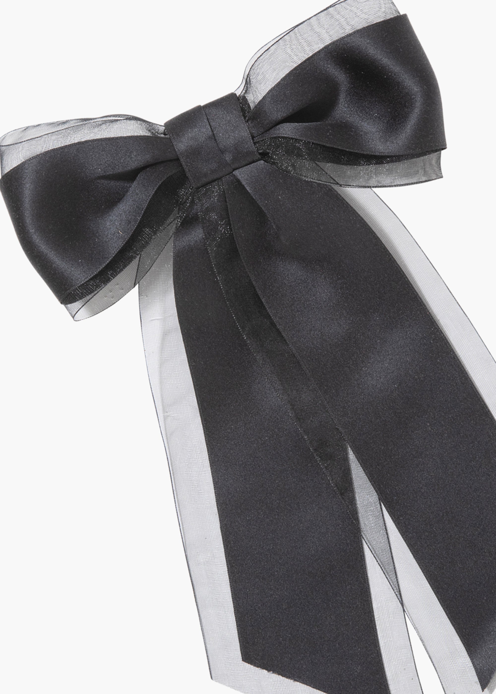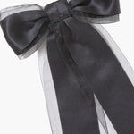 The Frankie Bow Barrette is an ethereal take on our quintessential satin bow. Diaphanous silk organza is layered with our classic silk satin ribbon, creating a bow with intriguing dimension. Made by hand in New York, this bow features an automatic French barrette closure, making it easy to wear in an endless number of hairstyles, in any type of hair. Dimensions: 6.5 inch width, 10 inch length