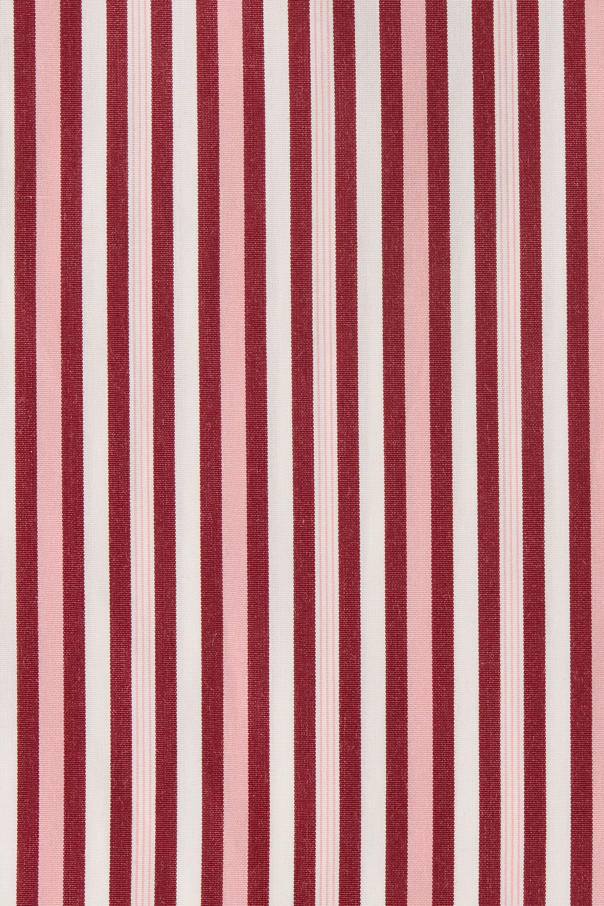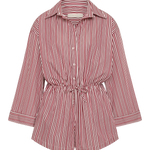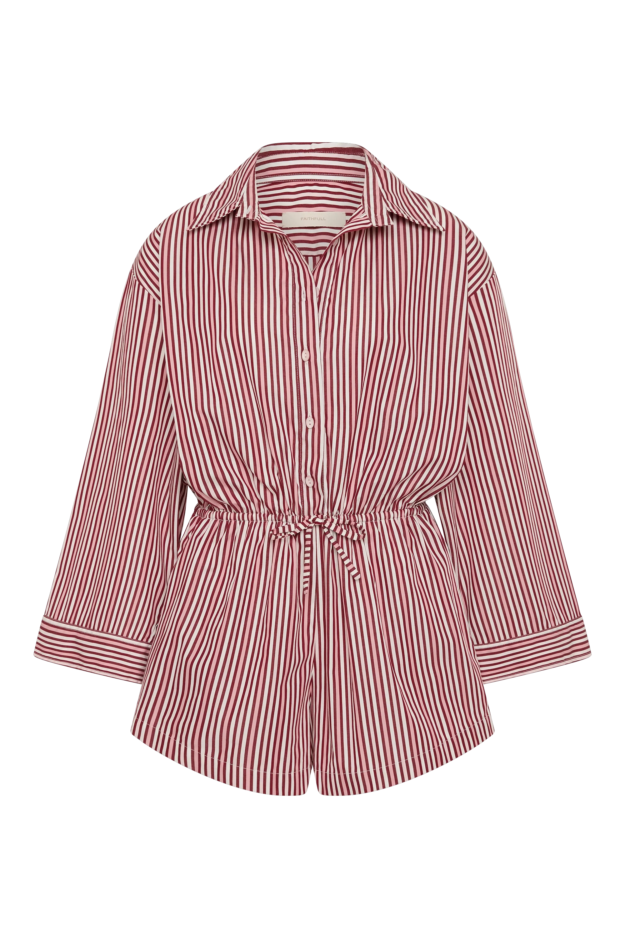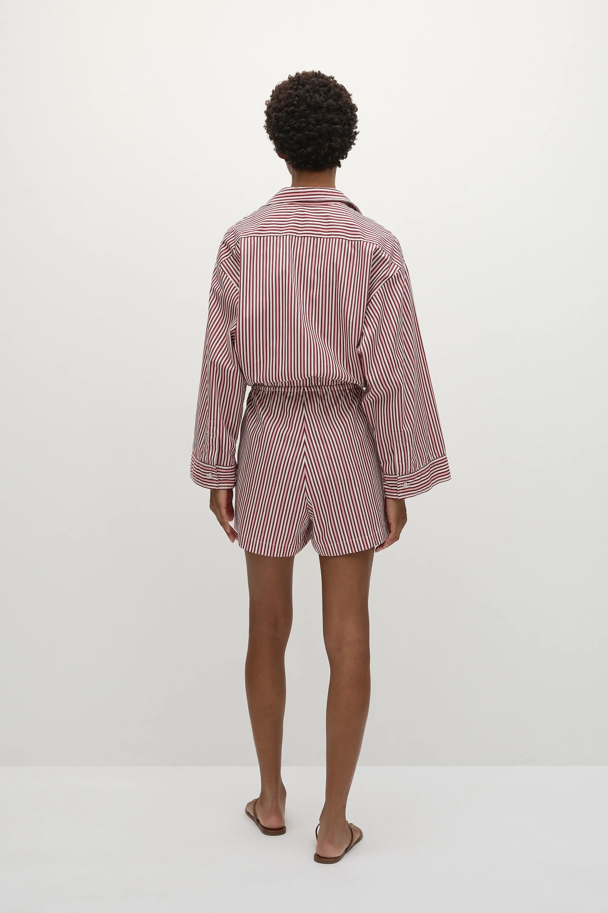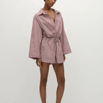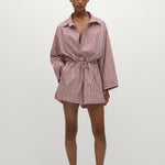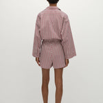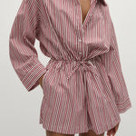 A relaxed playsuit with an oversized collar-style shirt with long flared sleeves and an elasticated waist, finished with a simple drawstring. From the waist they fall into a wide boyfriend-style short. Designed from a signature 100% cotton in a custom yarn-dyed vacation-inspired stripe, bringing together different tones of pinkin a custom red and white stripe, it is the perfect lightweight travel companion.