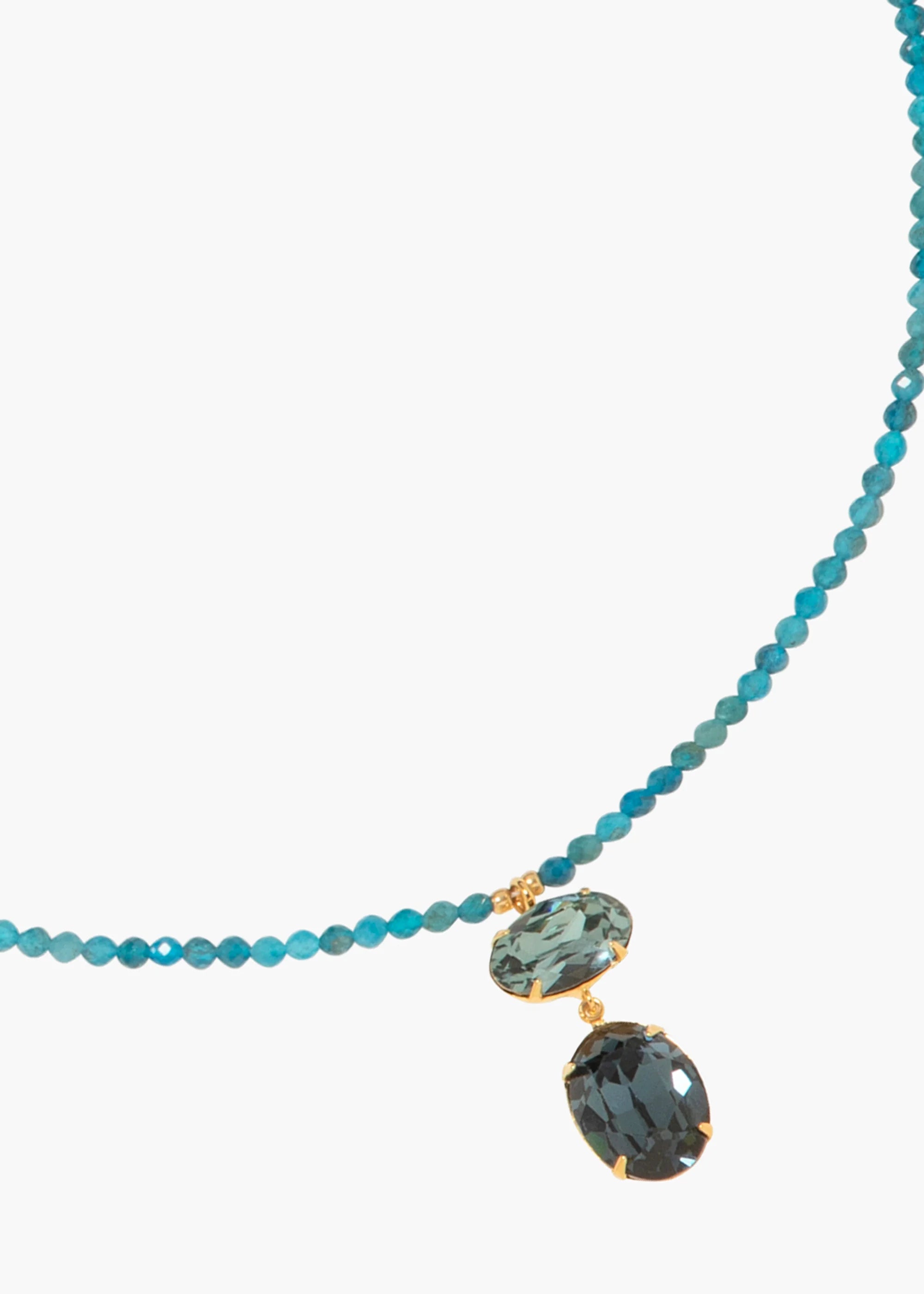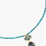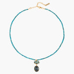The Freya Necklace is strung with natural semi-precious gemstones and finished with an Austrian crystal pendant, chosen to complement the stones' natural hue. Made by hand in New York, it's finished with an 18-karat gold-plated lobster clasp, with an extender chain to ensure the length hits perfectly with every neckline. The Freya Necklace can be paired with our matching Dara Earrings, or layered with other semi-precious necklaces in our collection. Dimensions: Pendant with jumpring 1.5""x0.5", 21" length