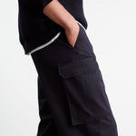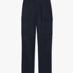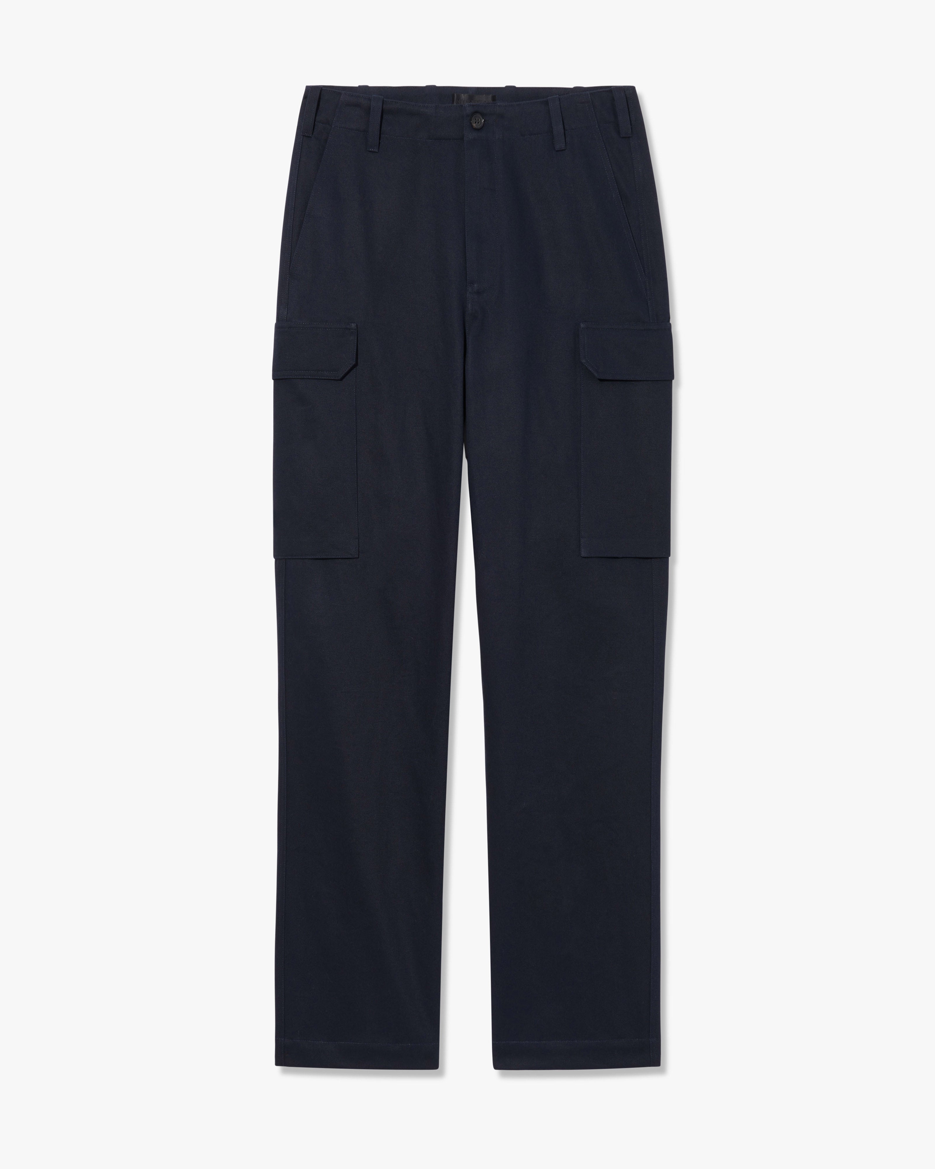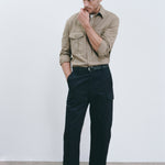 Flat front tailored relaxed leg cargo pant in cotton. Side slash pocket. Cargo pockets. Back welt pockets. Zip fly. Horn button closure. Belt loops.