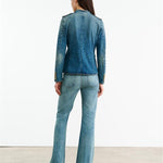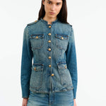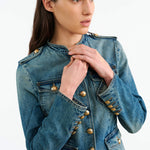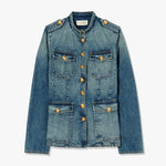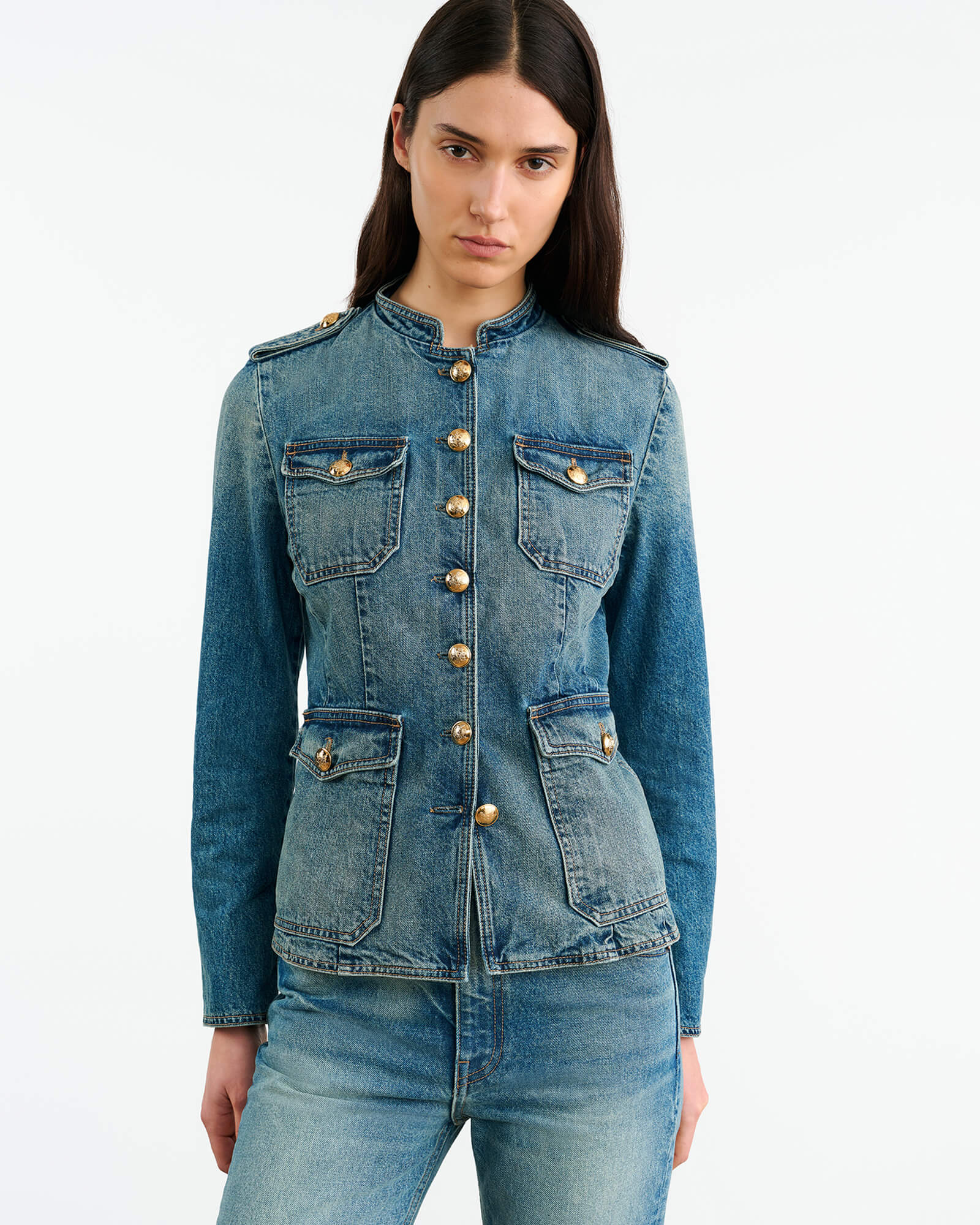 Slim fit utilitarian jacket in Japanese denim. Signature crest buttons in antique brass. Epaulettes. Seam details. Chest patch pockets with flaps. Patch pockets with flaps. Buttons at front, epaulettes and cuff. Unlined.