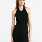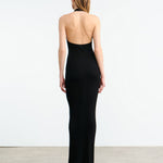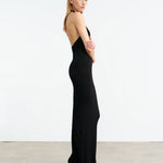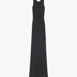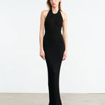 Full length halter dress in Italian viscose. Slim through top. Hook-and-eye clasp with grosgrain detail.