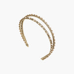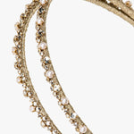 The festive Gina Headband features dual glistening strands, wrapped in metallic gold Japanese ribbon, serving as a base for an impressive array of embellishment. Delicate crystals and pearls are meticulously prong-set, creating streamers of sparkle through the hair. Whether worn with hair loose or pulled back, the flexible headband base means this is a comfortable celebration-worthy look.