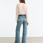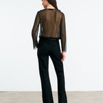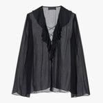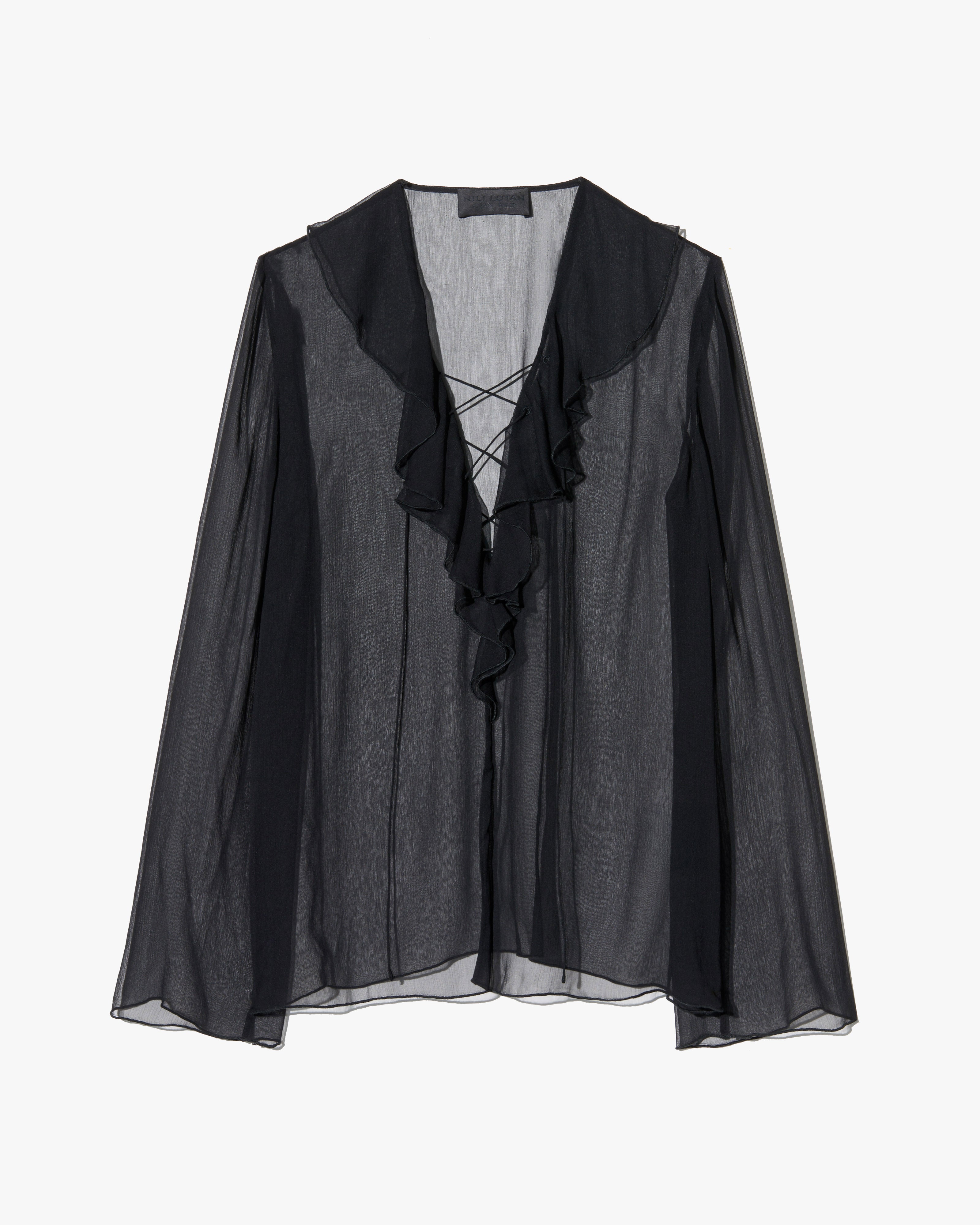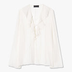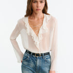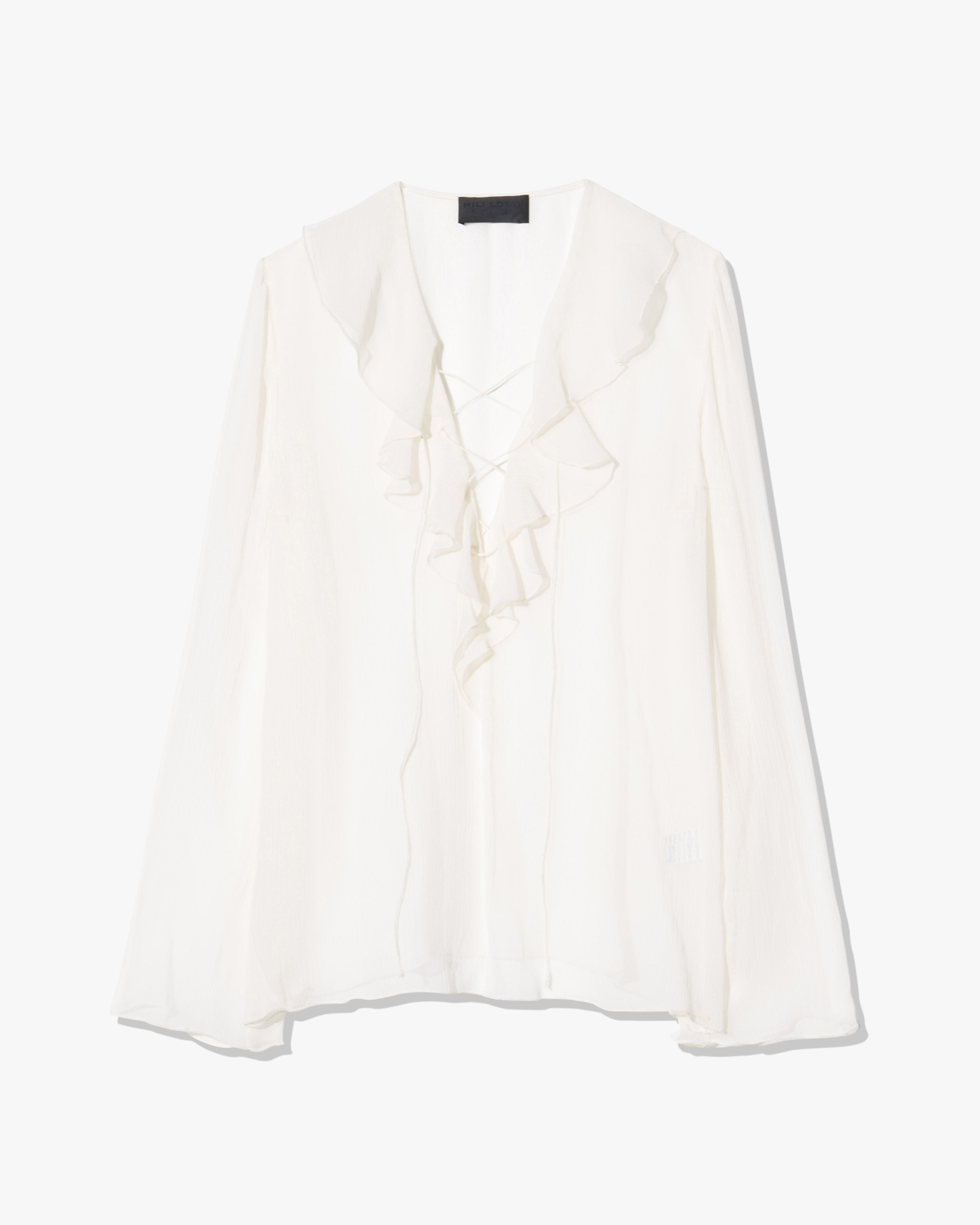 Slim pullover lace up blouse in crinkled silk chiffon. Thread loops for lace up detail. Ruffle detail at collar.