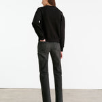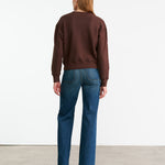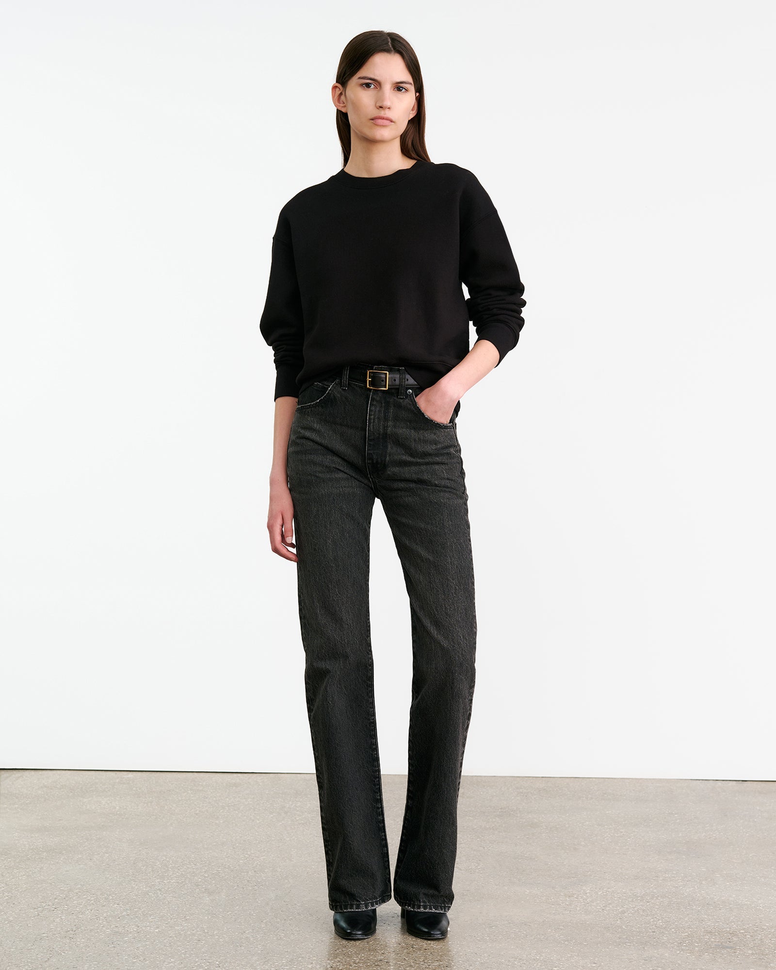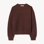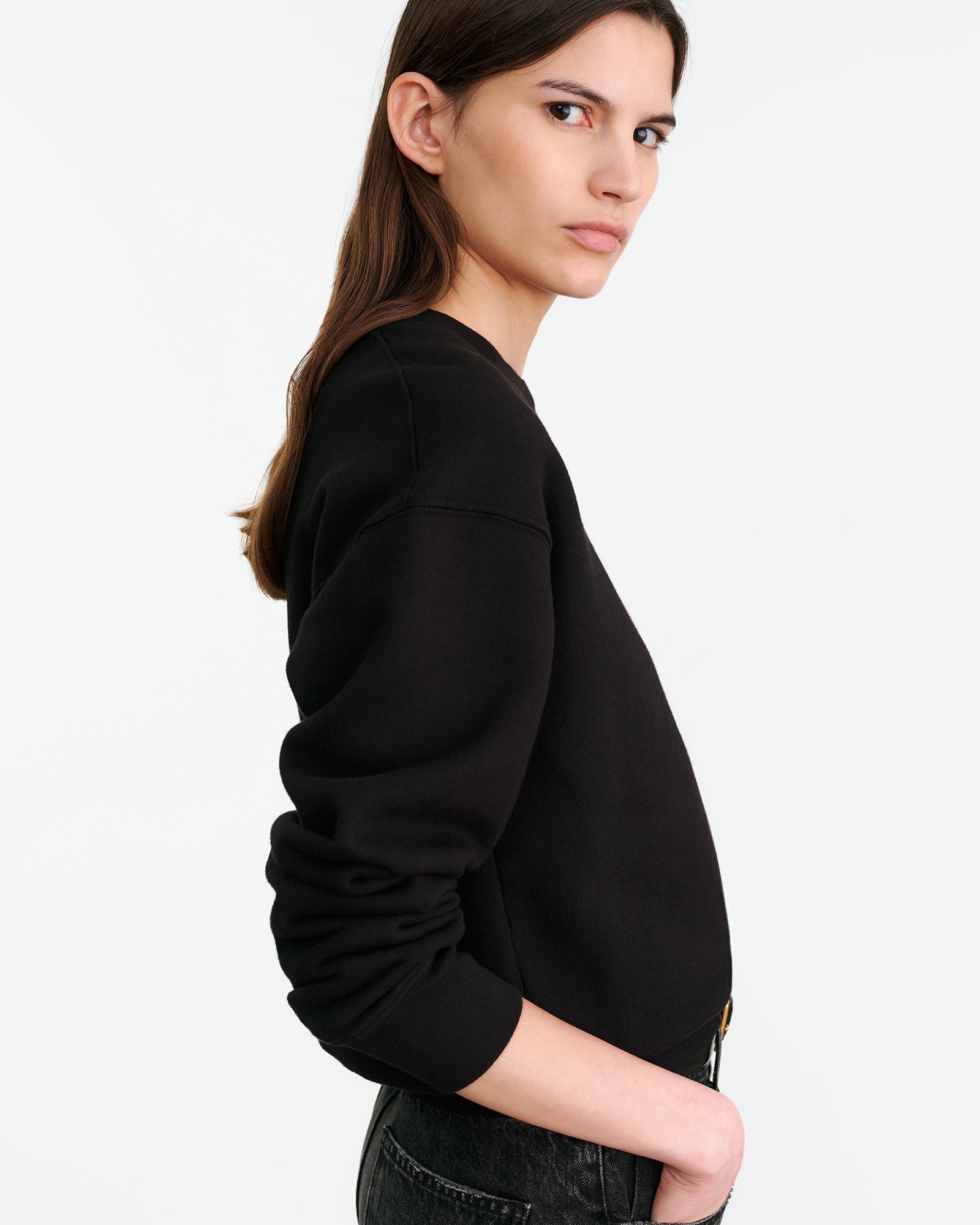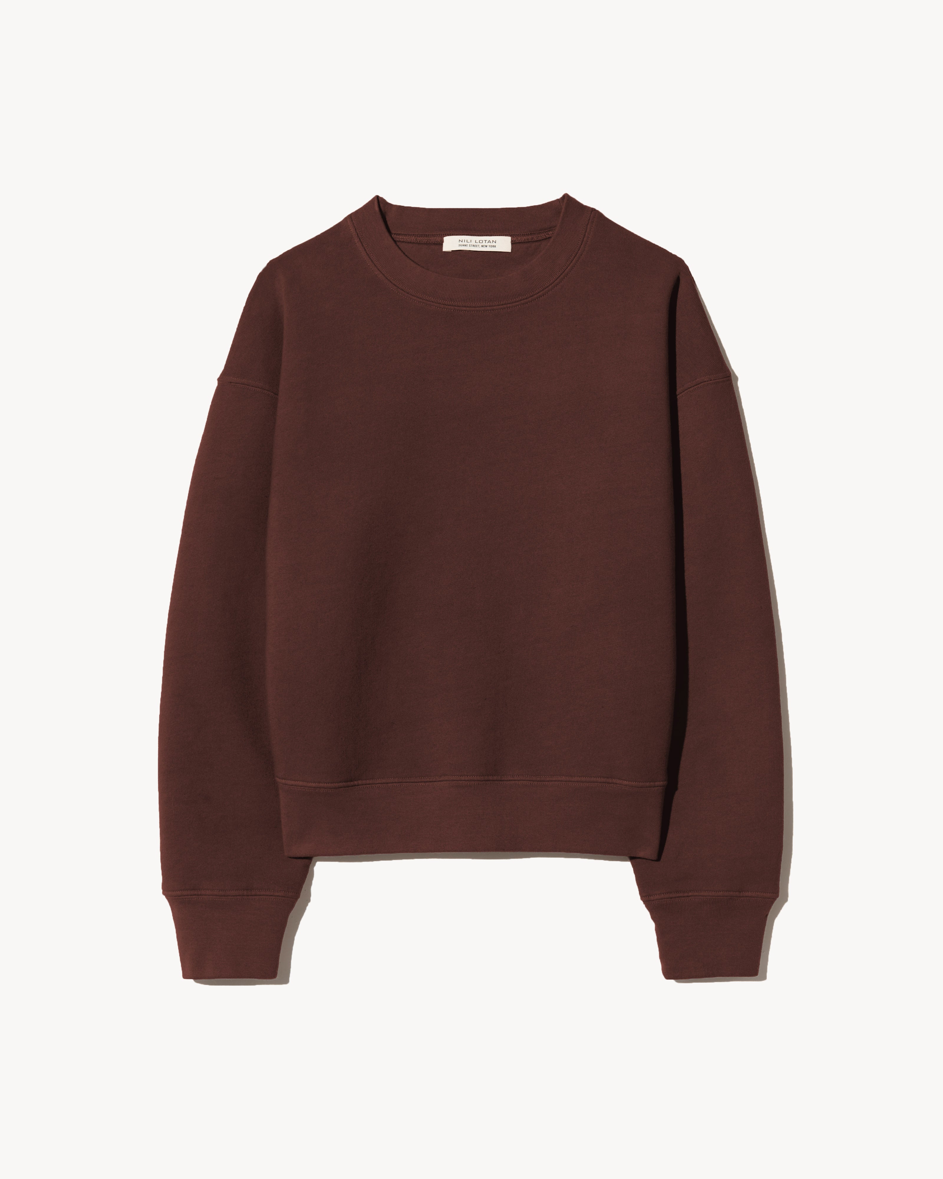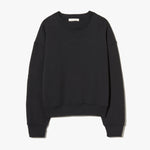 Long sleeve crewneck sweatshirt. Boxy fit. Short length. Regular length sleeve. Rib combo at sleeve, hem, and neck. Cover stitch detail at sleeve, hem, and neck.