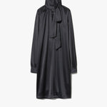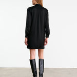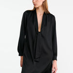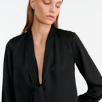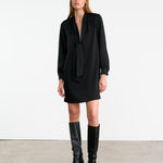 Short mini dress. Plunging open slit with center front neck drop and tie neck. Buttons at cuffs with ruching and keyhole openings at sleeves. Back yoke detail with shirring. Straight hem.