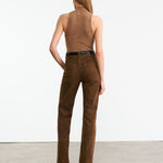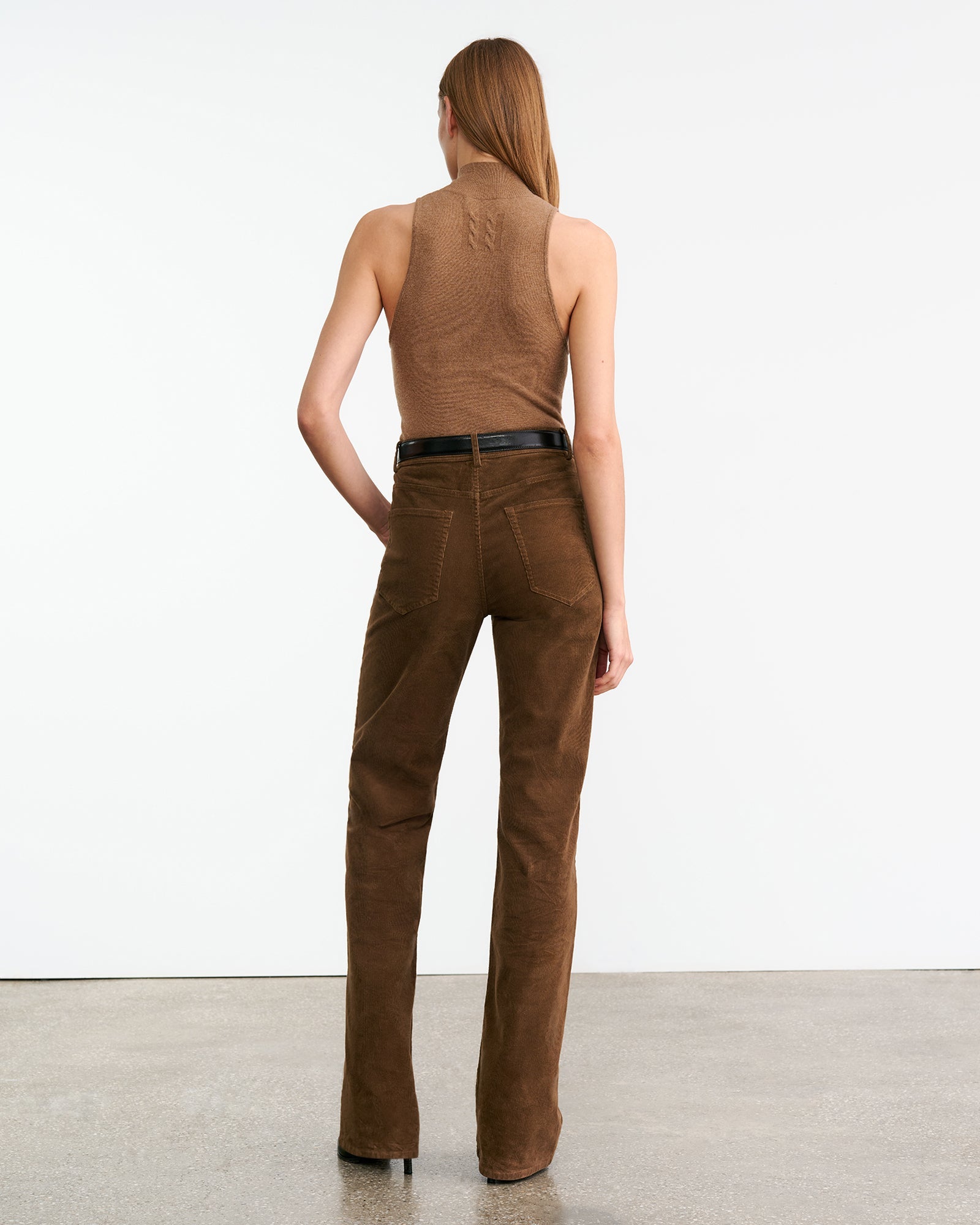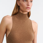 Sleeveless high neck sweater. Narrow shoulder. Pull over style. Neck designed to be worn up. Light weight jersey stitch. Slim fit. 1x1 rib, hem, and neck, tubular detail at armhole. Signature center back cable knit detail.