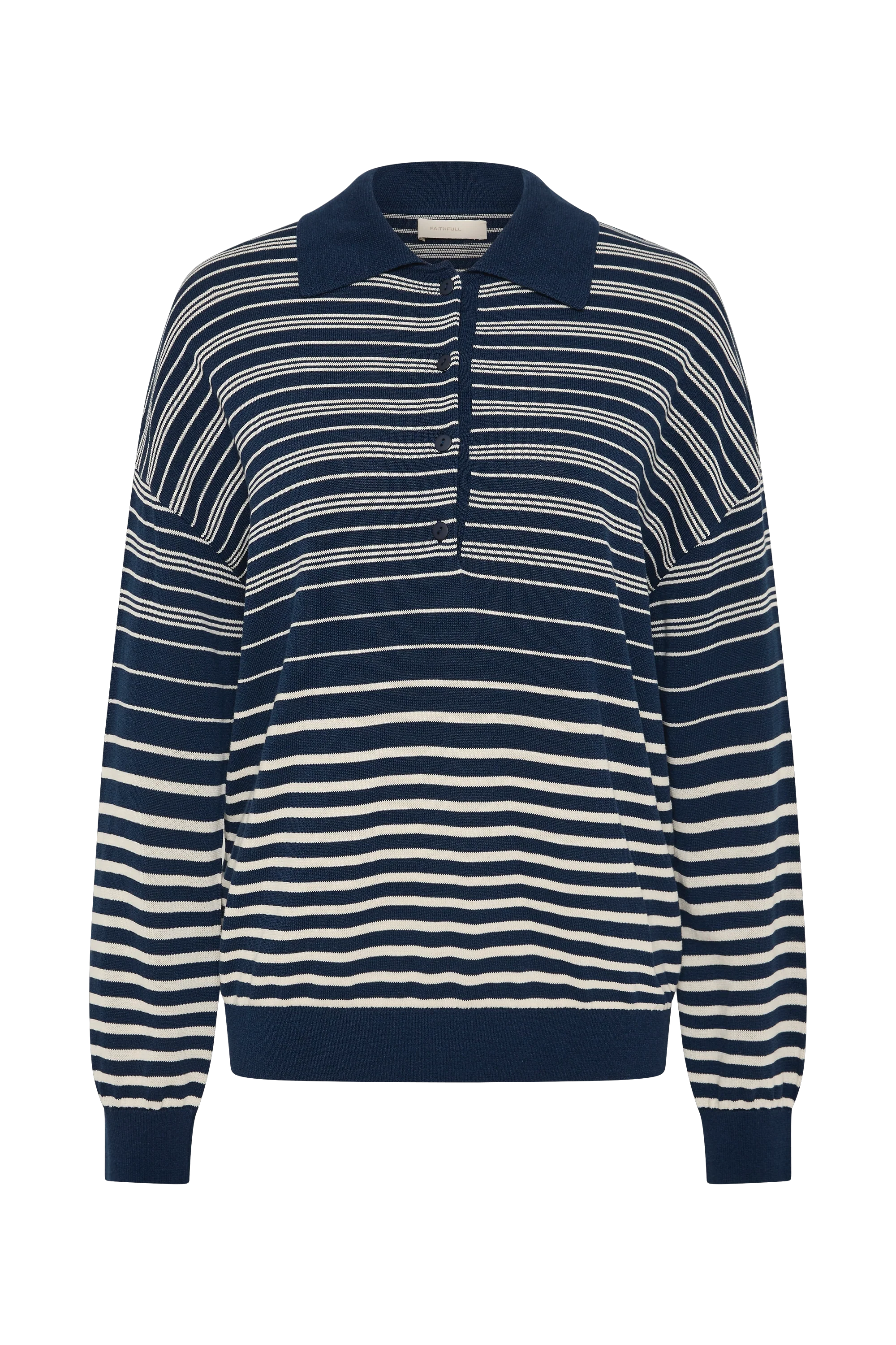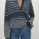 A slightly oversized polo-style jumper with a V-collar neckline, finished with buttons down the front. It offers an intentionally relaxed fit that you can tuck in your FAITHFULL denim. Designed from a unique blend of cotton and viscose in a Scandinavian-inspired navy and cream stripe.