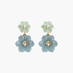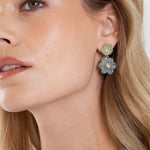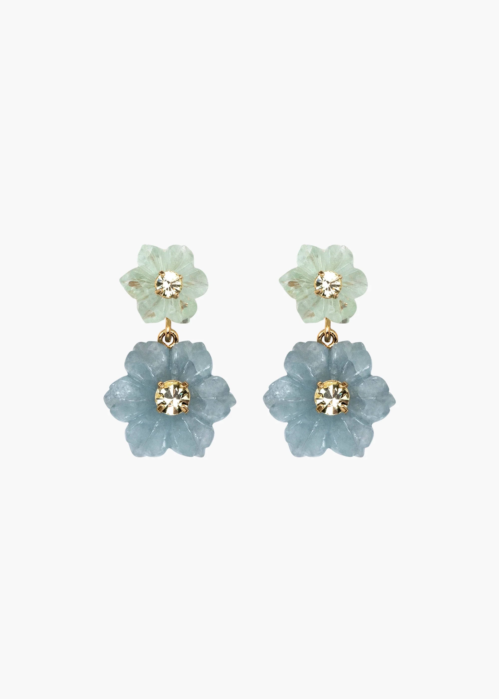 The Hattie Earrings blur the line between fine and costume jewelry, combining semi-precious stones with Austrian crystal details. The flowers are hand-carved of chalcedony, a natural gemstone found inside geodes, known for its calming energy. Made by hand in New York, each flower is set with a contrasting crystal center.