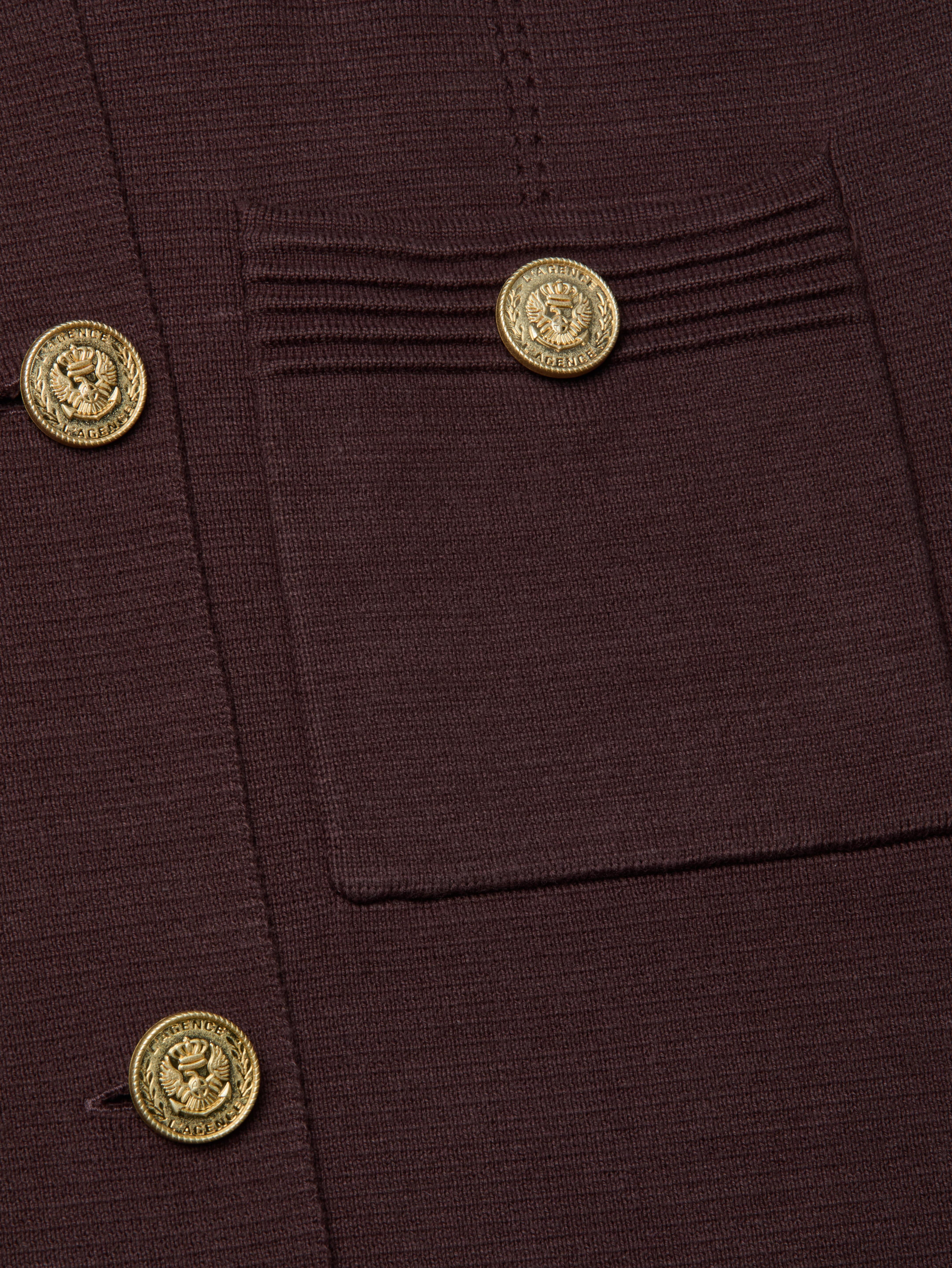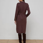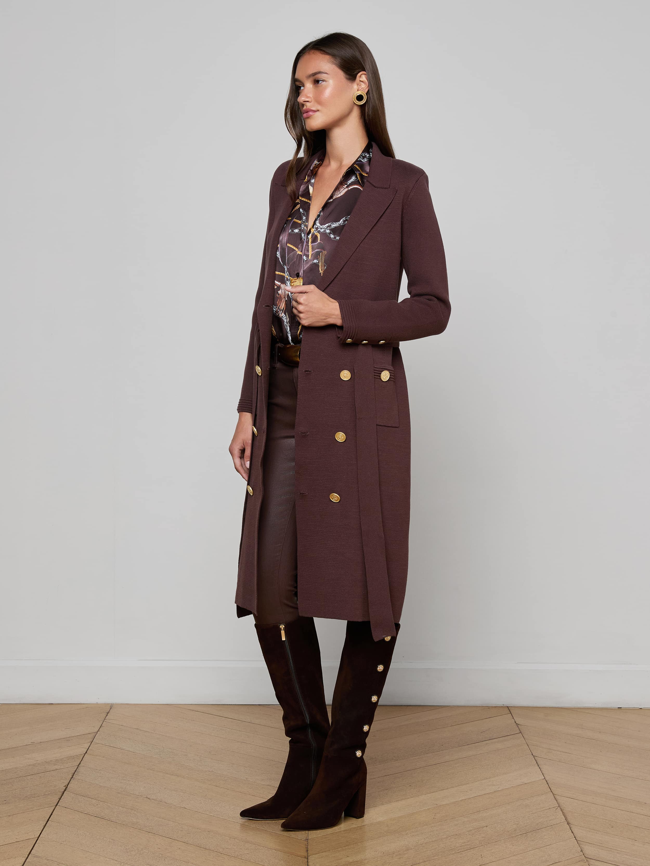 The Isabel coat merges sharp tailoring with luxe knitwear. Cut in a refined midi length, it features a double-breasted front with gold crest buttons and a self-tie belt that cinches the waist for a flattering finish. The structured lapels and patch pockets are a nod to classic tailoring, while the knit construction softens the look with ease and comfort. Wear it over jeans and a tee for an easy, polished look.
