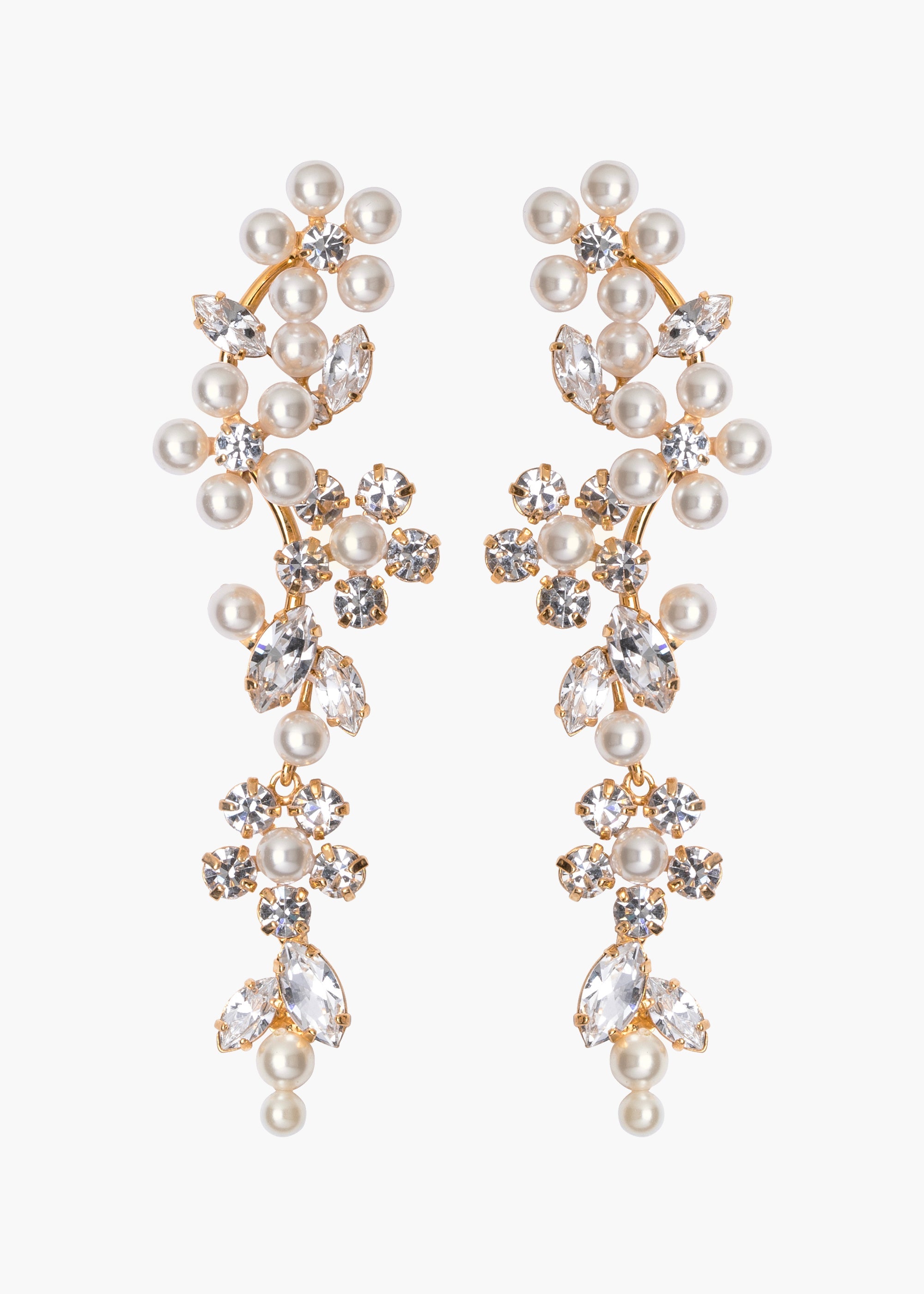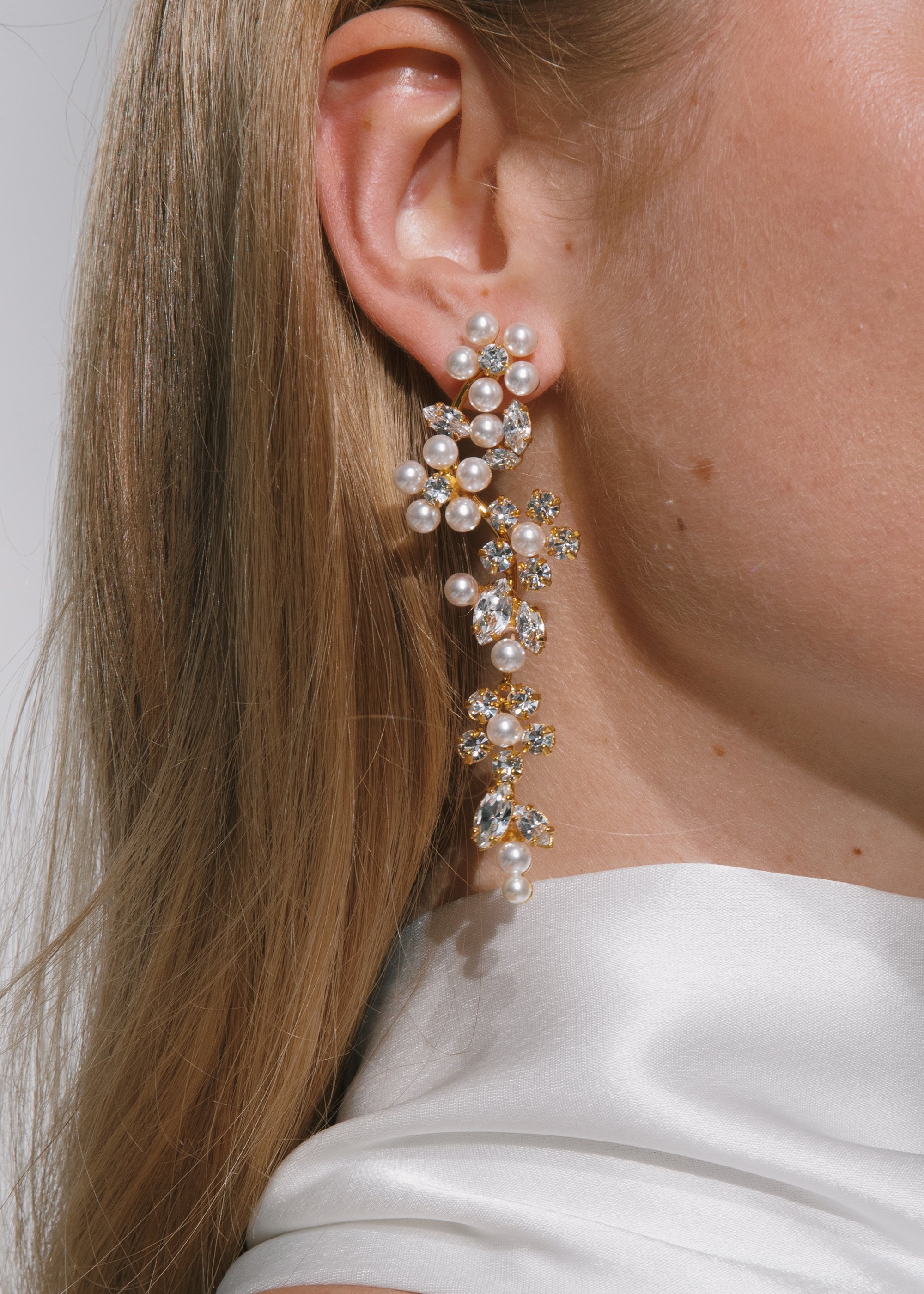 The Jacinthe Earrings bring the idyllic charm of a daisy bouquet to life in a wearable floral arrangement. They are plated in an antique gold finish to give the pearls a distinct warmth, further ignited by sparkling crystals. Made by hand in New York, each stone is intentionally placed to frame the face, with a flattering lengthening effect. Dimensions: 3.25" in length.