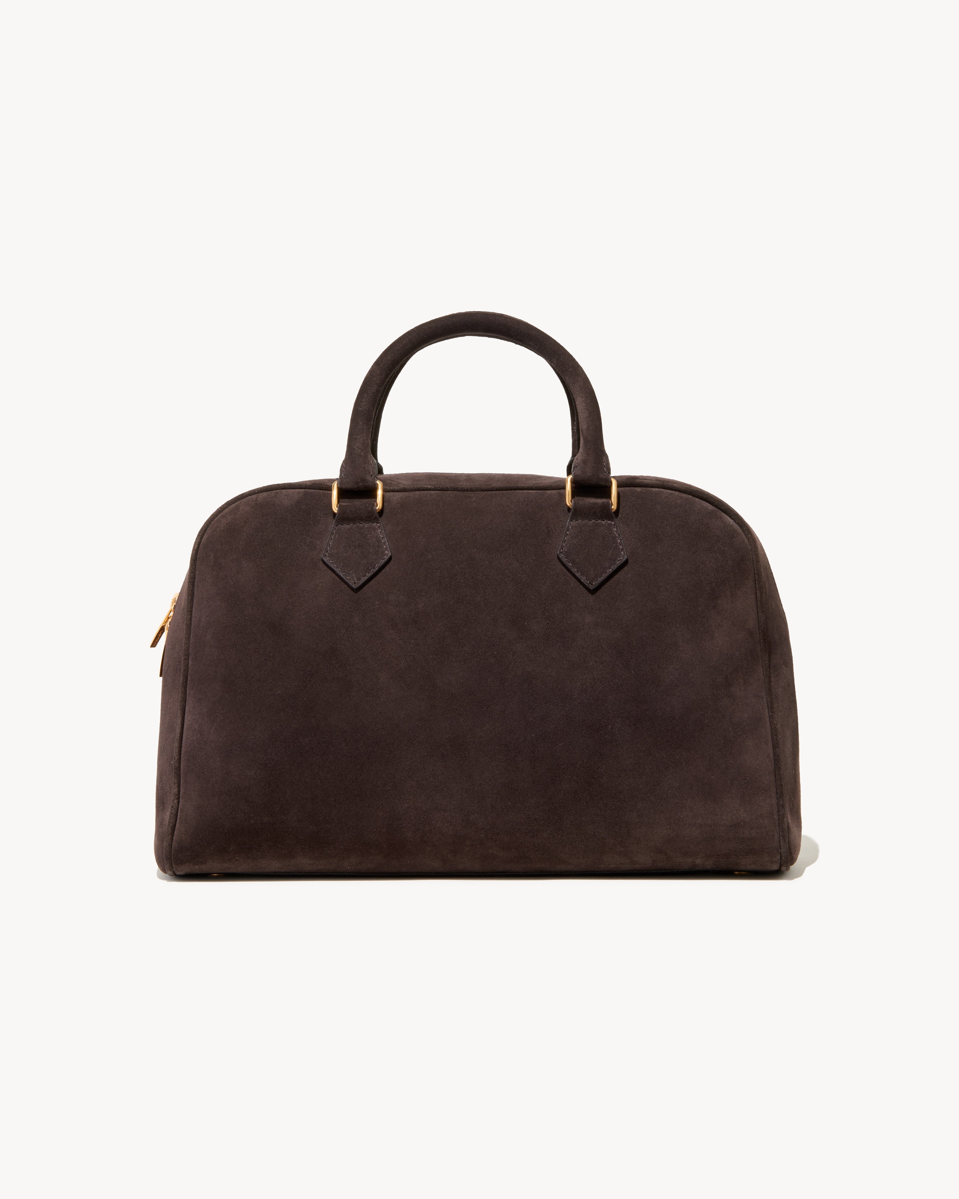 Top-handle bag in luxurious Italian suede. Italian suede lining. Semi-structured silhouette with a soft handfeel that collapses intentionally over time. Structured base. Removable interior pouch. Interior back wall zip pocket. No exterior logo. Interior features a debossed NILI LOTAN NEW YORK logo with “Made In” mark.