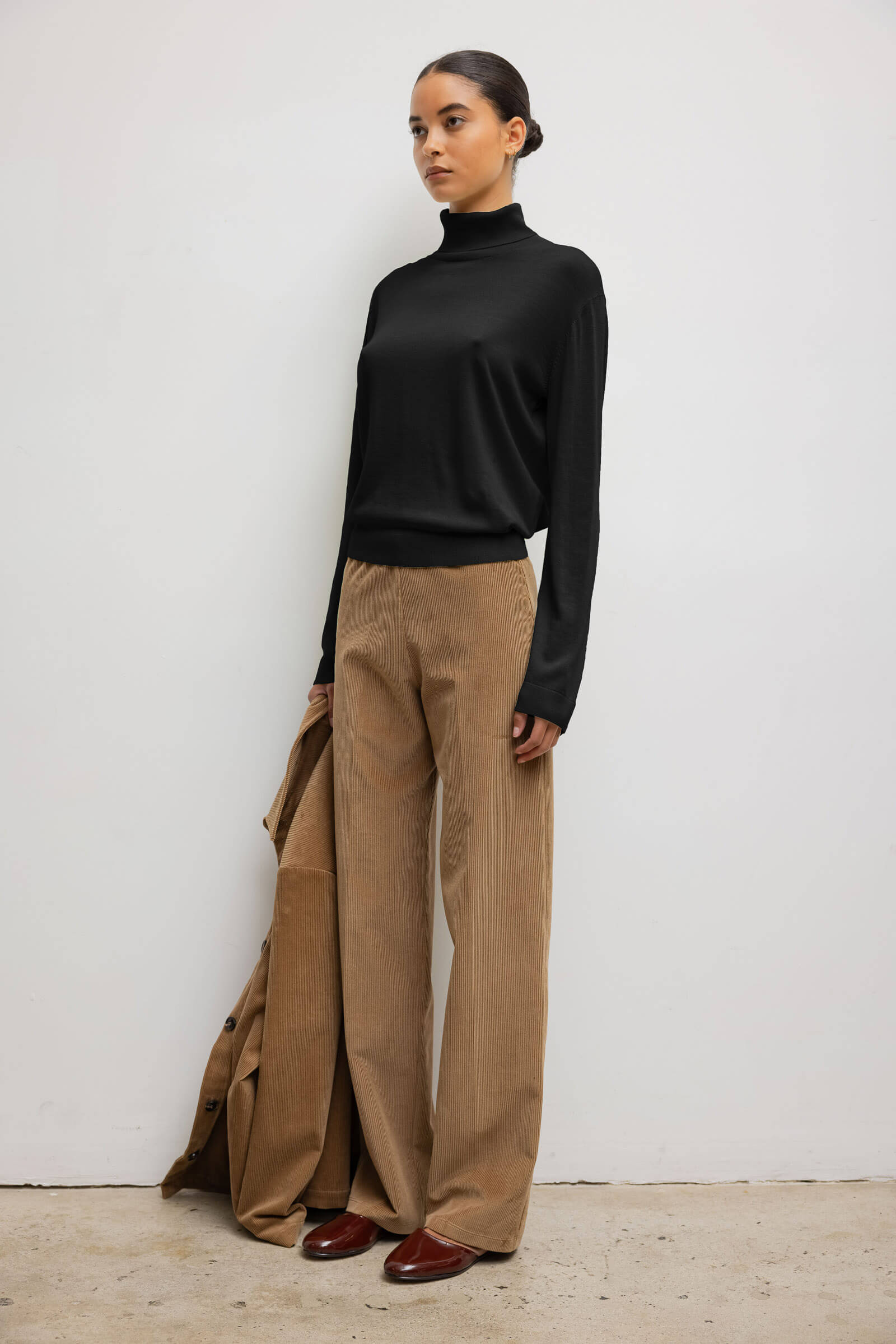 Knit in our ultra lightweight, 100% merino wool James Knit, The James Turtleneck is the quintessential layerable turtleneck, featuring a fold over neck, full length sleeves, and delicate ribbed finishes. Wear it by itself or underneath heavier knits and outwear.