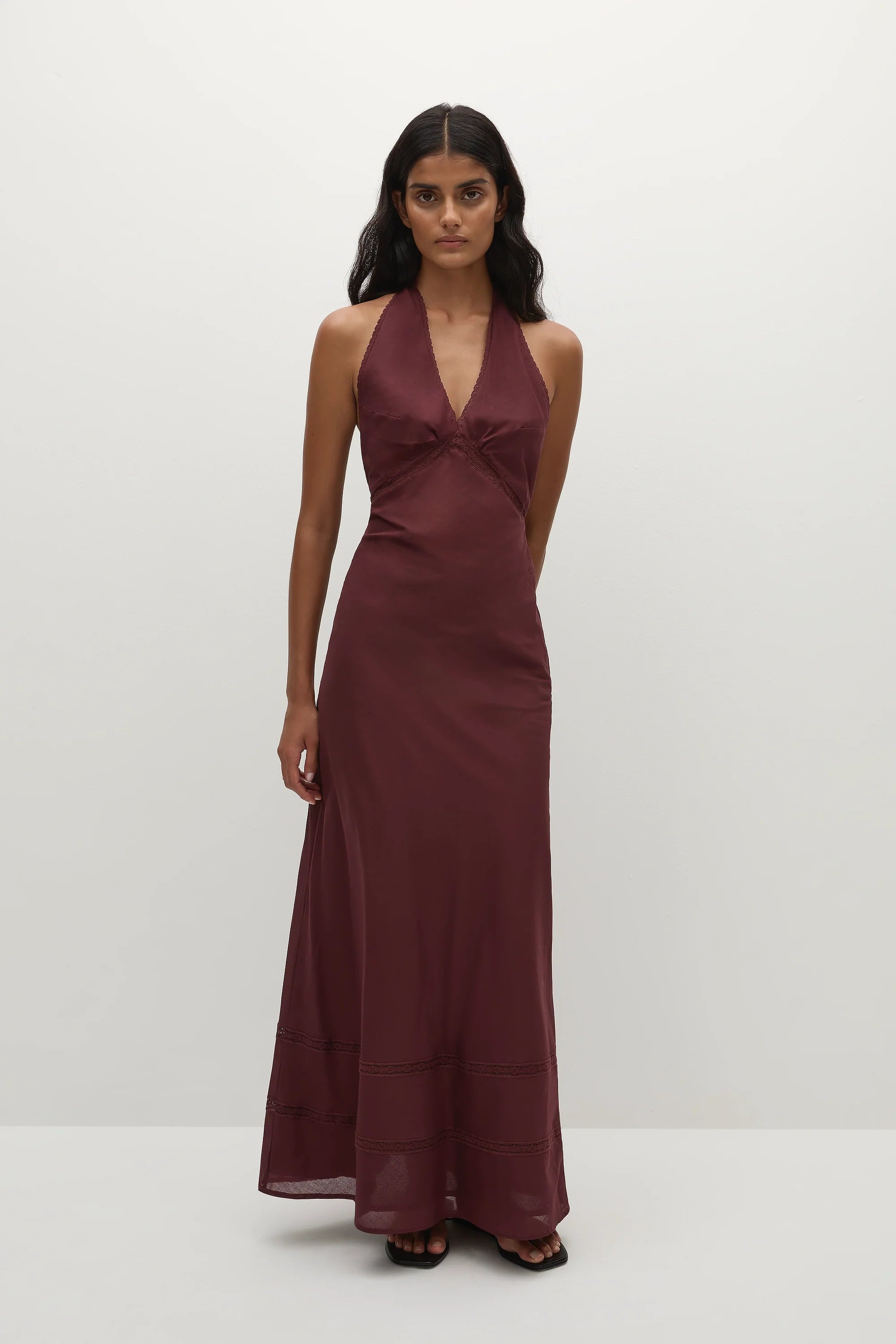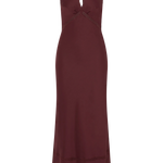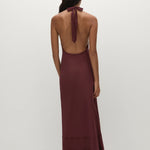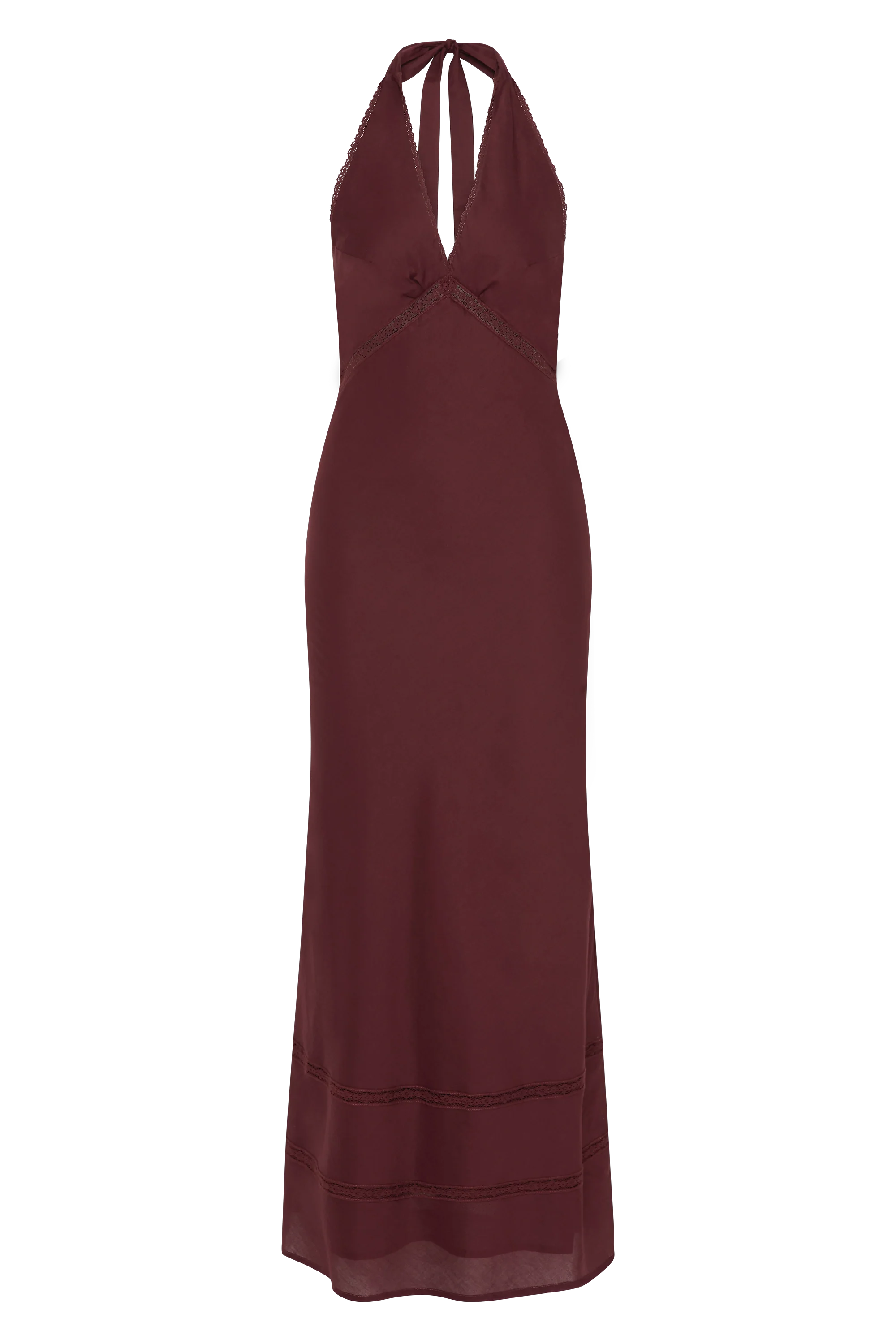 A halter-style maxi dress with back neck ties and vintage-inspired lace trim around the neckline and under the bust. Backless and semi-fitted through the upper body, it then falls into a soft A-line skirt with further vintage-inspired lace detailing through the skirt in two tiers. Designed in a 100% cotton voile fabrication in a deep bordeaux shade, style with a simple heel for day to night dressing.