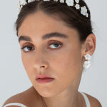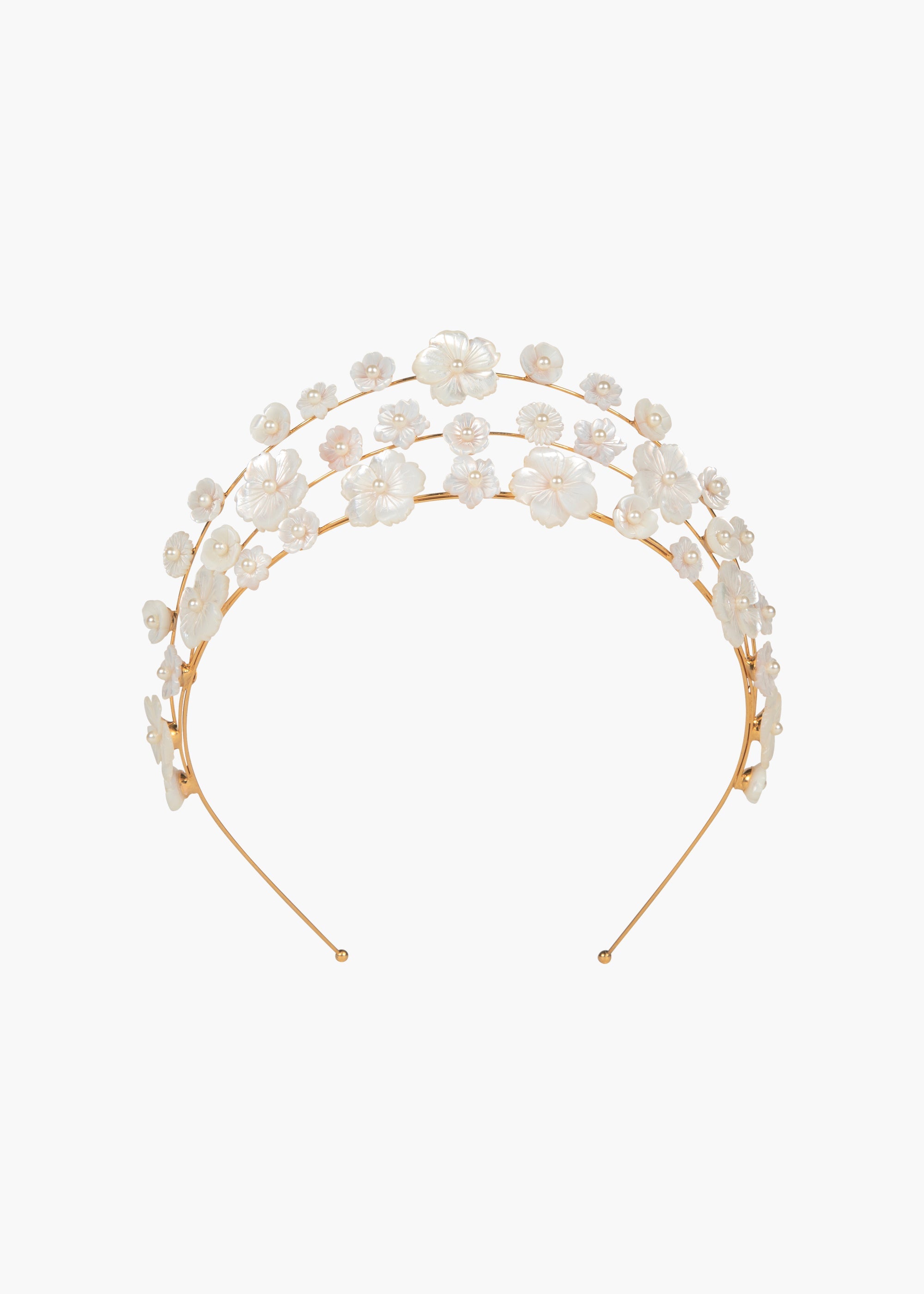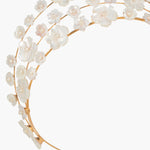 Steeped in enchanting whimsy, the Jenette Crown is a majestic halo of florals, made by hand in New York. Three arcs of flowers are hand-carved of mother of pearl, with chiseled details that enhance the material's magical iridescence, and clever placement that feels perfectly organic. The flowers' surface is raised and tilted forward, suggesting the regal shape of a crown. Wear this headpiece with the Tibby Earrings for a perfectly coordinated look.