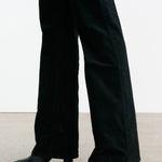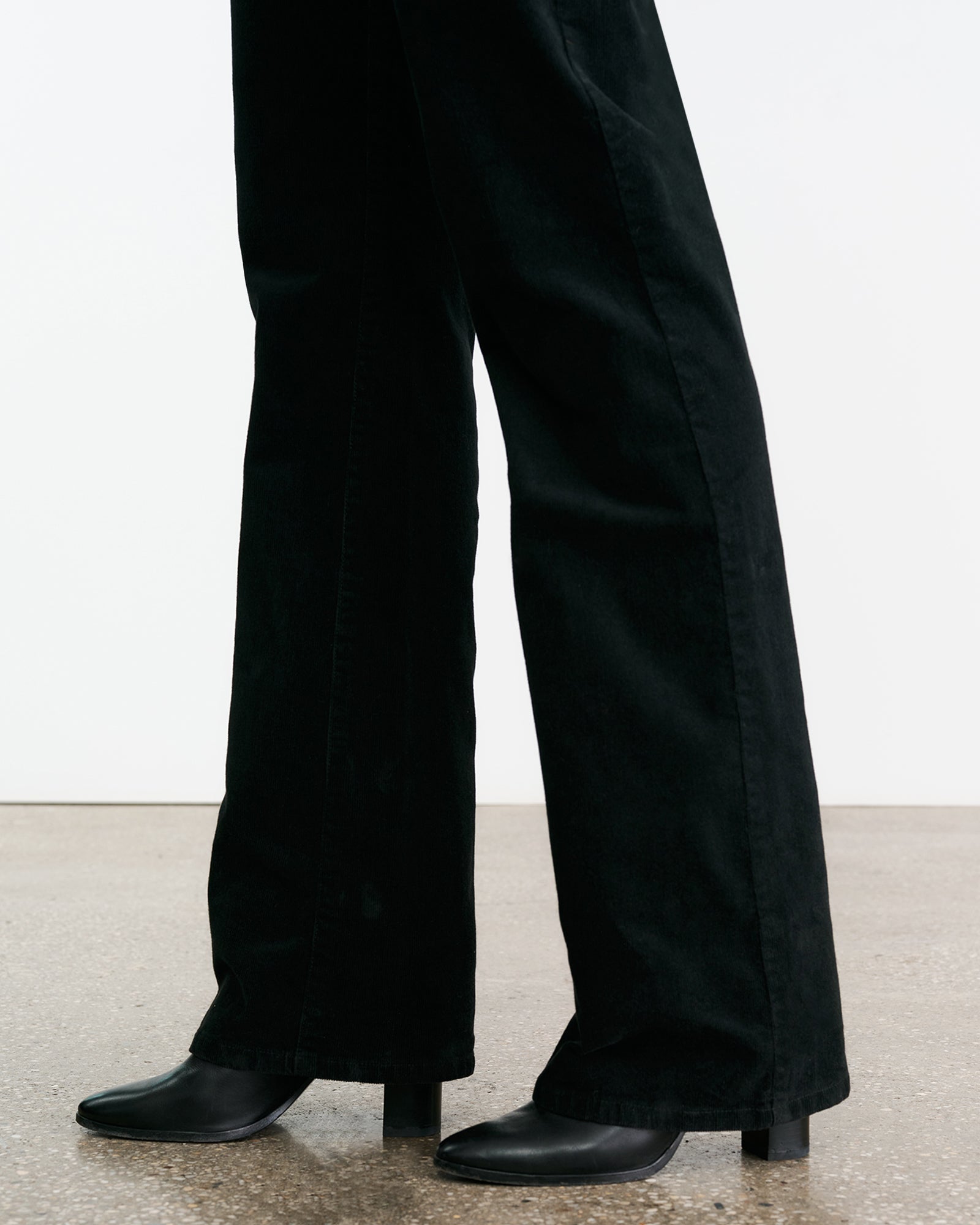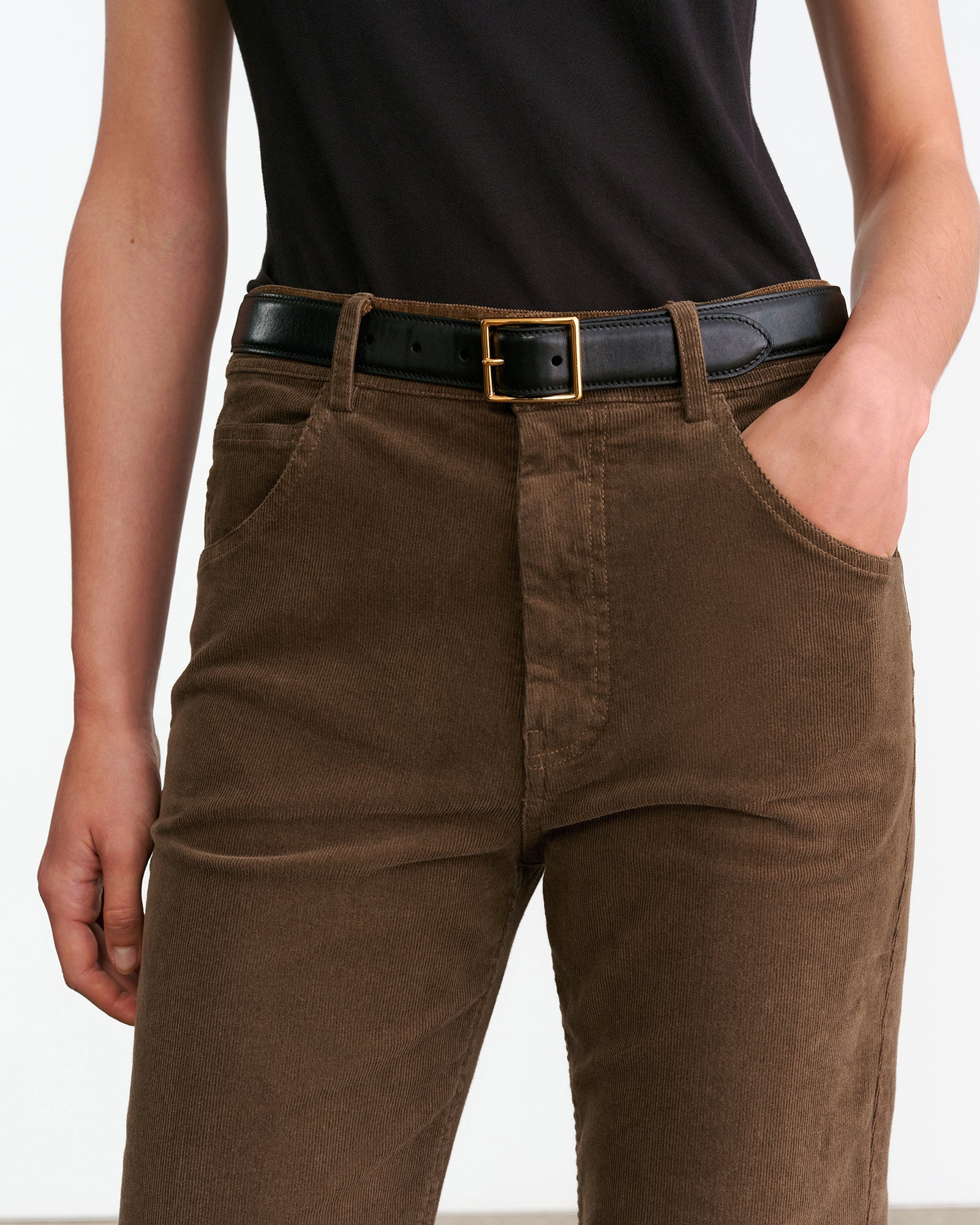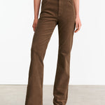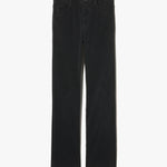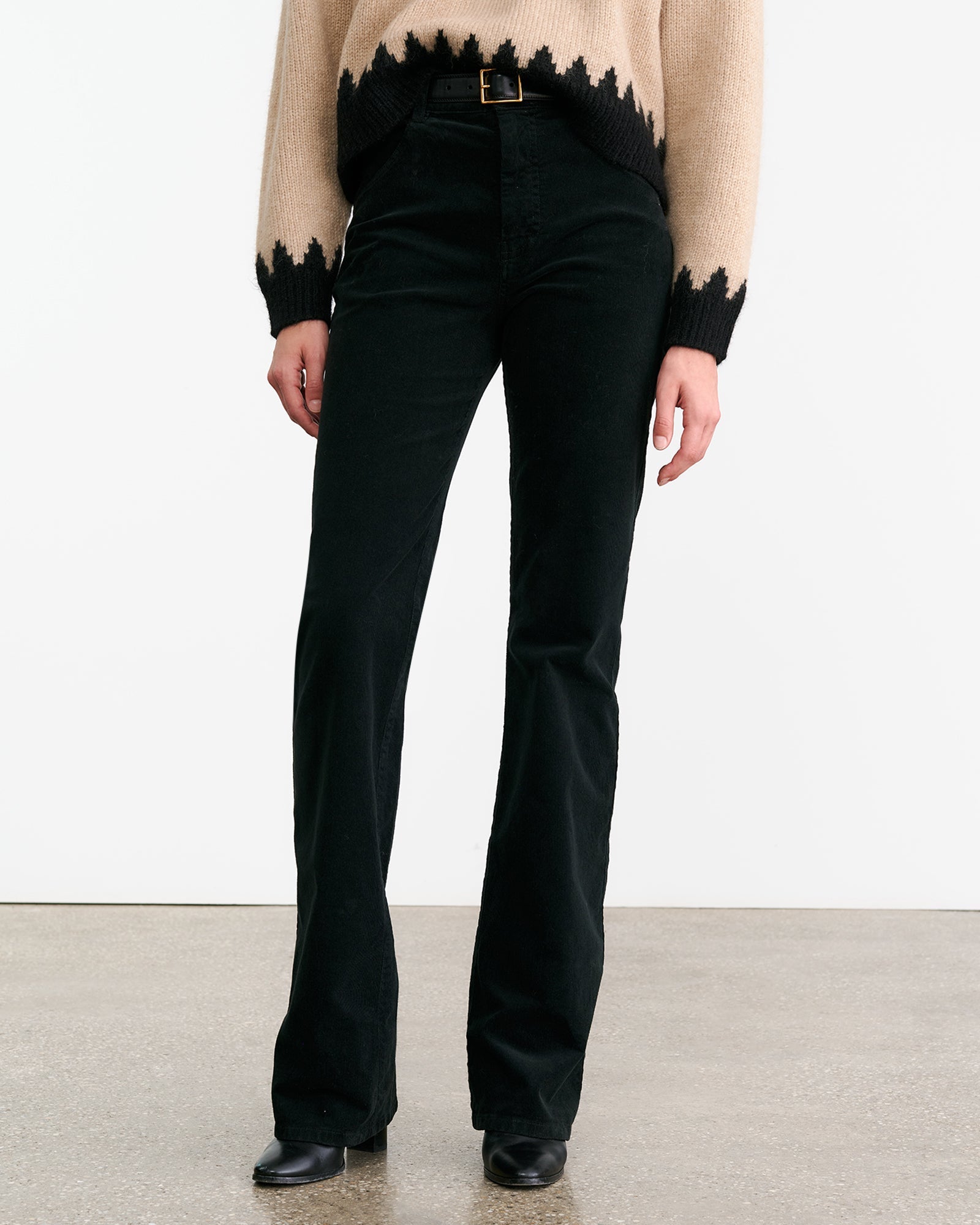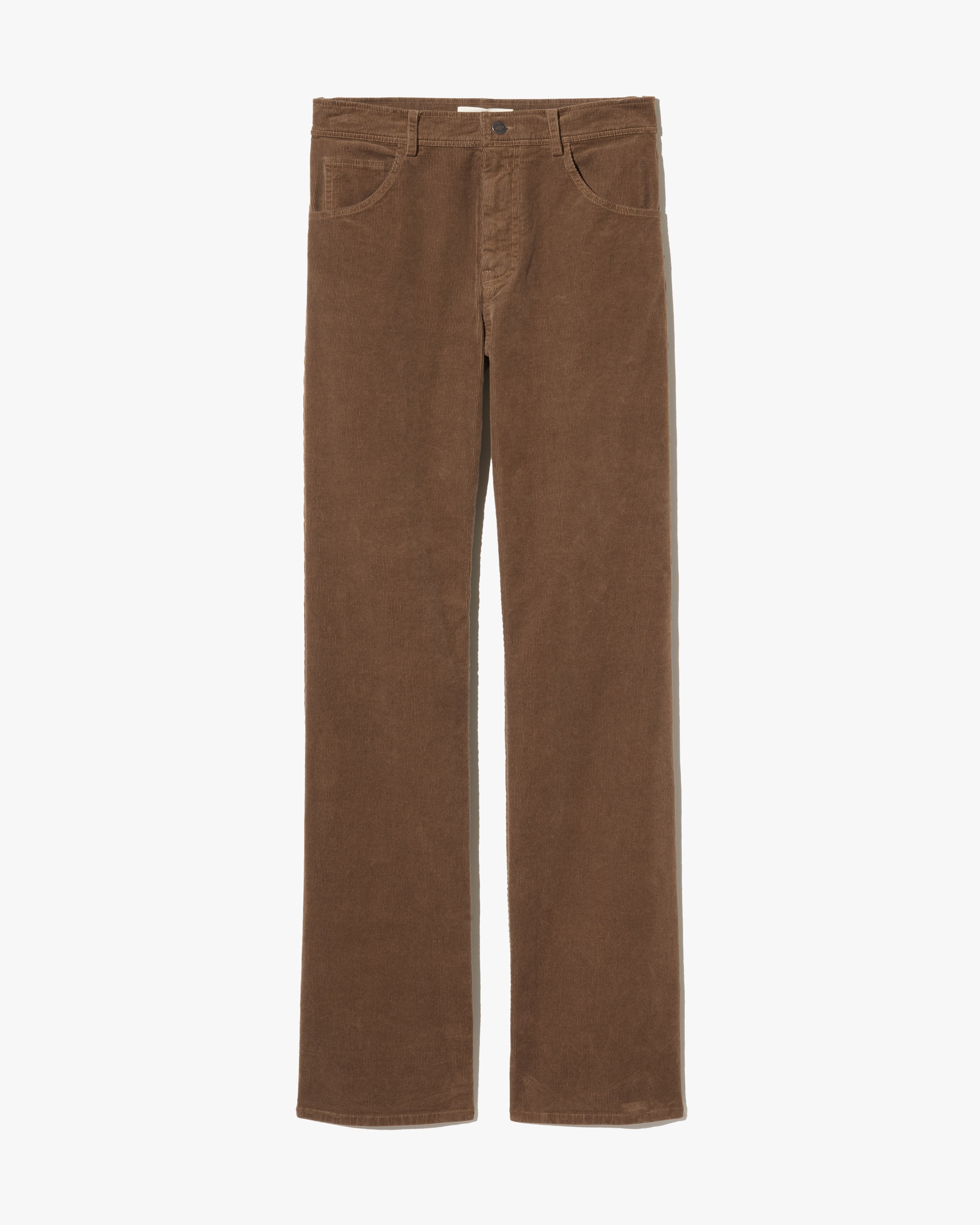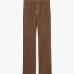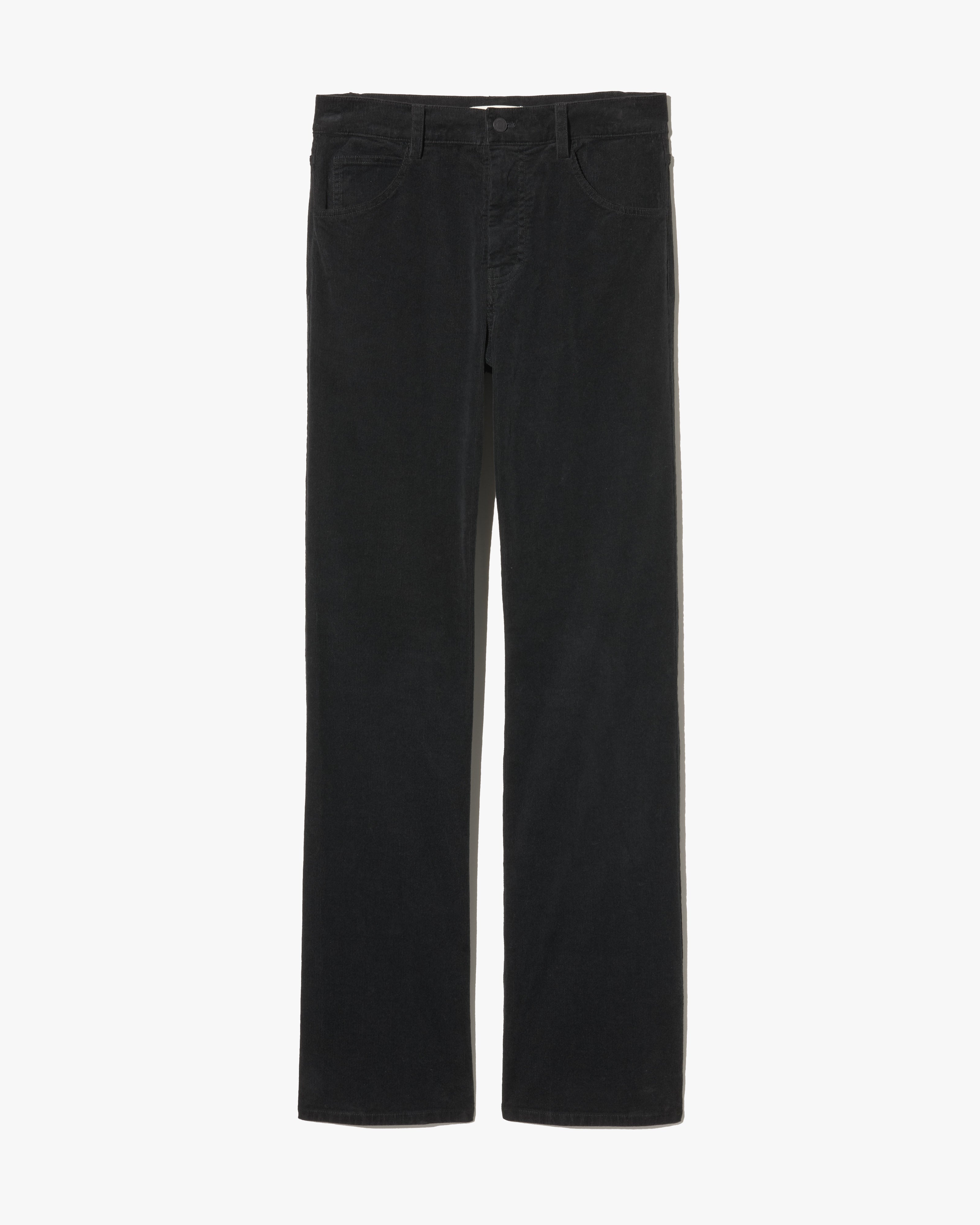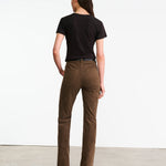 High-rise slim straight leg pant. Fitted through hips. Five pocket details. Zip fly. Shank closure. Belt loops.