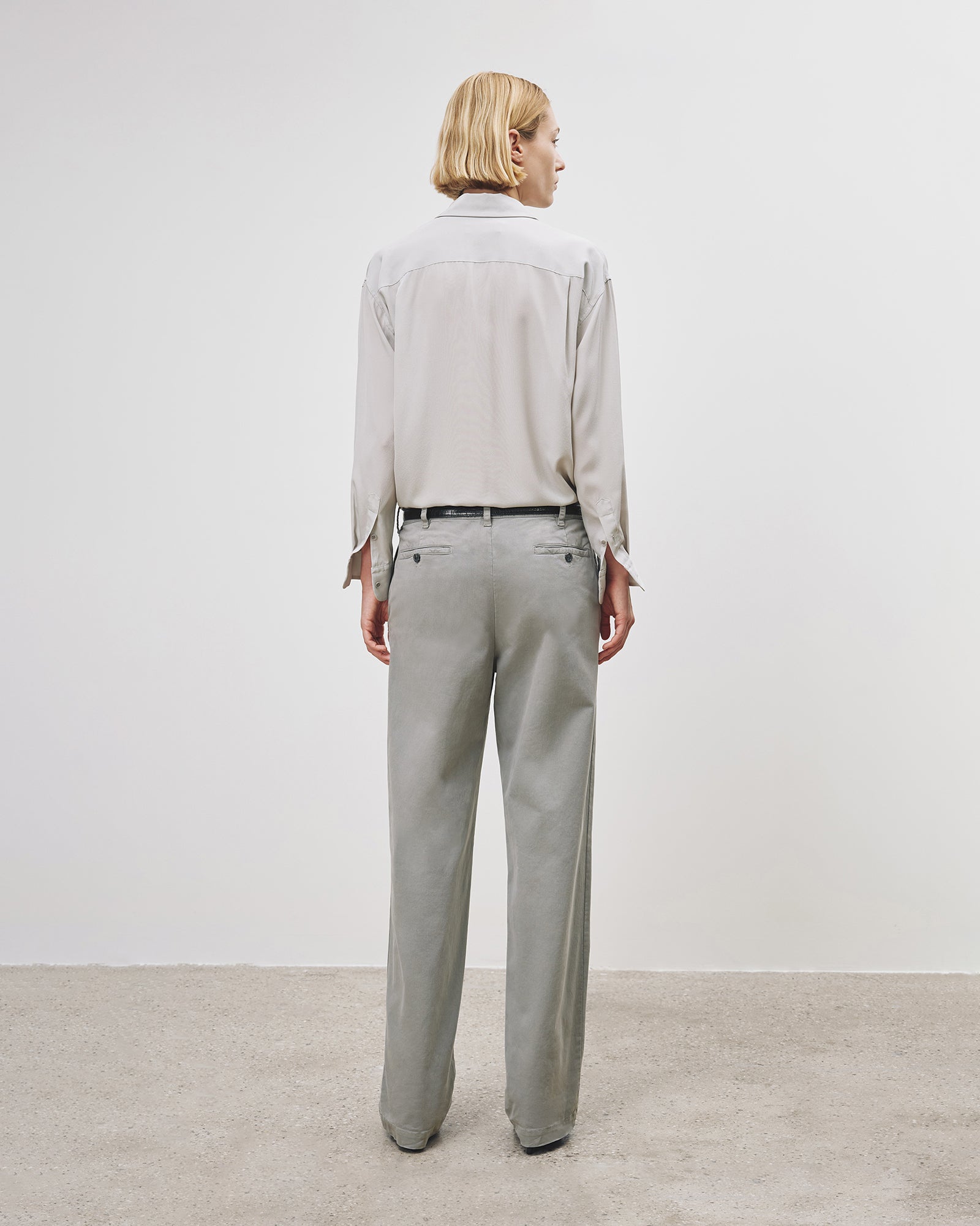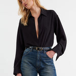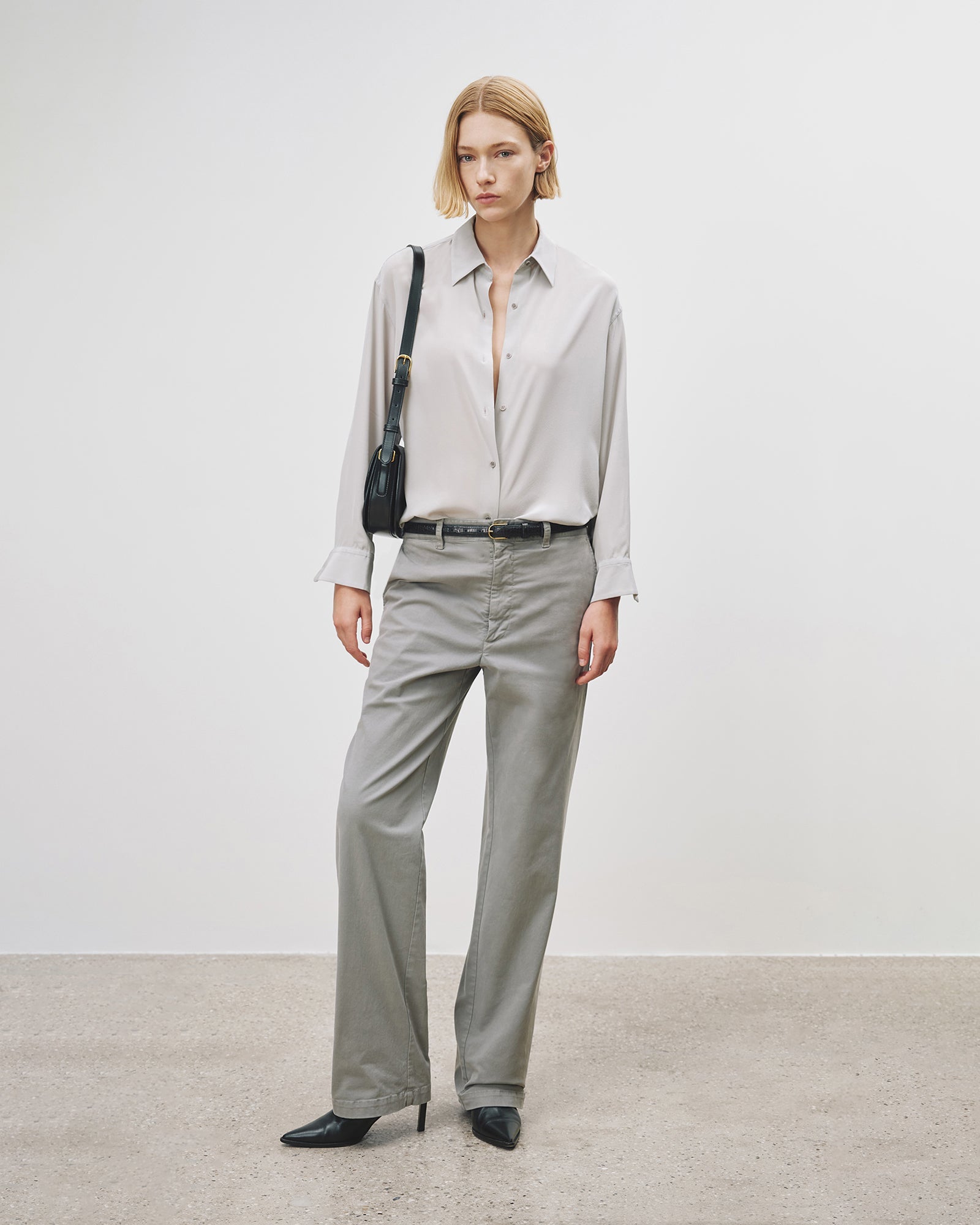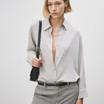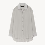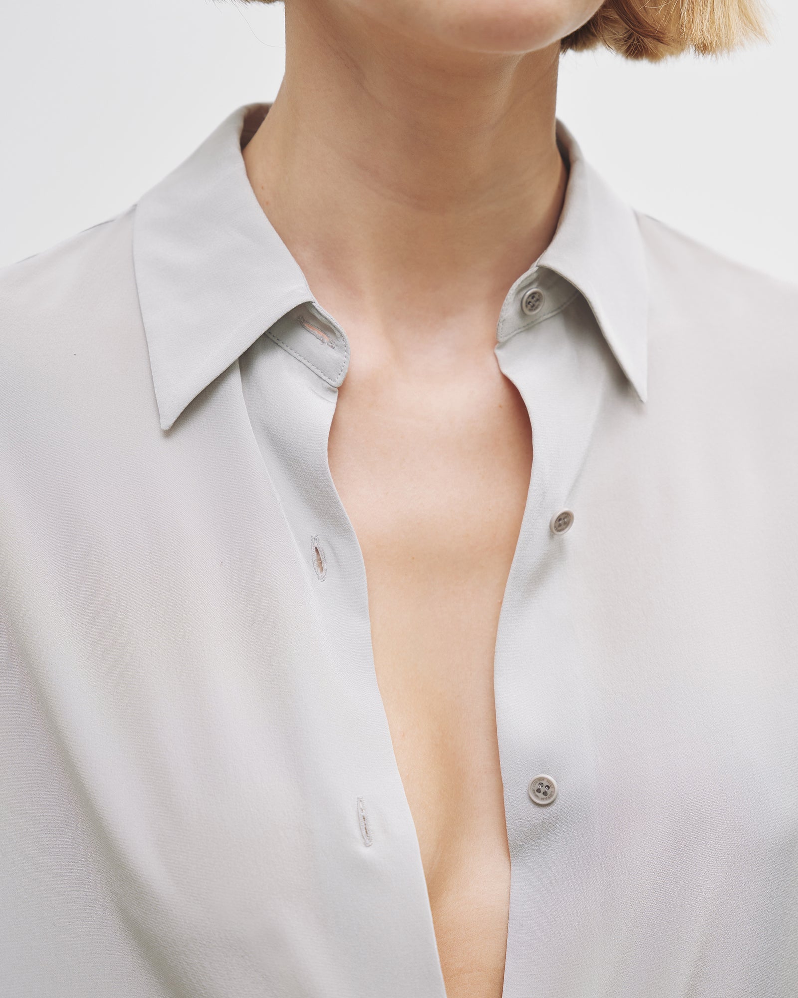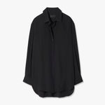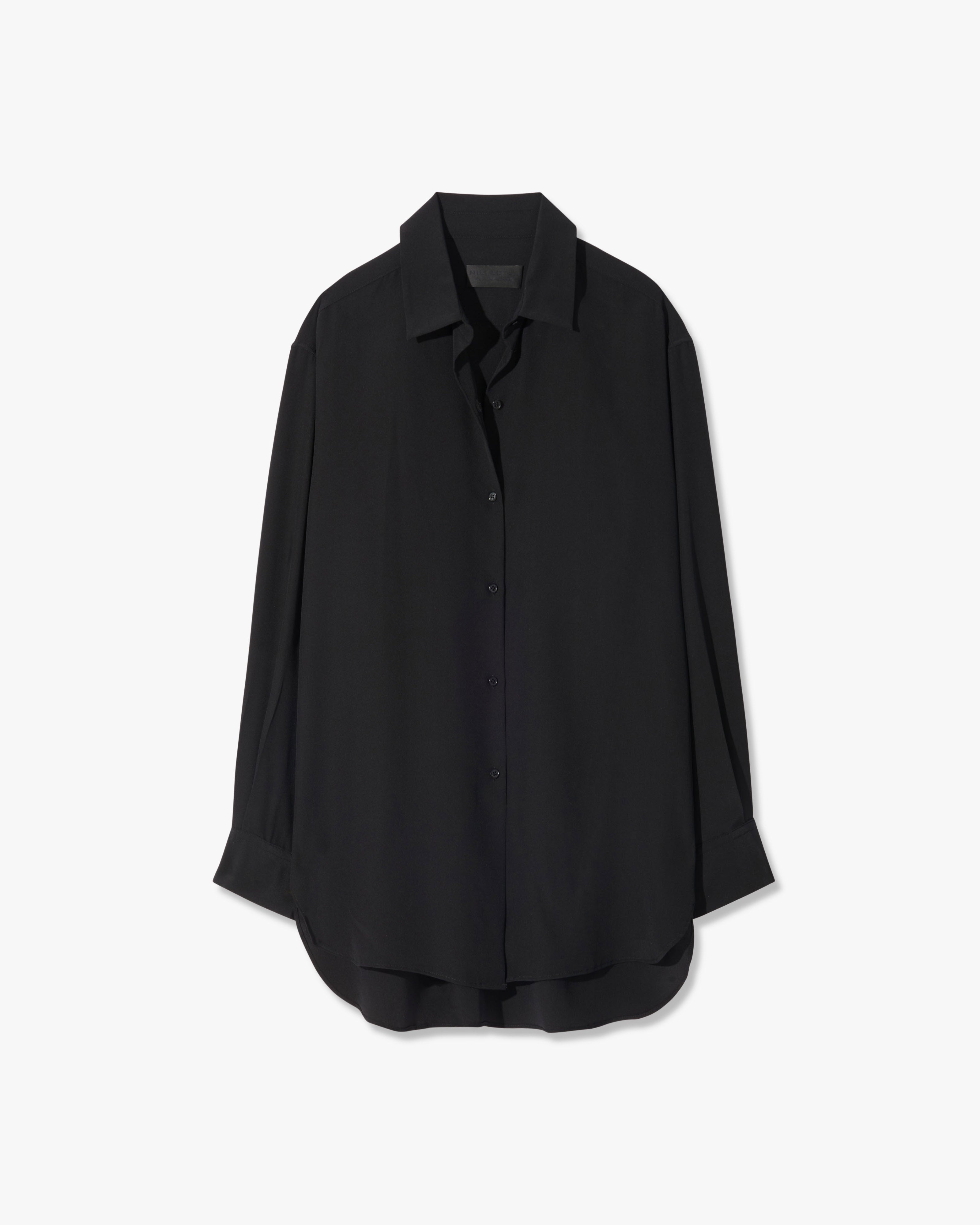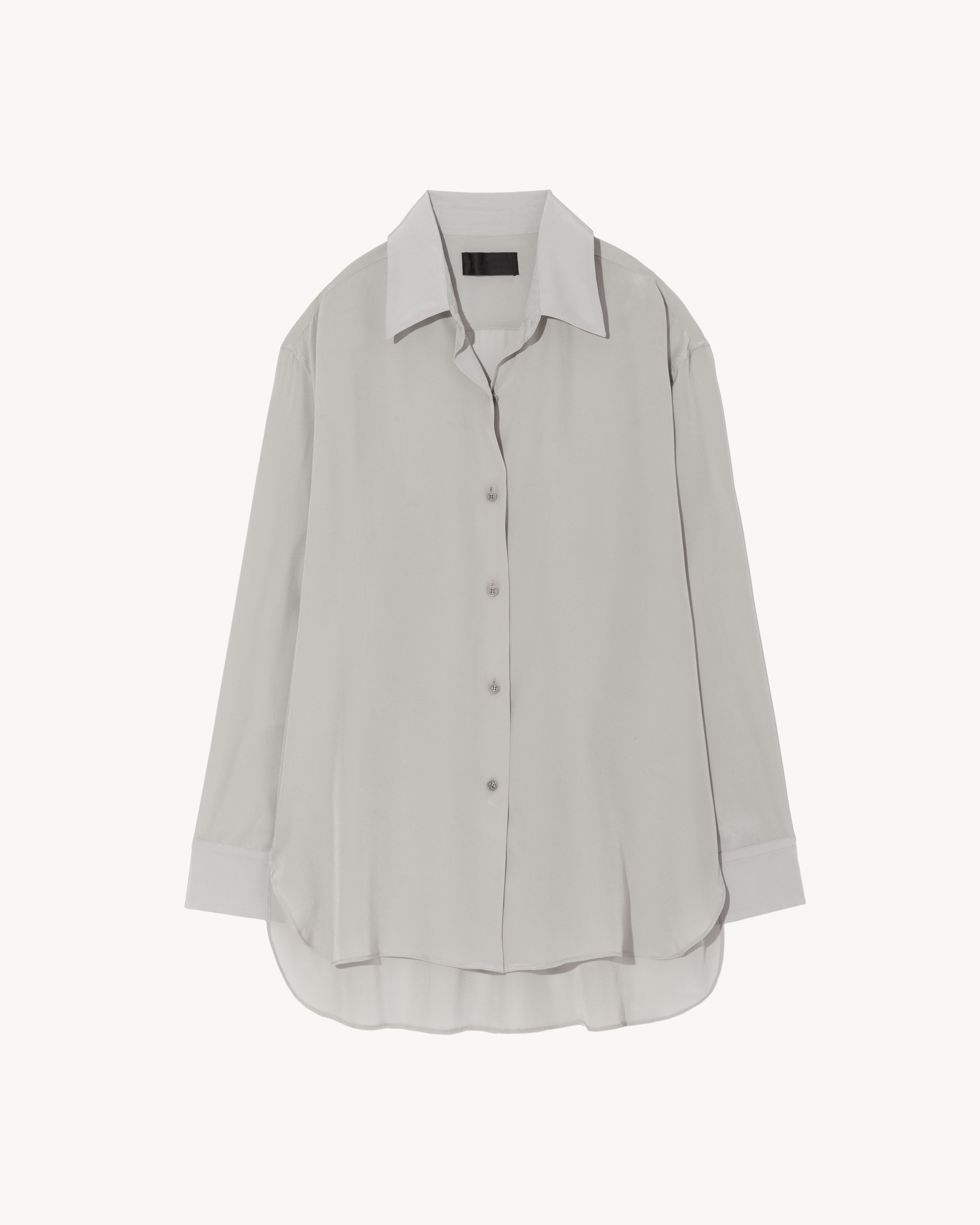Oversized long-sleeved button-front shirt in fluid silk crepe de chine. Dropped shoulder. Spread collar. Shirred back yoke. Curved shirttail hem. Minimally styled with clean front and tonal buttons.