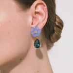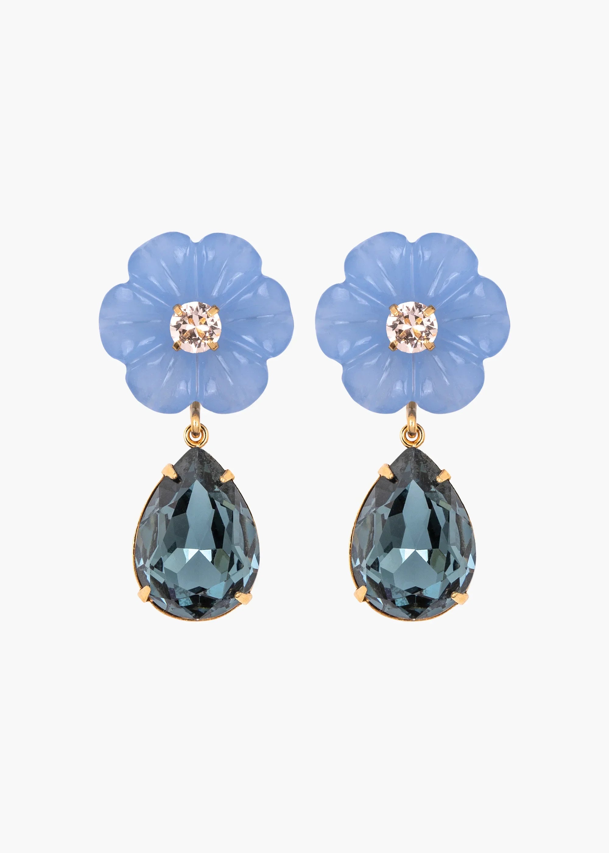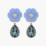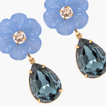 Playfully layering semi-precious gemstones with Austrian crystals, the Juna Earrings are romantic drops, featuring aquamarine, lemon quartz, or blue chalcedony. Made by hand in New York with an 18-karat gold-plated setting, the hand-carved detail on each flower highlights the unique inherent beauty of the organic material— due to natural variations, each pair is one-of-a-kind. The sparkling crystals stand in contrast to the semi-precious stones' ethereal translucence, the mix of transparency and opacity creating rich dimension. Dimensions: 1 5/8in x 3/4in