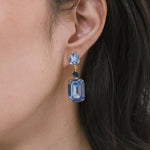 Your Bejeweled Era begins with the Justine Earrings. A pair of stately emerald-cut crystals in complementary hues are separated by a single delicate round stone. These superior drops will remain in constant rotation in your wardrobe for years to come. Dimensions: 1.5" length.