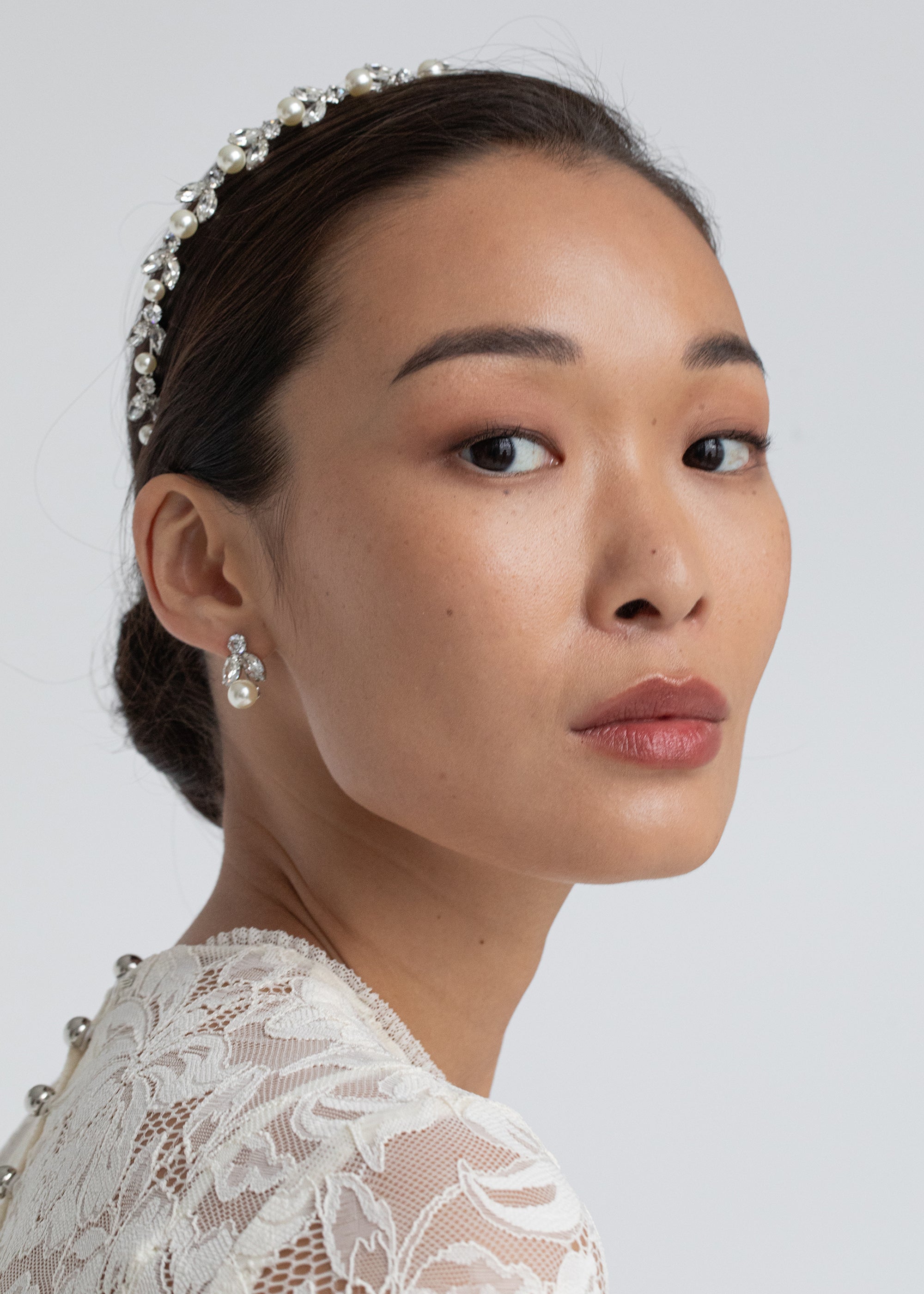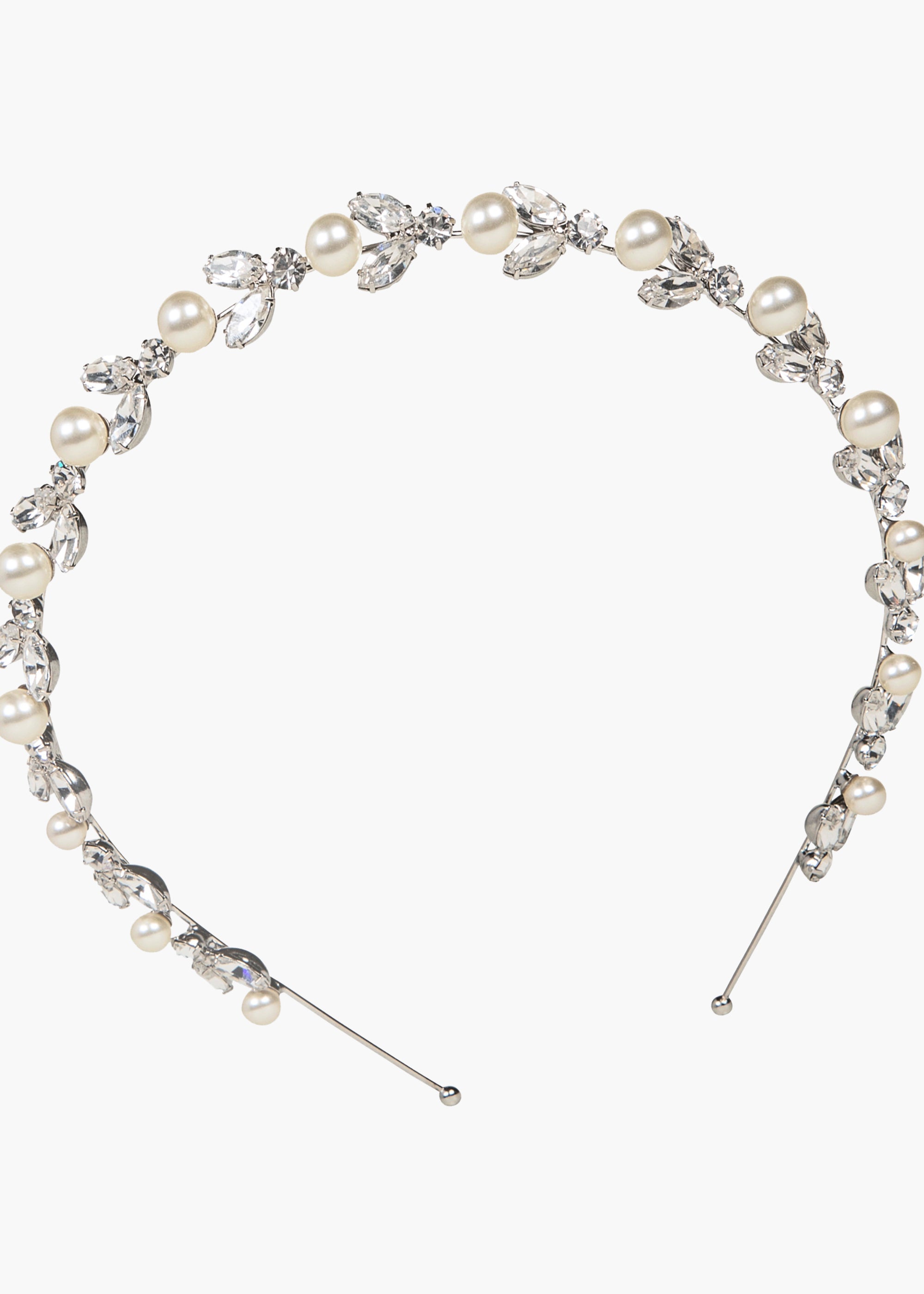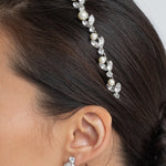 Delicate yet impactful, the Kamila Headband leaves all eyes on you. A vine of crystal flora is punctuated by lustrous pearls, with a raised silhouette subtly suggesting the height of a tiara. The fine headband base disappears into the hair, creating the sublime illusion of gems magically afloat. Pair with the matching Kaide Earrings.