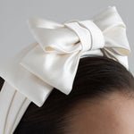 Featuring a bow of mythic proportions, the Karmen Bow Headband lends undeniable personality to any look. Each one is crafted from duchess silk and hand-draped in our Brooklyn studio. The bow at the crown of the head is perfectly situated to frame the face, while the flexible headband base ensures hours of comfort.