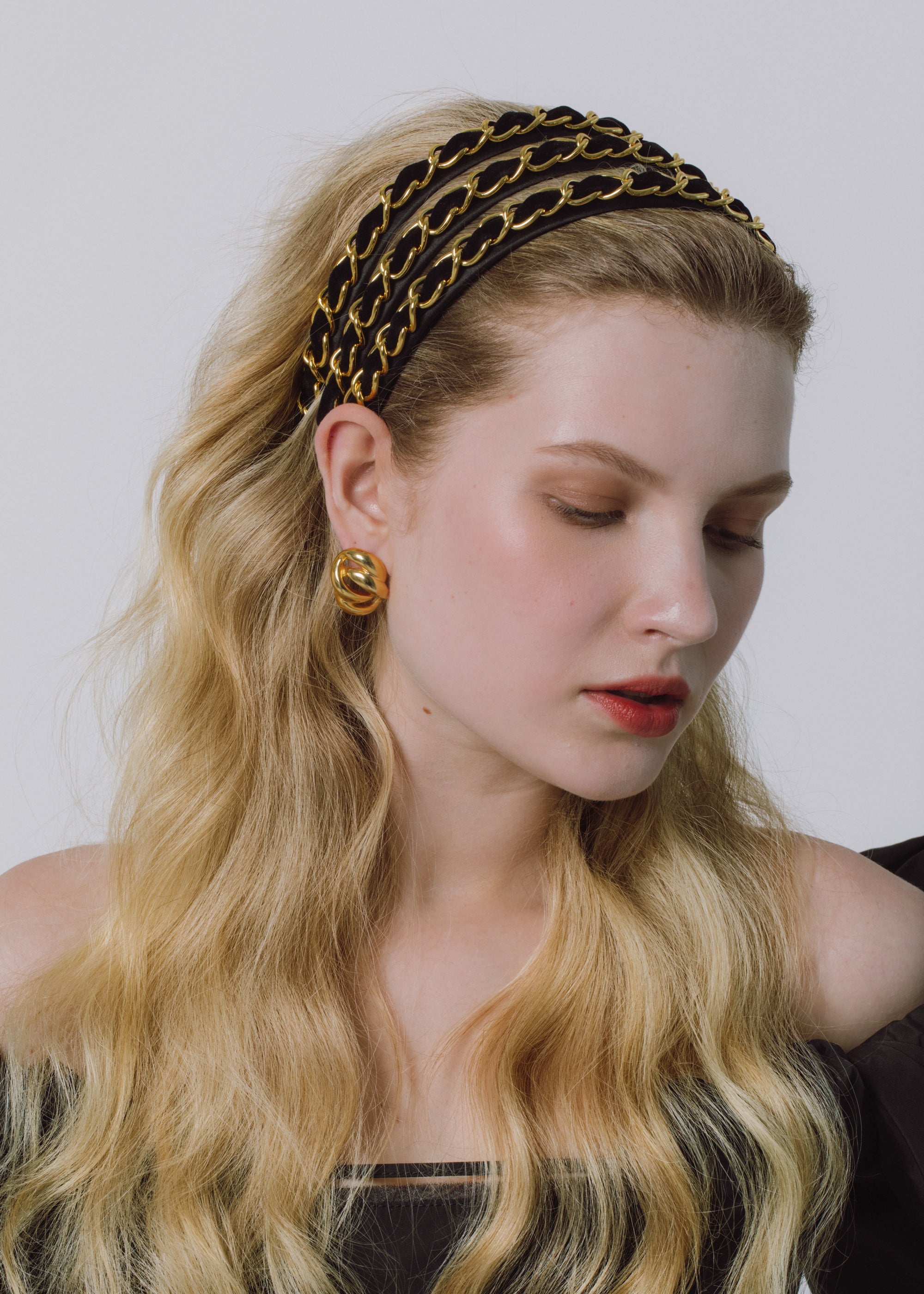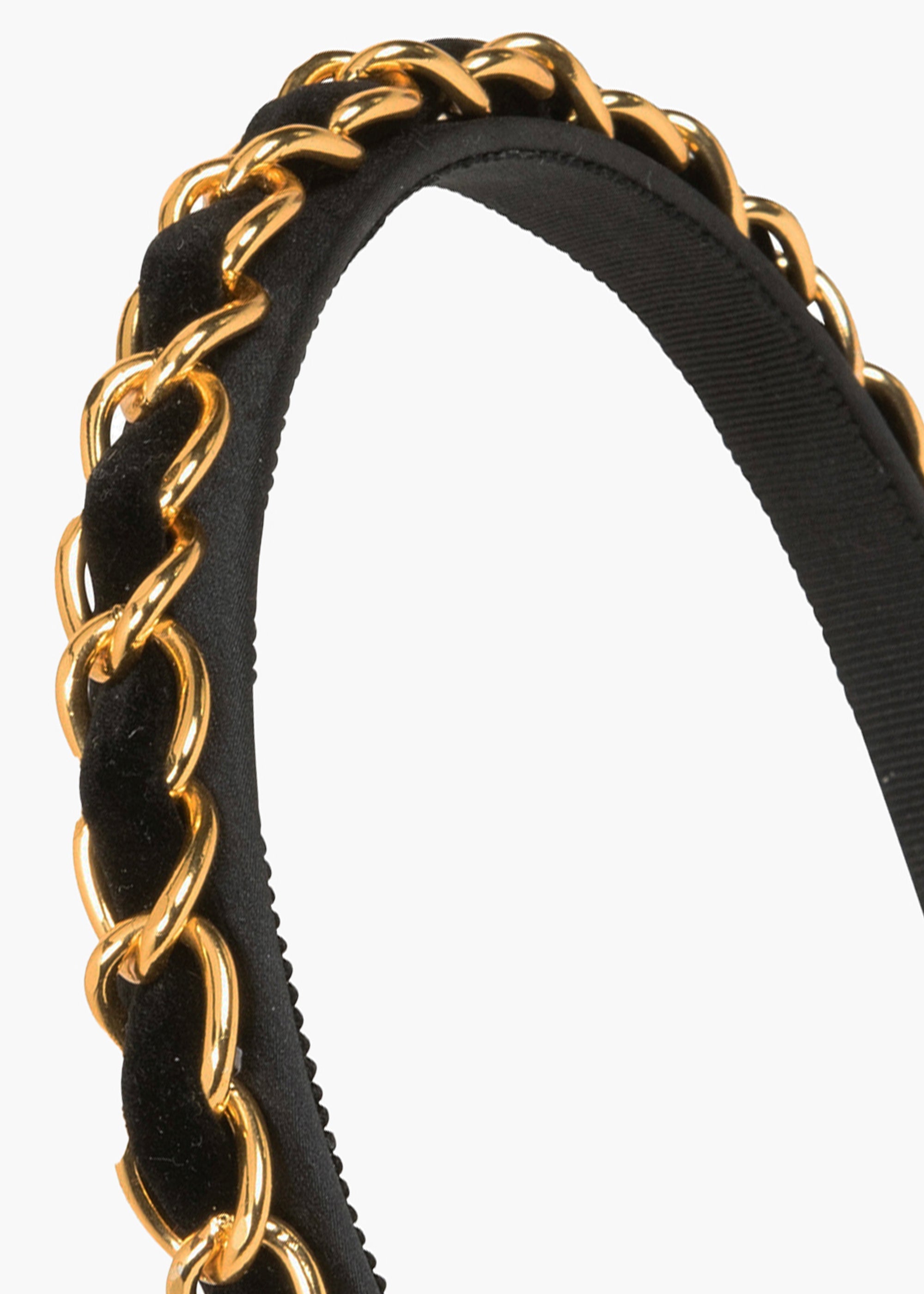 The Kason Headband draws inspiration from 90s couture collections to elevate any look you pair it with. Luxurious 18-karat gold-plated chains are woven with a silk velvet ribbon, all on a comfortable silk headband base. Layer multiple headbands at once for a dramatic runway-inspired look. Dimensions: 0.5 inch width, 0.5 inch height