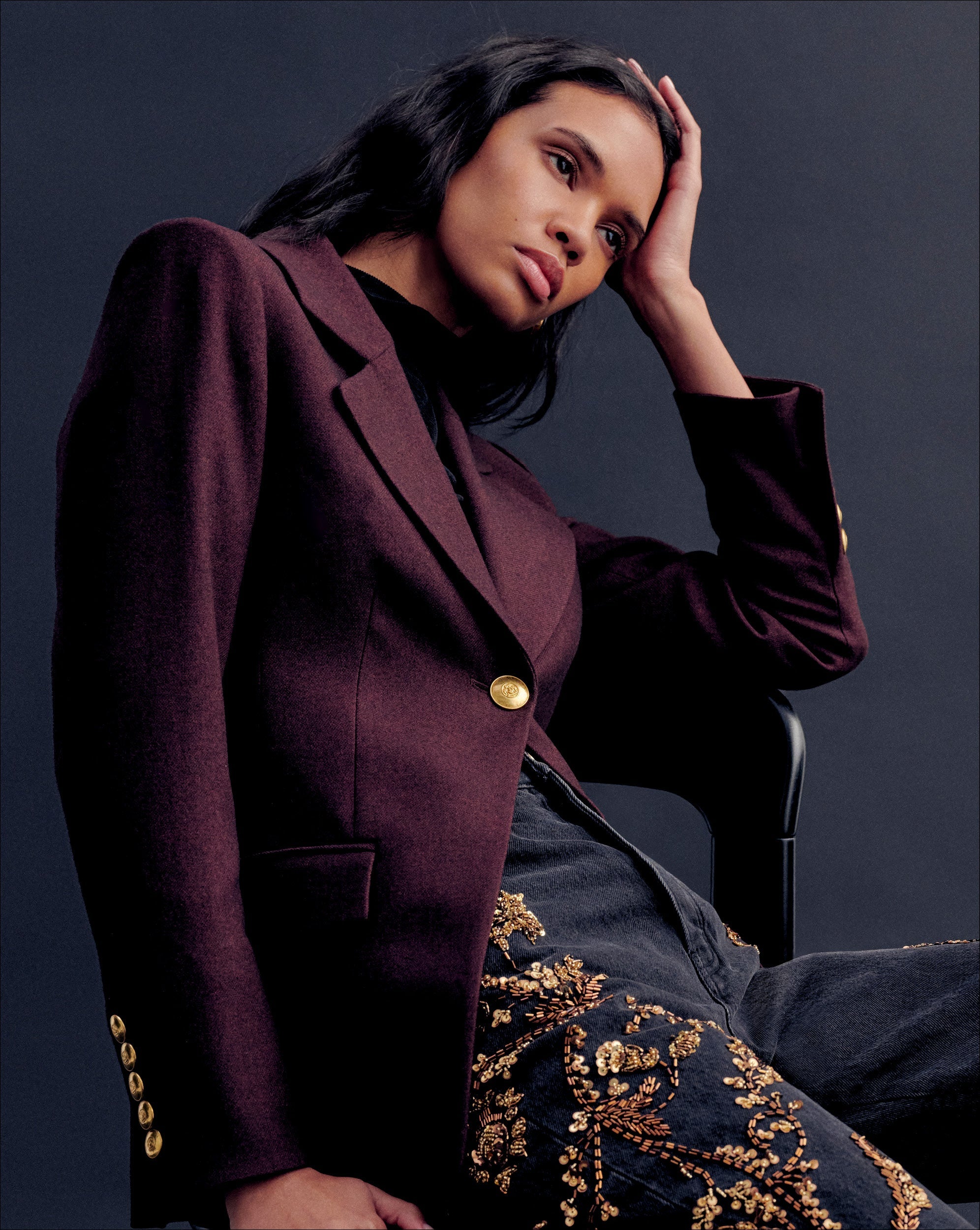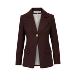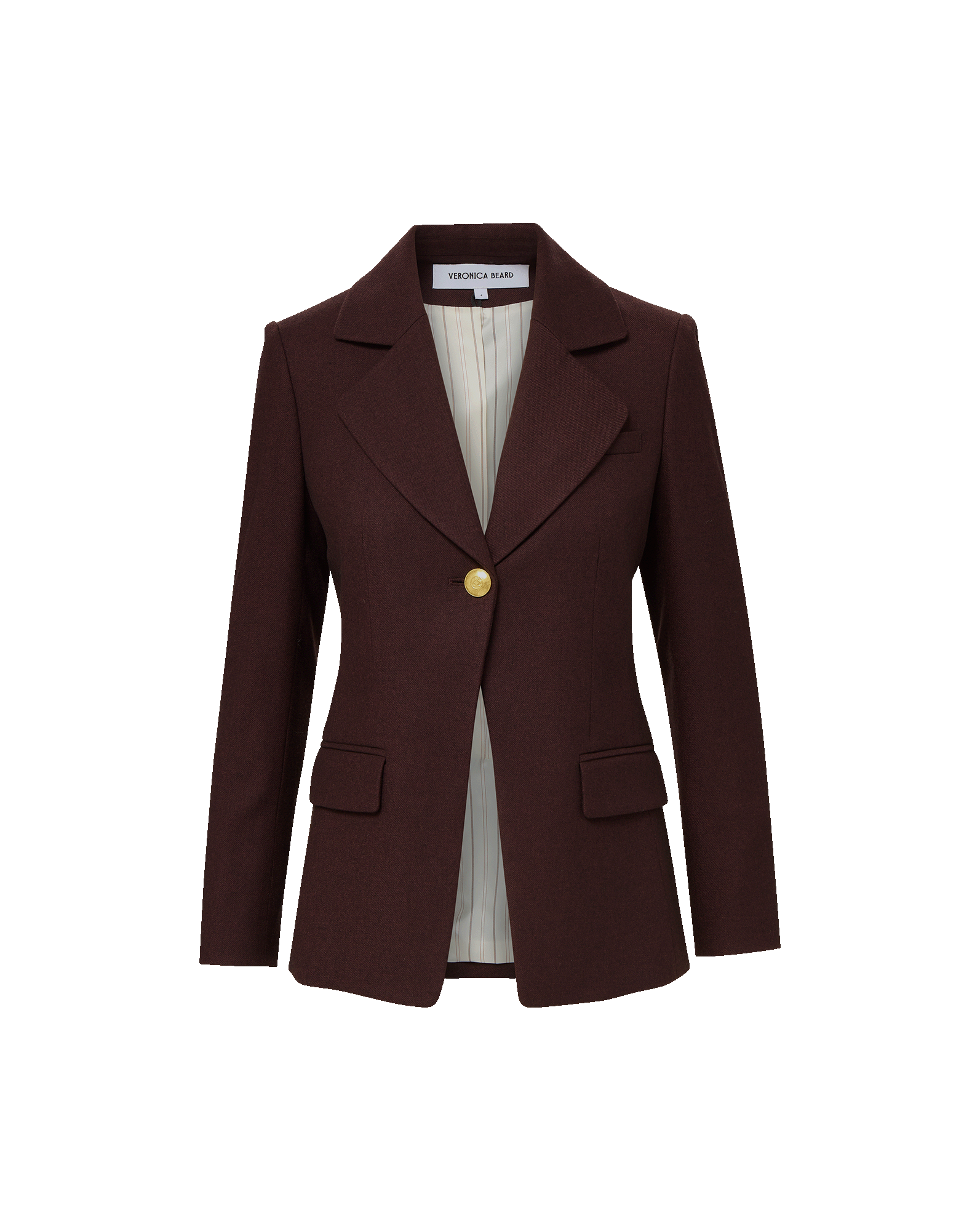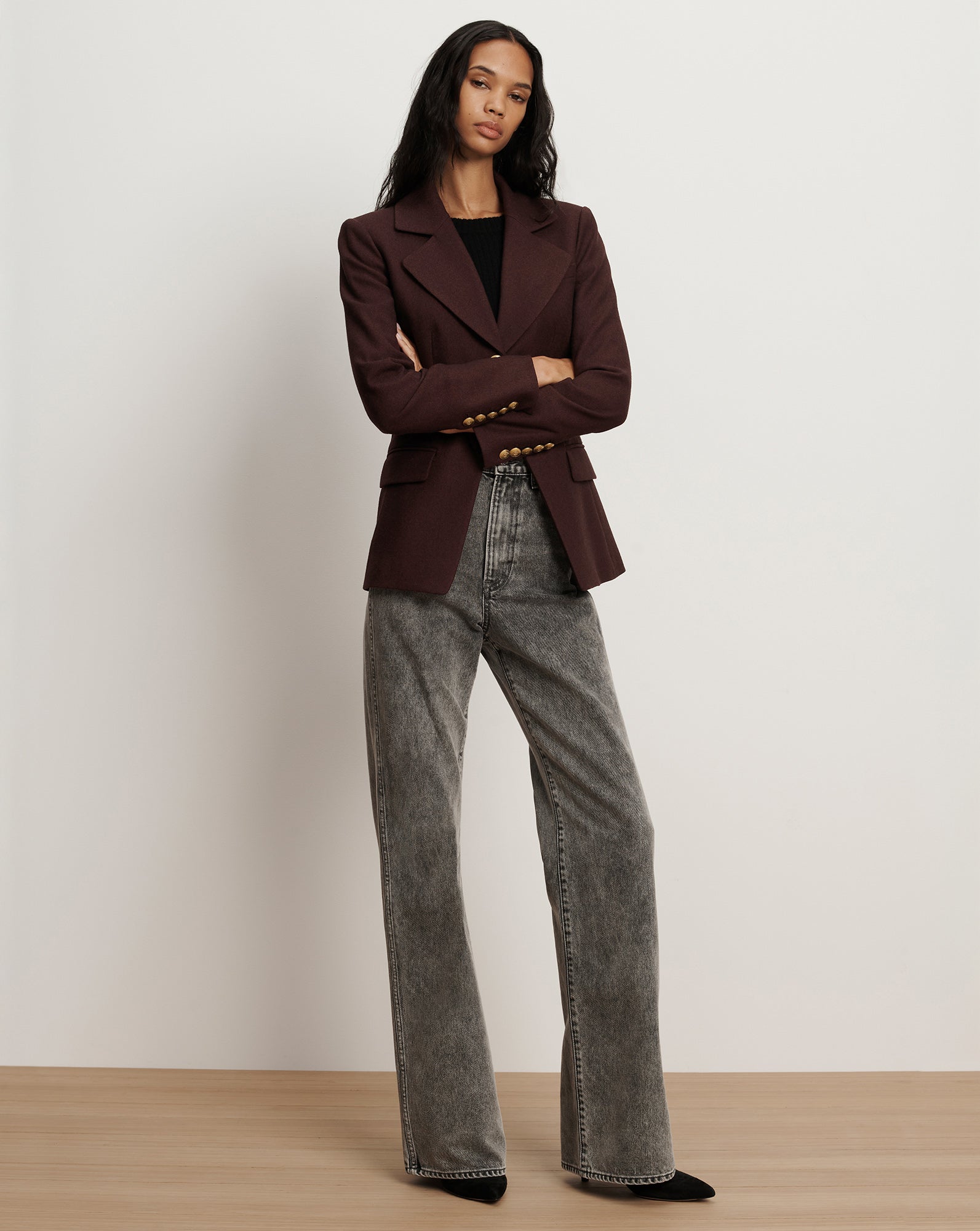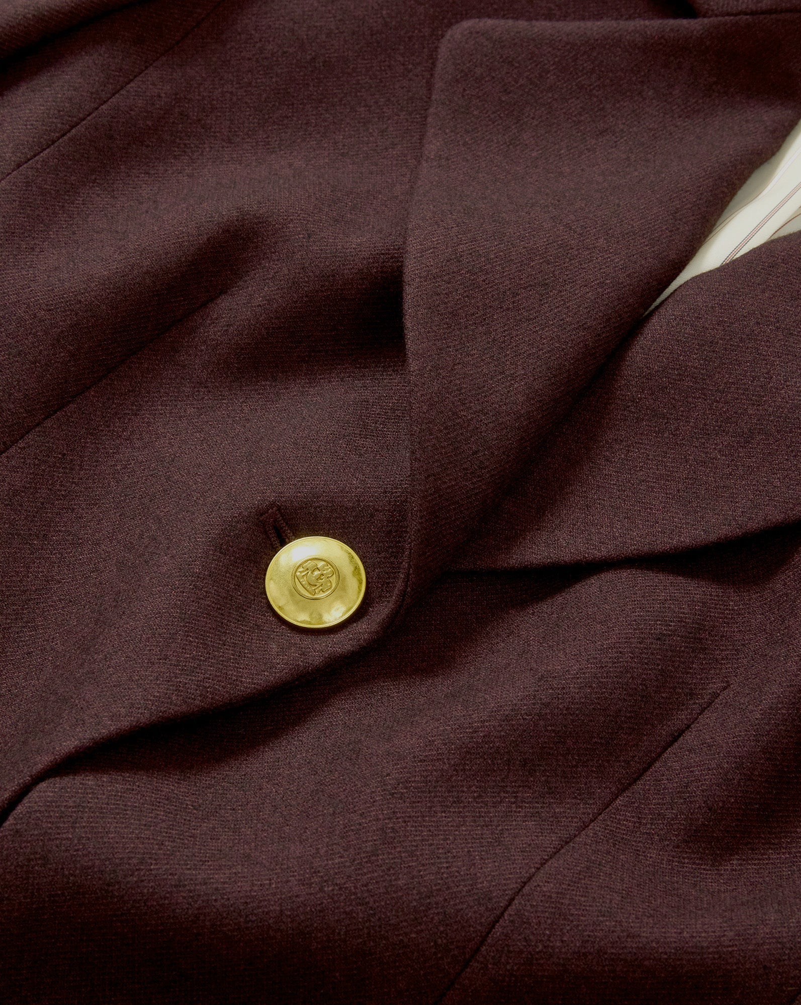 Crafted from a lightweight wool blend in burgundy, the Kessler jacket is expertly tailored for a slim, flattering fit. Side darting and thoughtfully placed flap pockets enhance the shape, while an exaggerated notch lapel adds a subtle vintage touch. Gold buttons at the single-breasted closure and cuffs complete the look. Pair with trousers for the office or jeans for more laid-back moments—then add your favorite dickey to switch up your look.