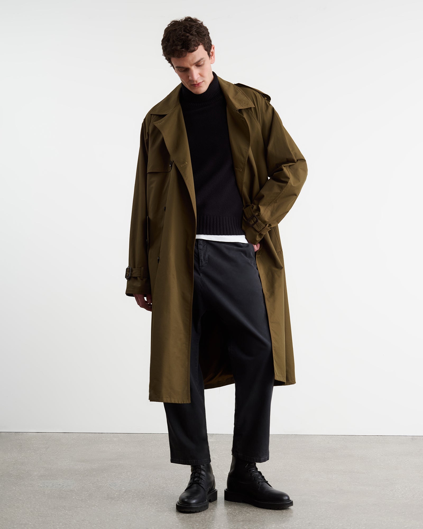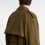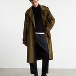 Double breasted relaxed fit trench coat in water-resistant cotton nylon. Self tie belt with buckle closure. Notch collar. Front flap pockets. Interior chest pockets. Center back vent. Adjustable button strap at cuffs. Fully lined.