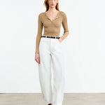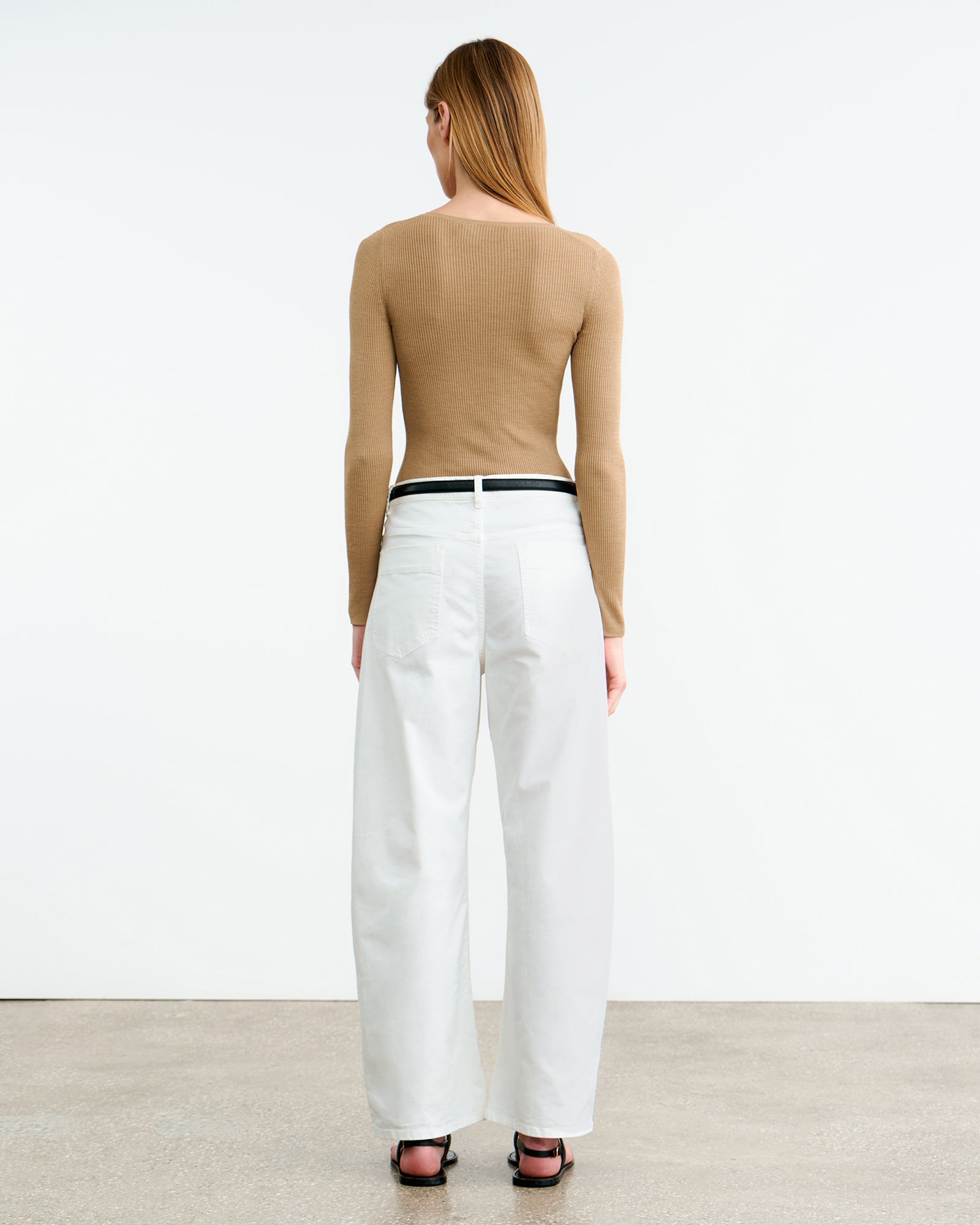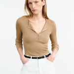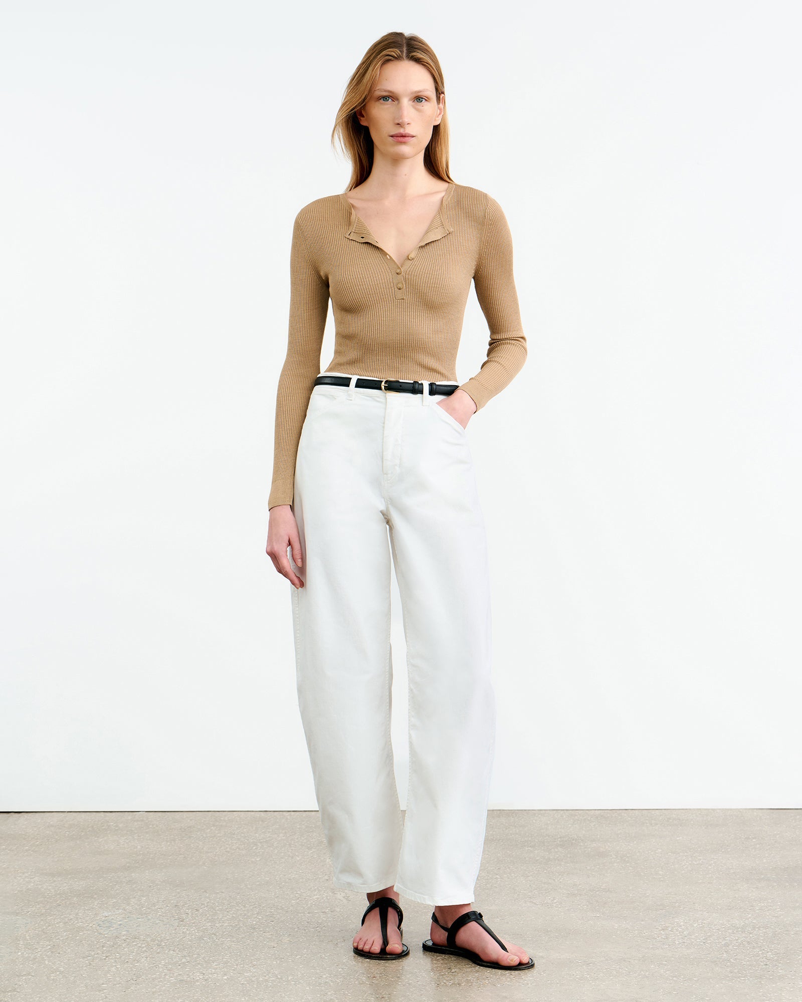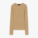 Slim long sleeve double ply compact ribbed henley knit in Italian silk. Logo horn button closure. Single layer rib at neck. Rib start at cuff and hem. Fashioning details at arm hole and shoulder.