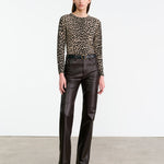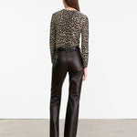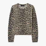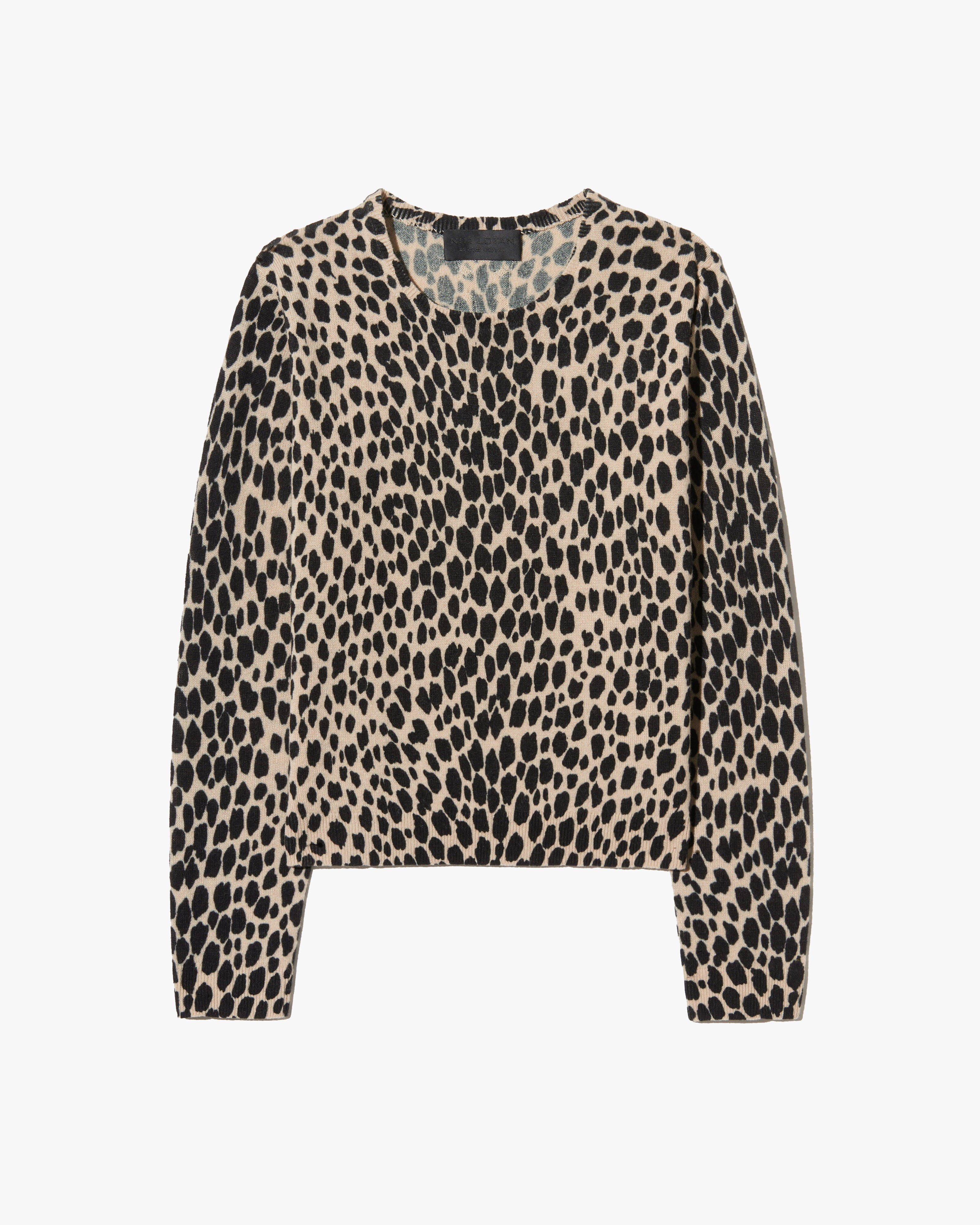 Long sleeve crew neck sweater. Cheetah print. Light weight printed jersey stitch. Shrunken fit. Short length body. Wrist length sleeve. 1x1 rib at hem and sleeve. Rib at neck is doubled and finished by hand on inside of neck to ensure printing is on both side of neck trim. Fashioning details at armhole and shoulder. Signature center back cable knit detail.