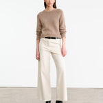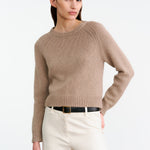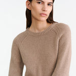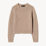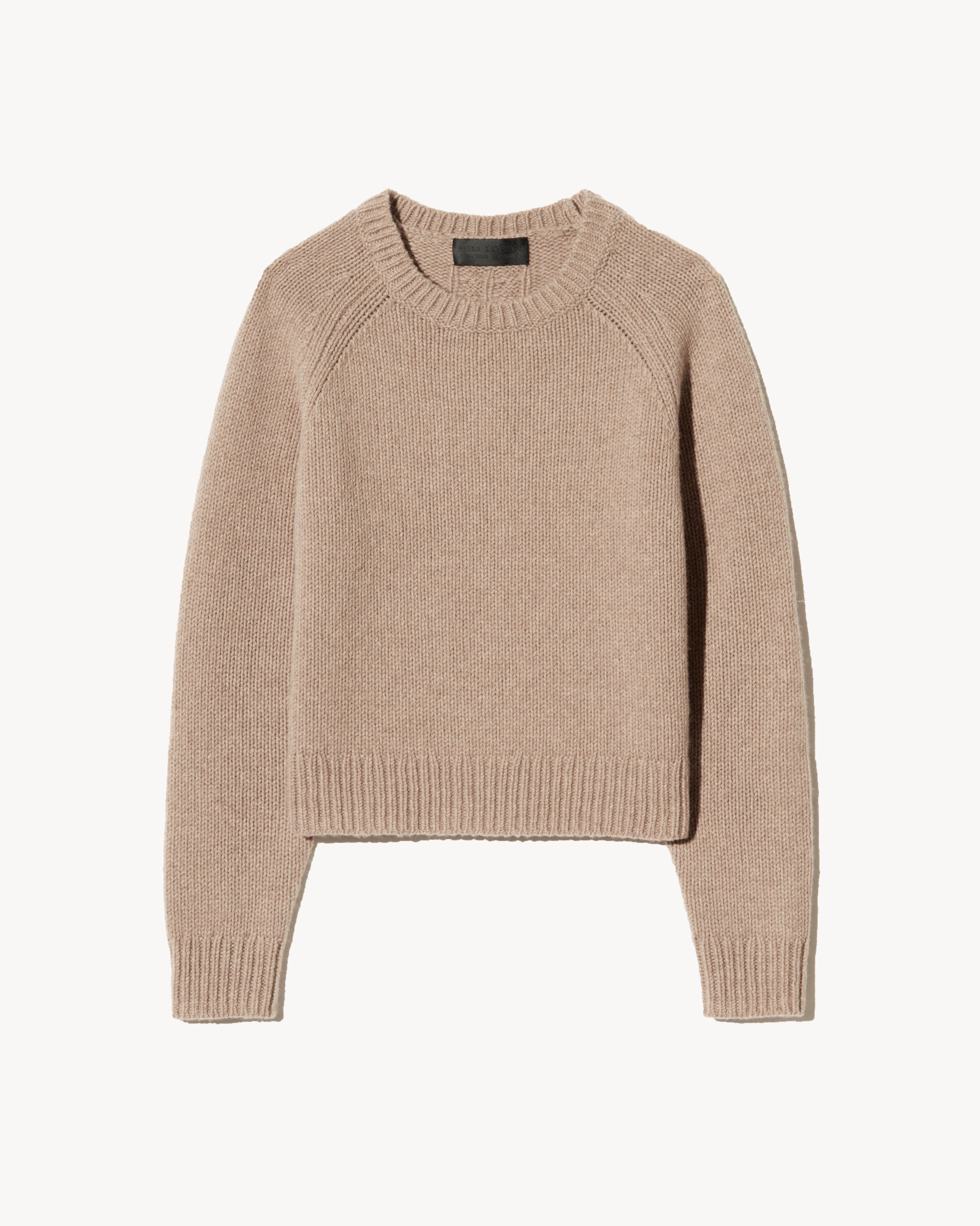 Long sleeve crewneck pullover sweater in a cashmere wool blend. Medium weight in jersey stitch. Shrunken fit. Short length. Regular length raglan sleeve. 1x1 rib at hem and cuff. Neck trim in 1x1 rib. Fashioning at armhole and sleeve. Signature center back cable knit detail.
