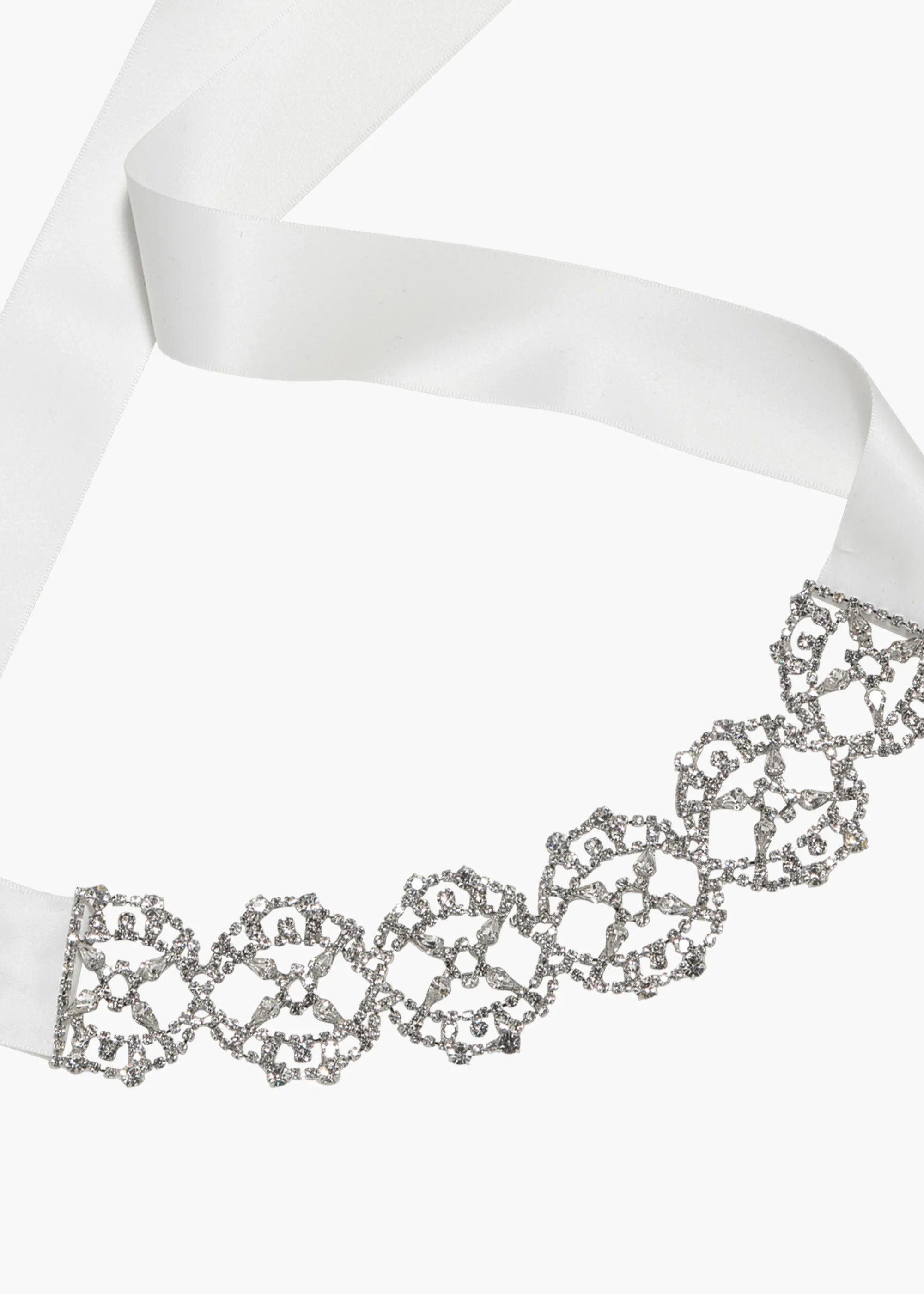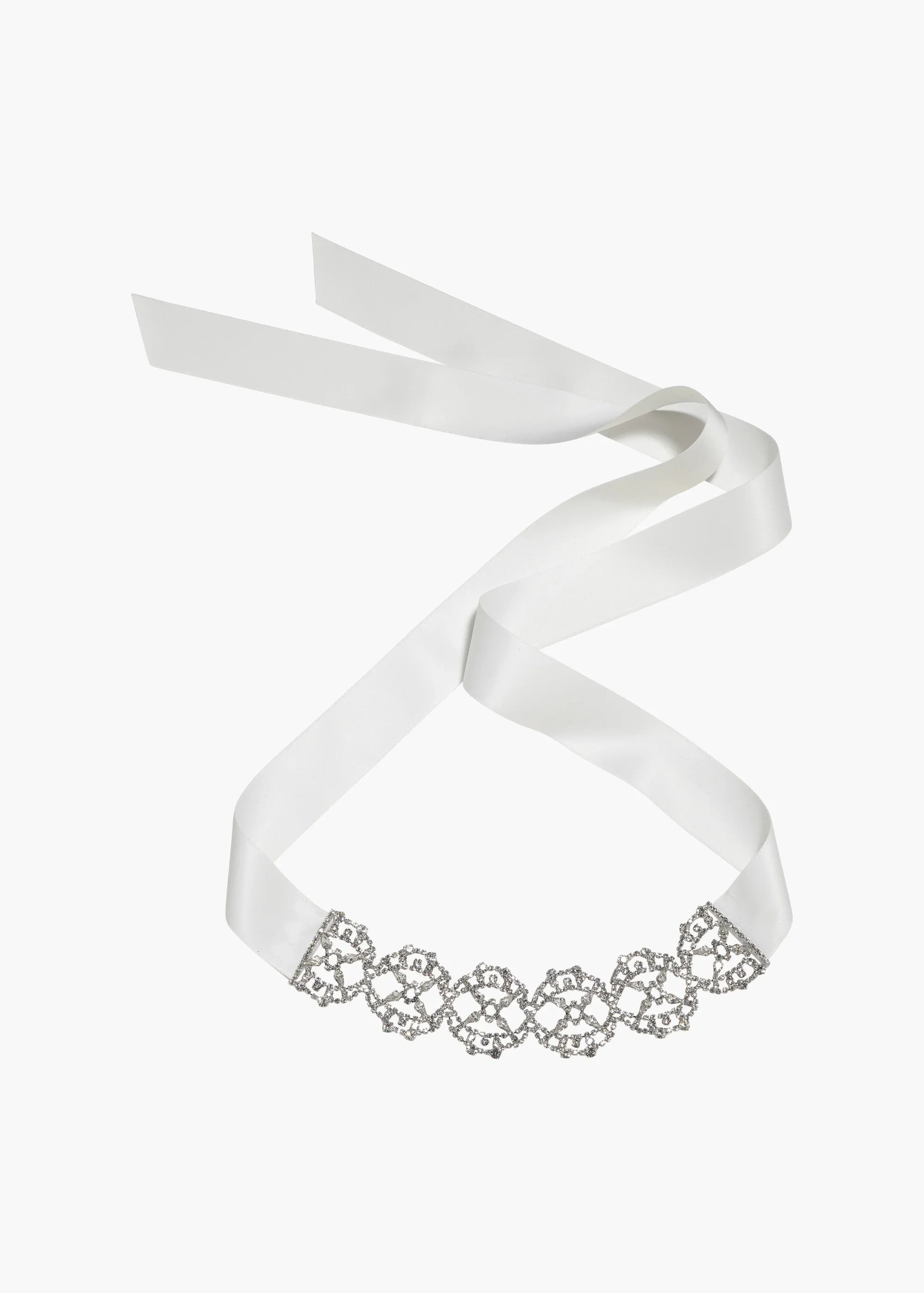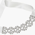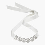 The Lavinia Ribbon Tie draws inspiration from the fabulously ornate collar chokers favored during the Belle Epoque. Like an alluring swath of mesh, the fine Austrian crystal adornment allows the skin to peek through. Made by hand in New York, it ties in the back with silk ribbon, ensuring a precise fit, whether worn as a choker or in the hair. Dimensions: 66 inch length