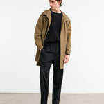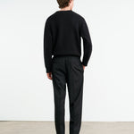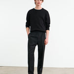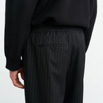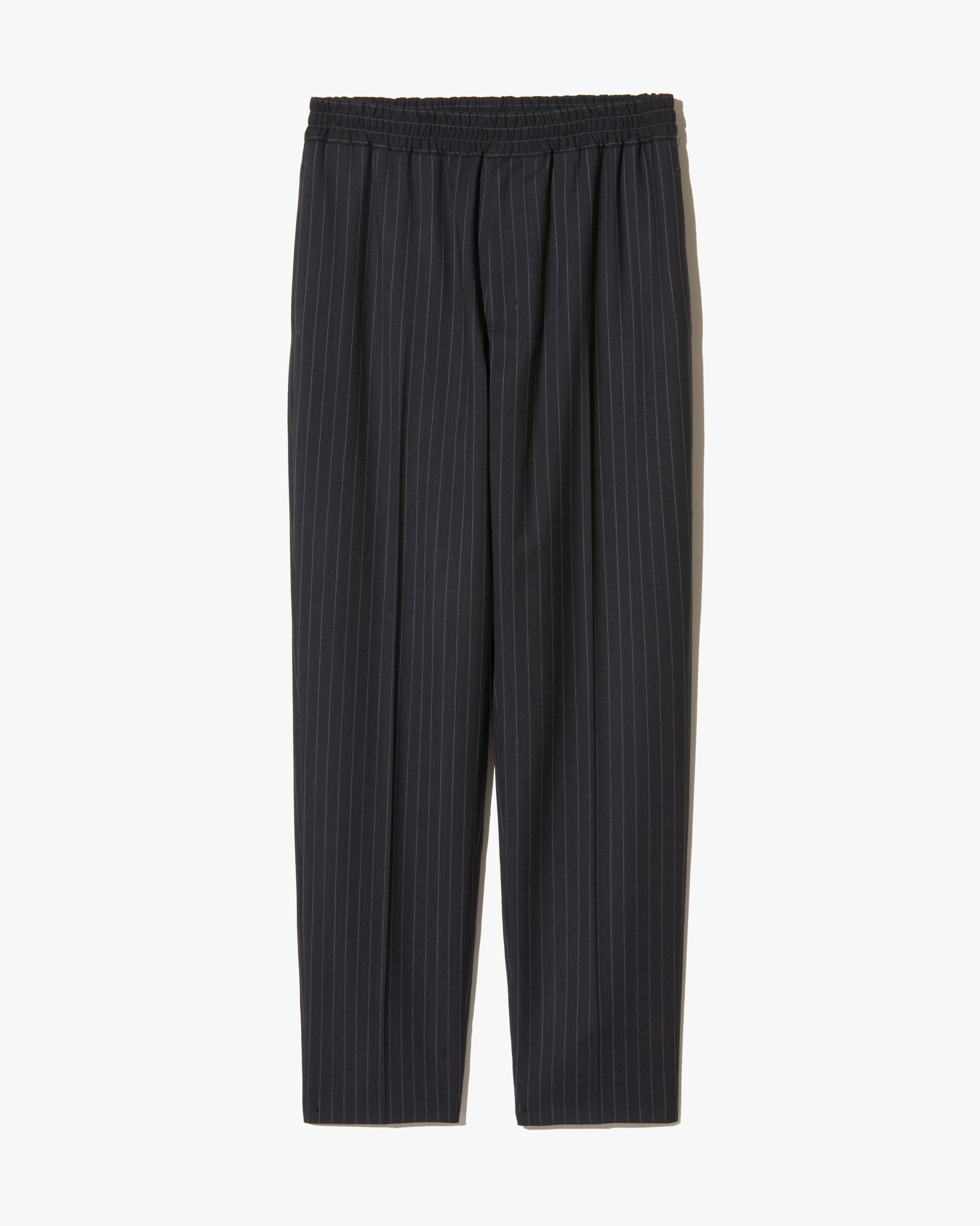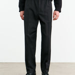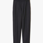 Mid-rise relaxed fit tapered pant. Side slash pockets. Creased detail. Back welt pockets with button closure. Elastic waistband. Zip fly. Interior drawstring.