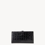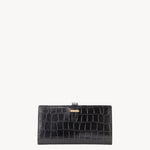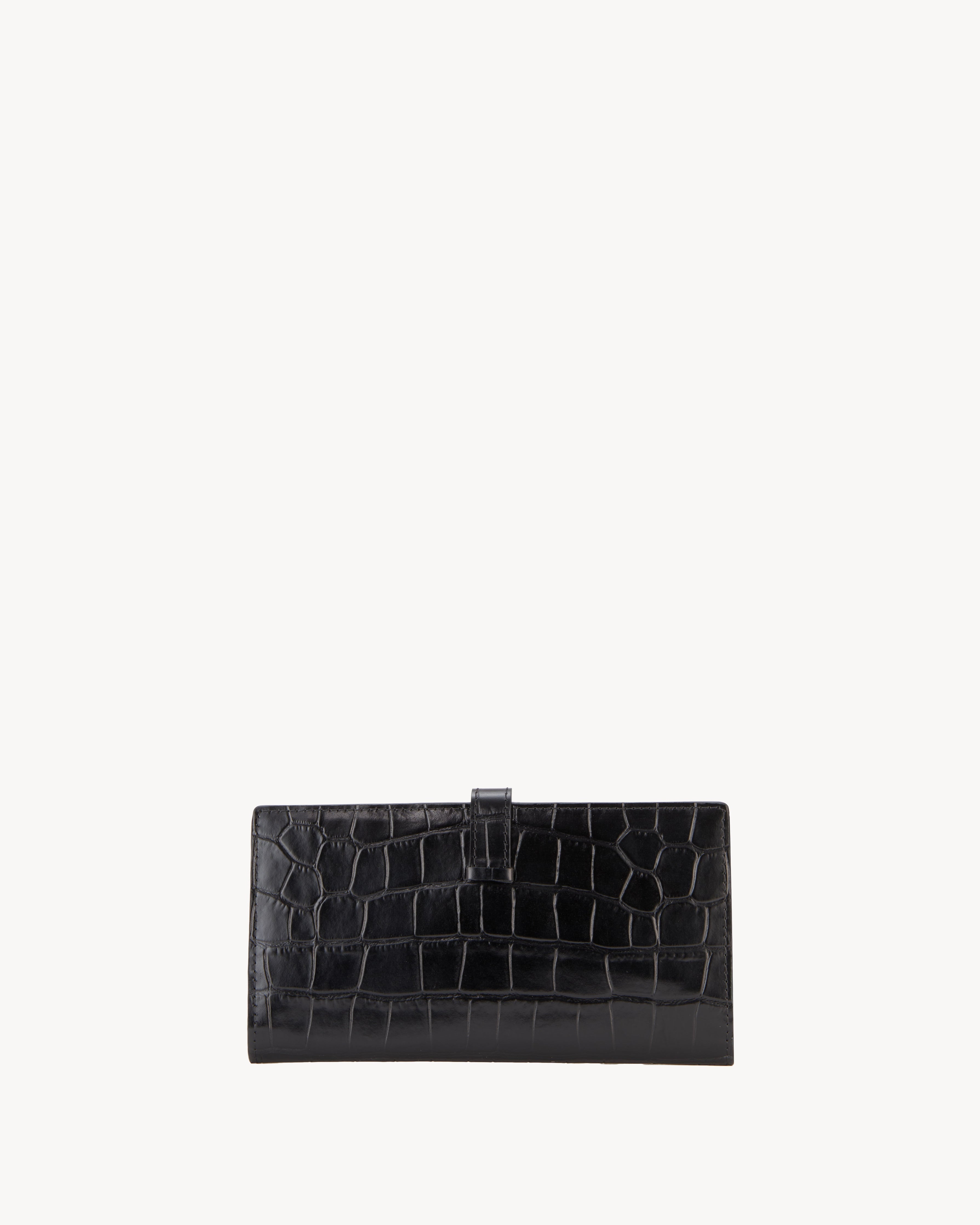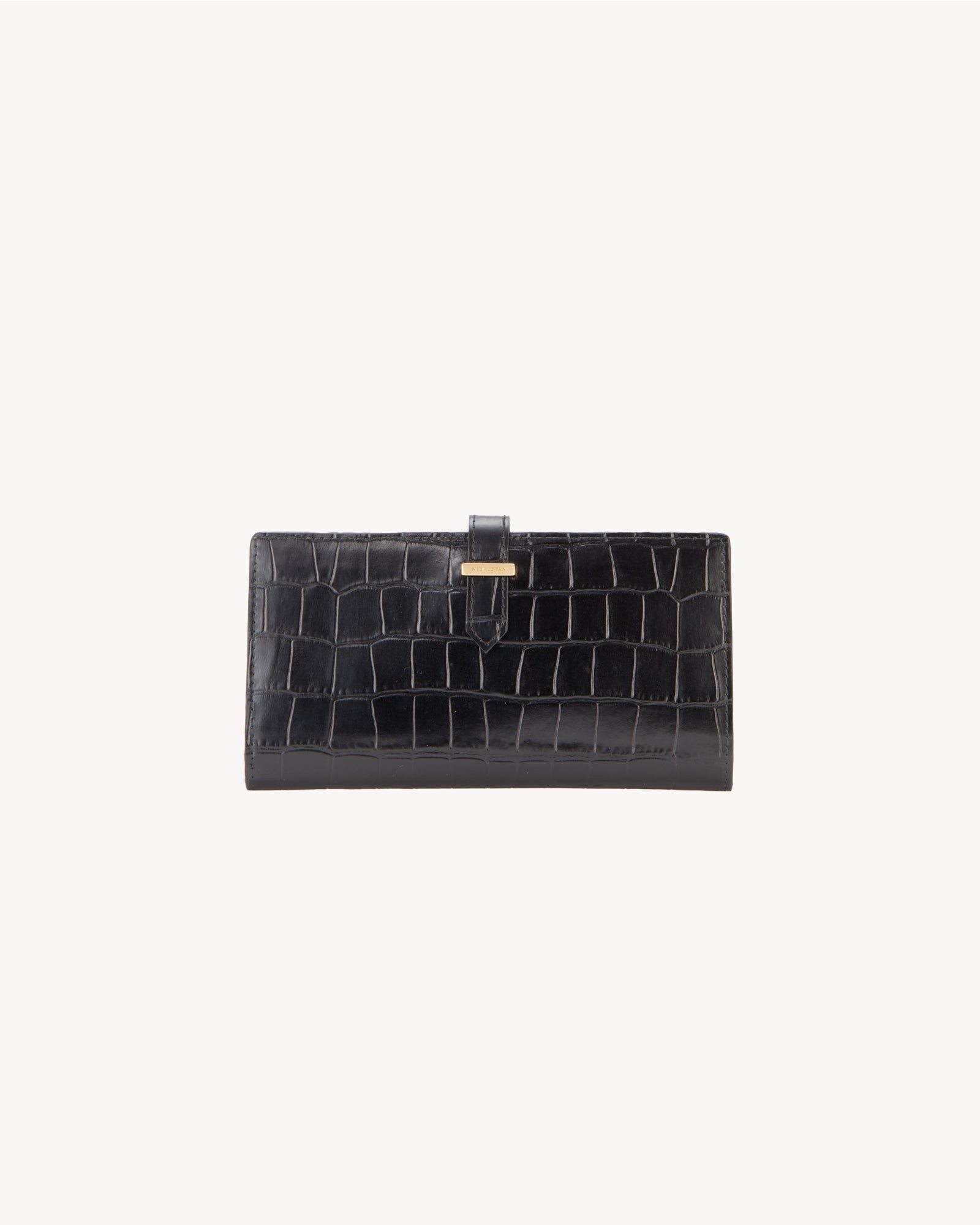 Wallet in Italian embossed calfskin. Crocodile pattern. Interior credit card slots. Interior bill compartments. Leather strap closure. Custom branded clasp hardware in custom antique gold finish.