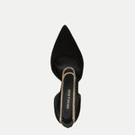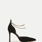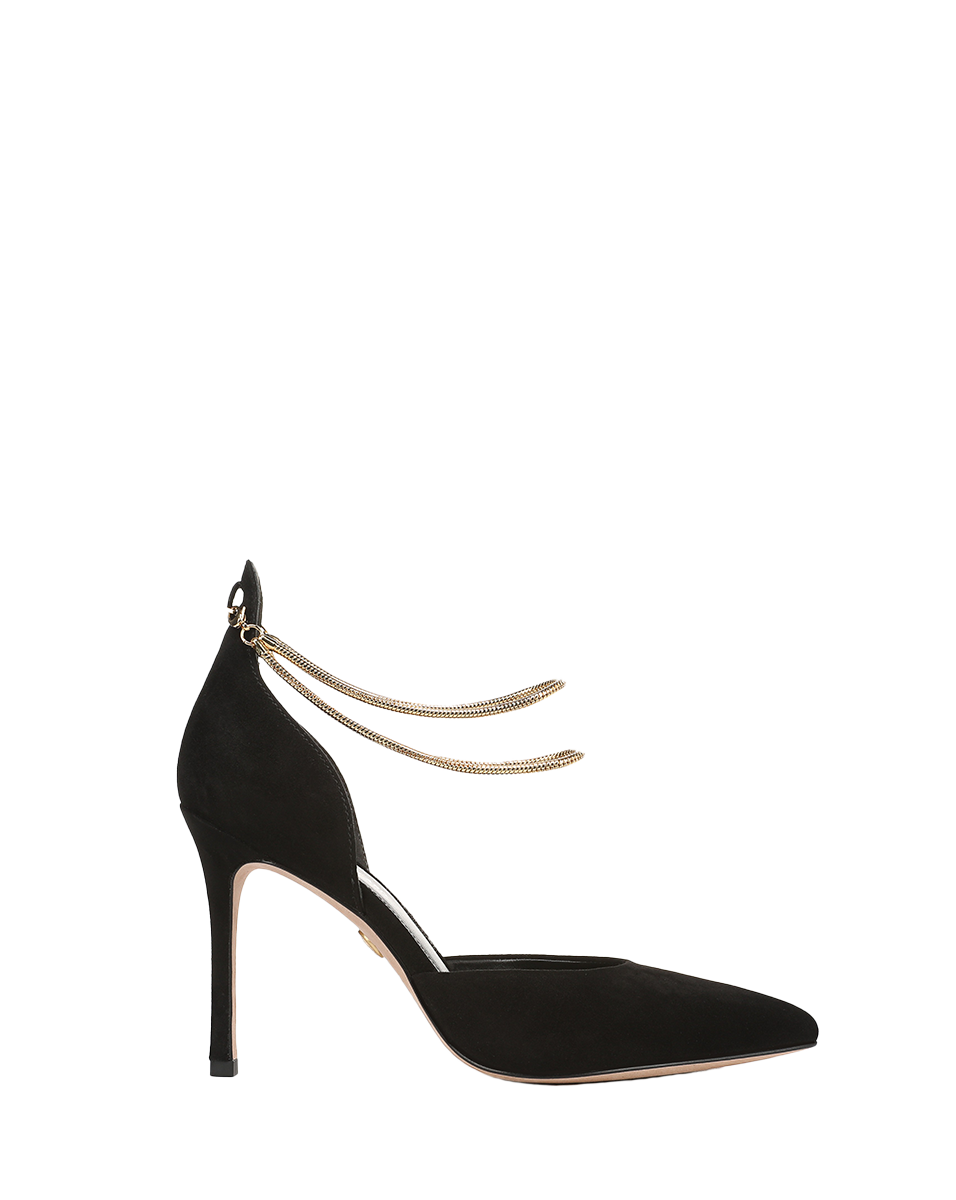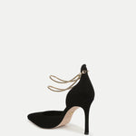 A classic silhouette—with a luxe new detail. Crafted from premium black suede, the Leandra d'Orsay pump features a pointed toe and is set on a tall stiletto heel. Double gold chains wrap around the ankle, adding dimension and glamour. The perfect finishing touch for any evening look, style it with tailored pants, a dress, or a skirt.
