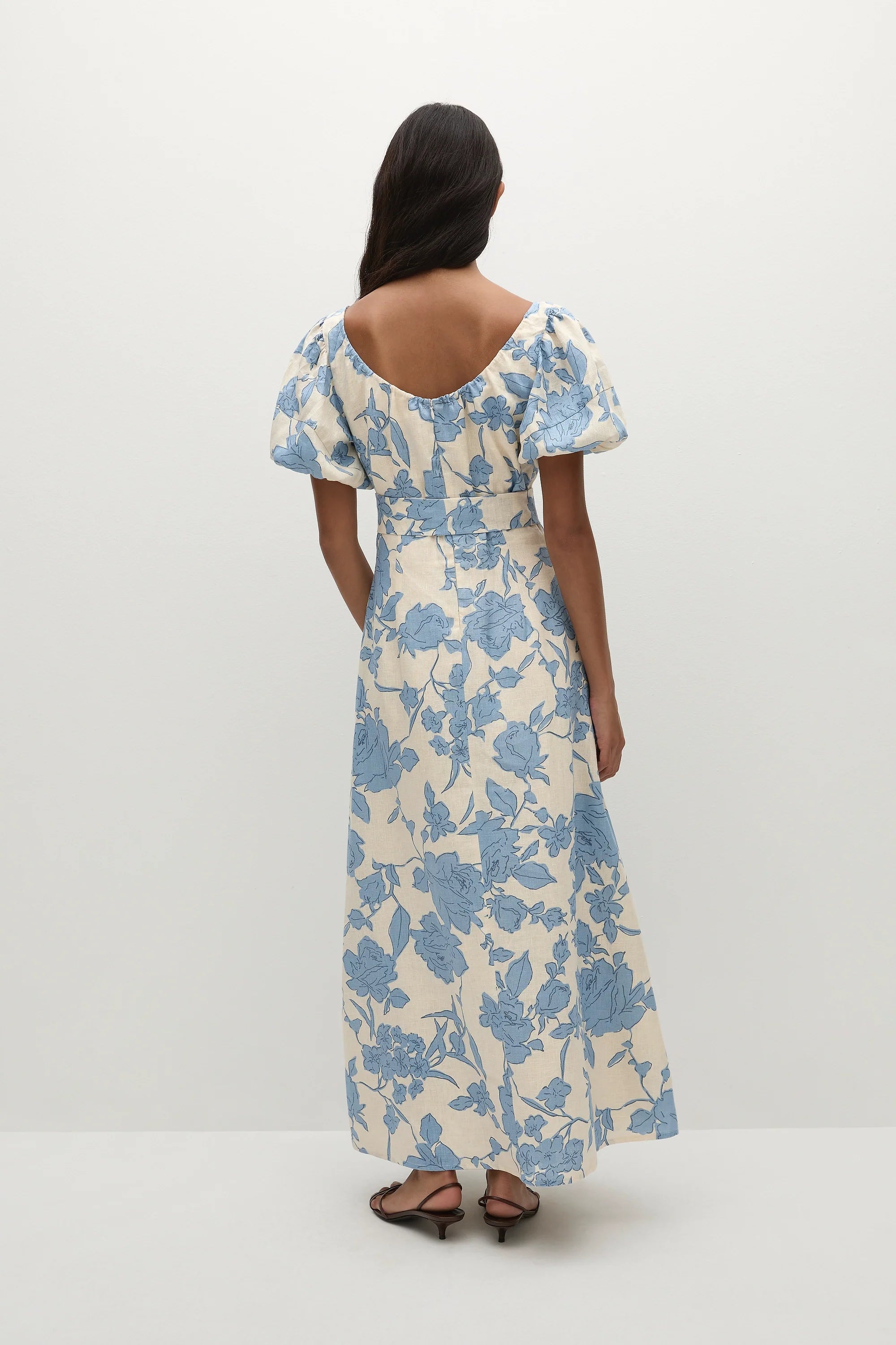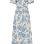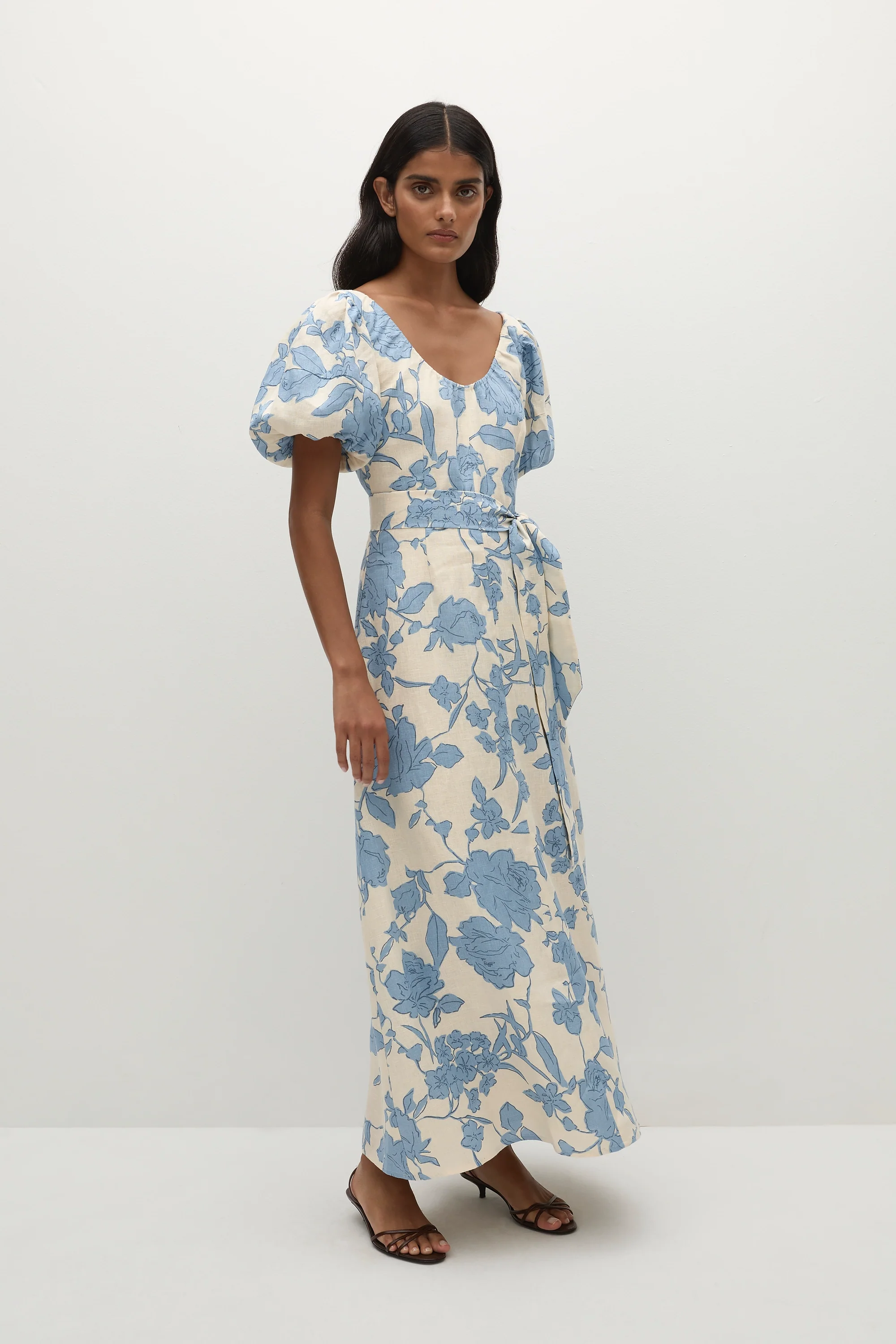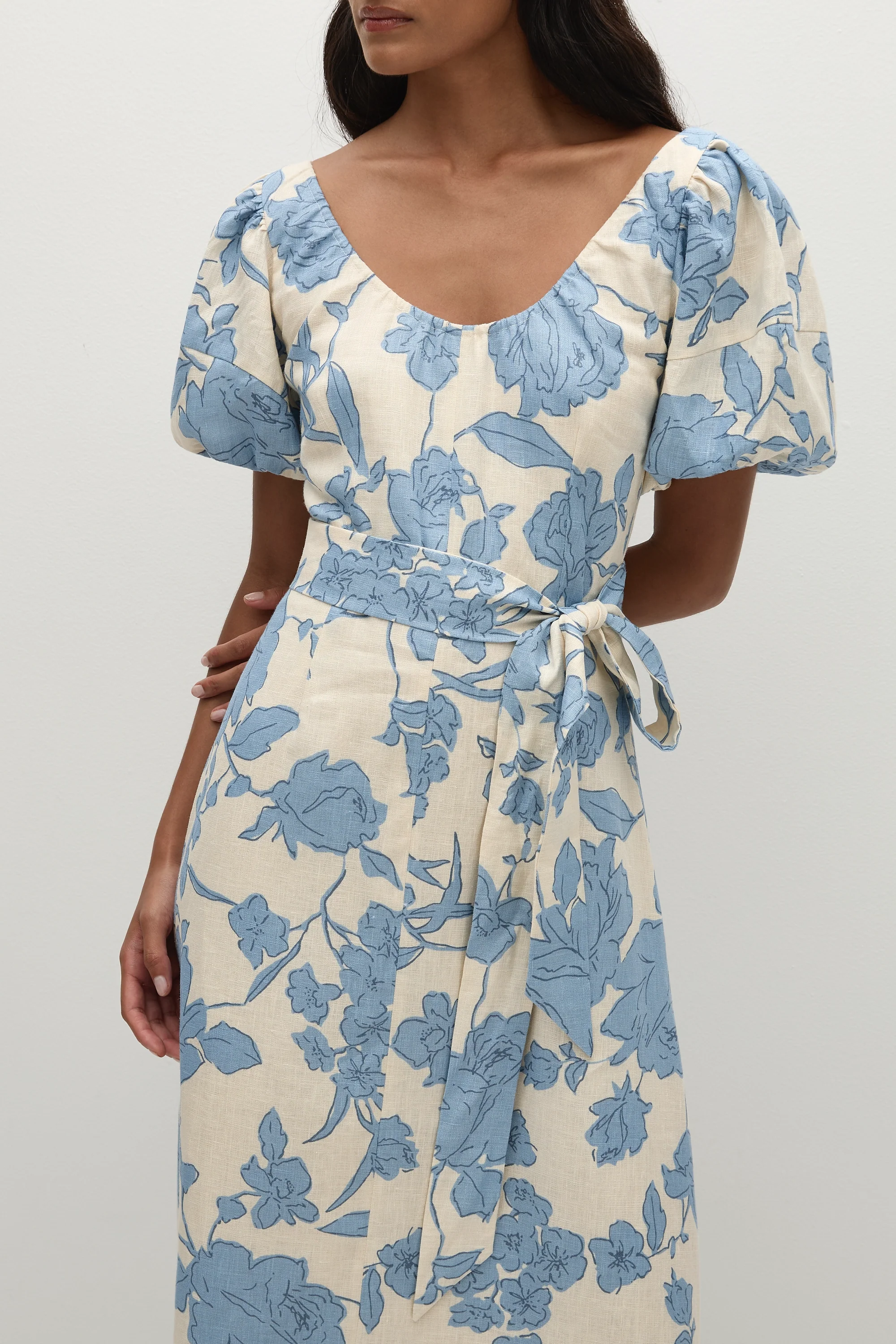 A feminine midi dress with a scoop neckline and oversized rounded sleeves, both elasticated for additional stretch. Semi-fitted through the bodice, it features a tie belt at the waist before falling into a soft A-line skirt that crops around the ankles. Designed from a signature 100% European Flax® linen fabrication in a creamy neutral with a nostalgic blue floral print, style with a kitten heel for day to night wear.