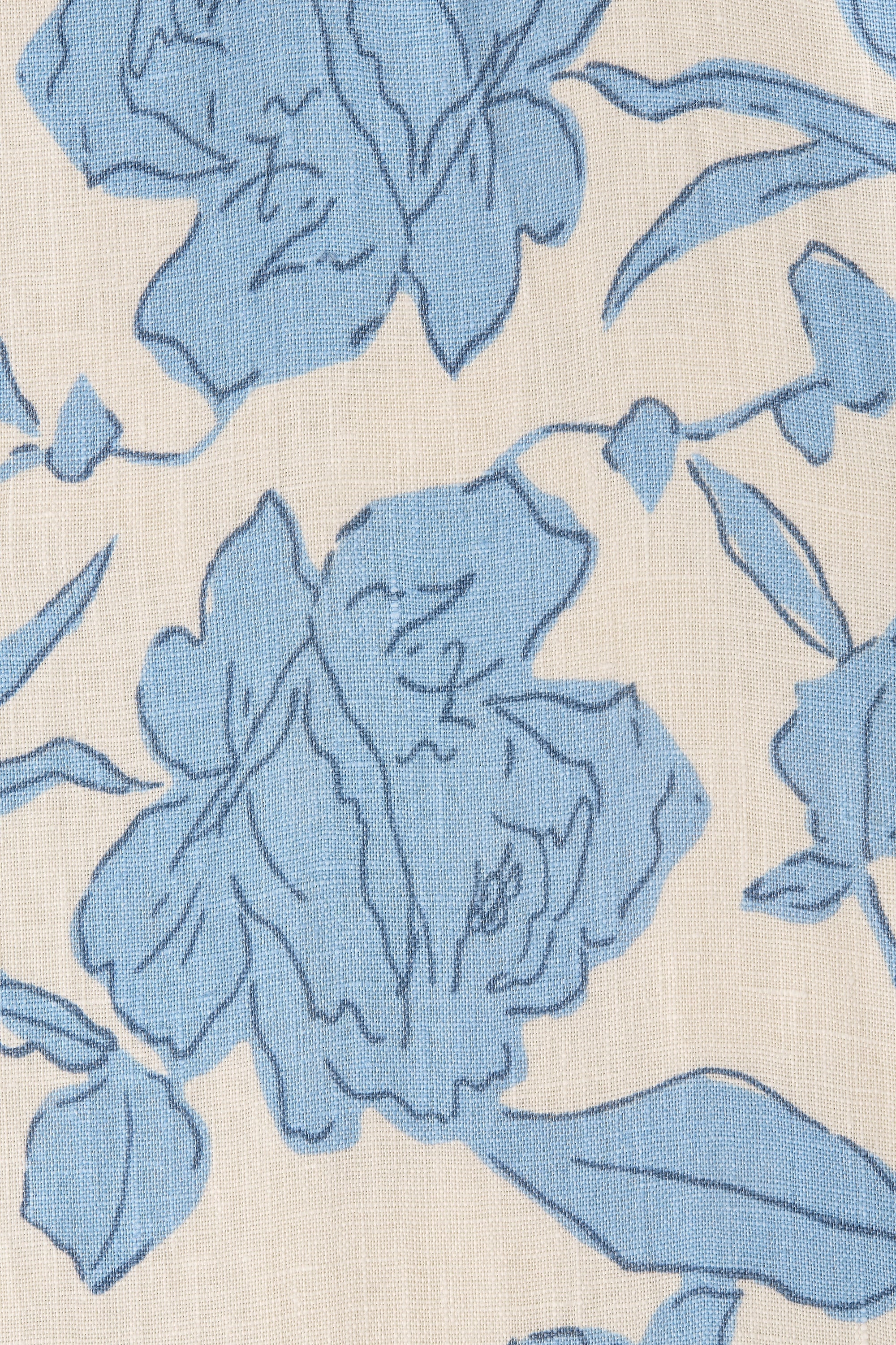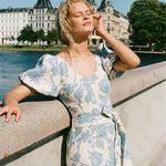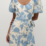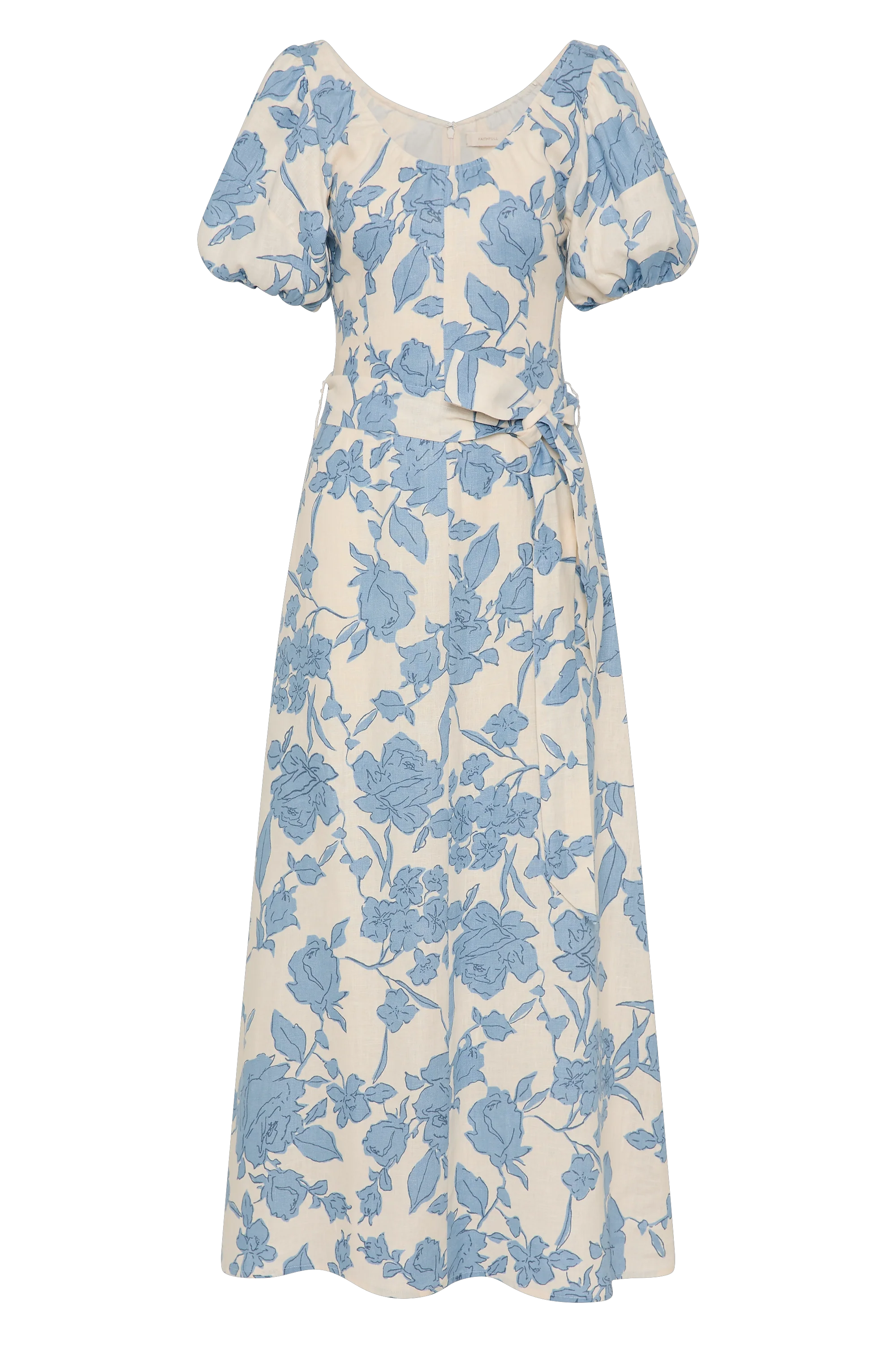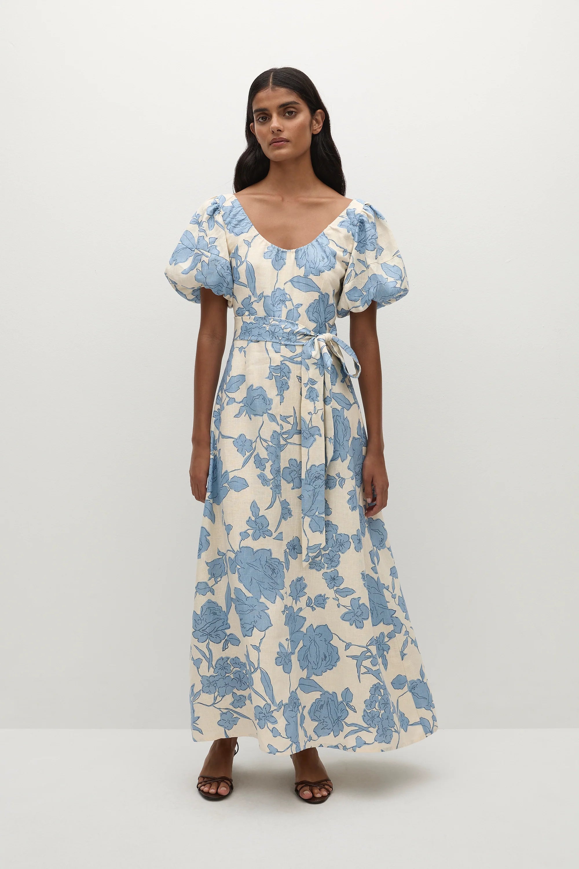A feminine midi dress with a scoop neckline and oversized rounded sleeves, both elasticated for additional stretch. Semi-fitted through the bodice, it features a tie belt at the waist before falling into a soft A-line skirt that crops around the ankles. Designed from a signature 100% European Flax® linen fabrication in a creamy neutral with a nostalgic blue floral print, style with a kitten heel for day to night wear.