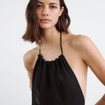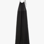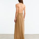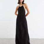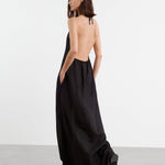 Relaxed floor length halter dress in Japanese featherweight linen. Self tie halter neck. Adjustable neck for desired coverage. Low scoop back. Elastic at back. Side seam pockets.