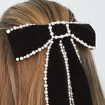 A pearlescent border transforms a simple velvet bow into a resplendent finishing touch—that’s the beauty of the Lenox Bow Barrette. The Czech crystal pearls are meticulously hand embroidered onto the ribbon in our New York studio, and it's all mounted on a French barrette closure that makes it easy to wear a multitude of ways: in the back of the hair, swept to the side, above a ponytail, and more.